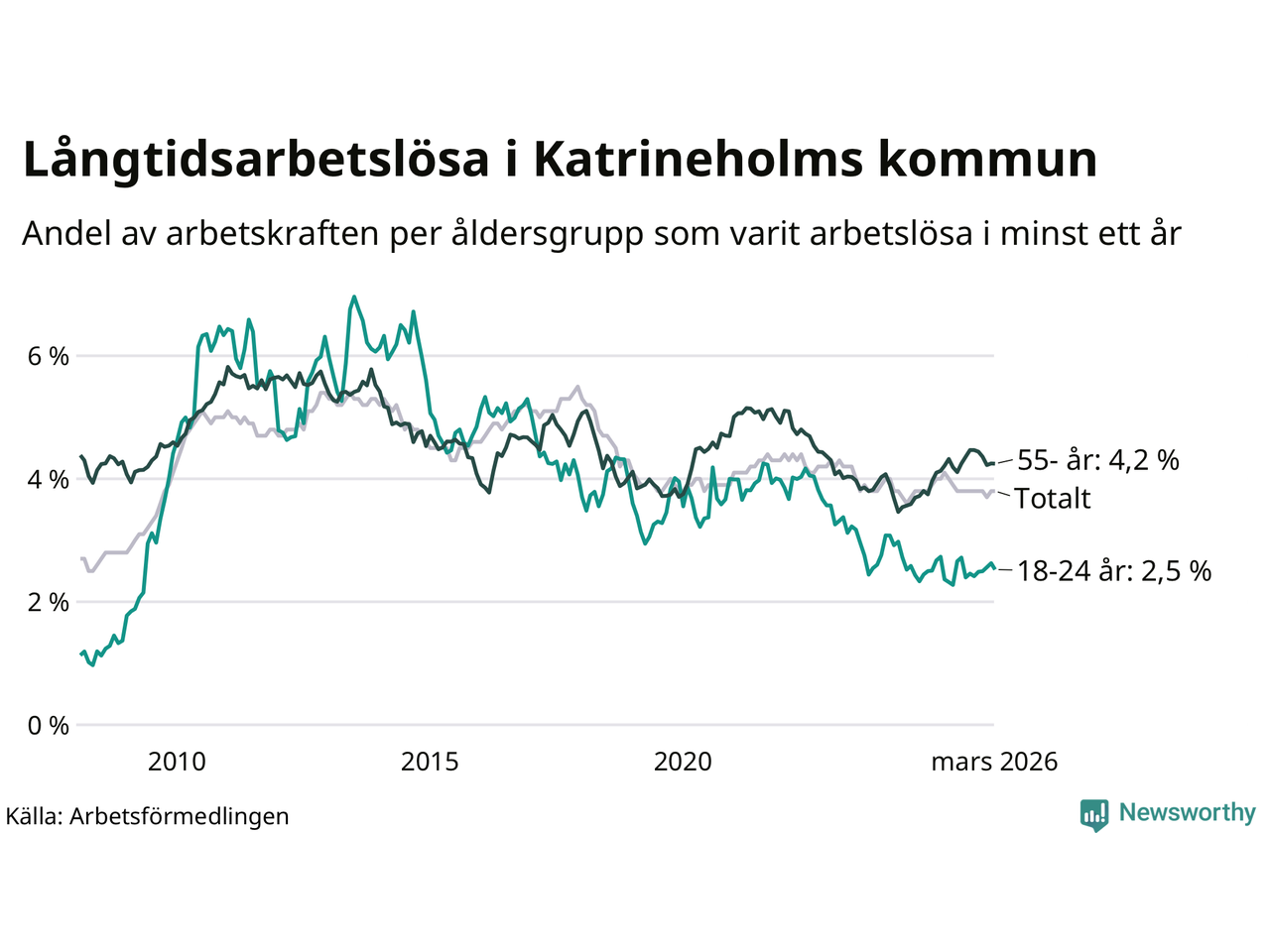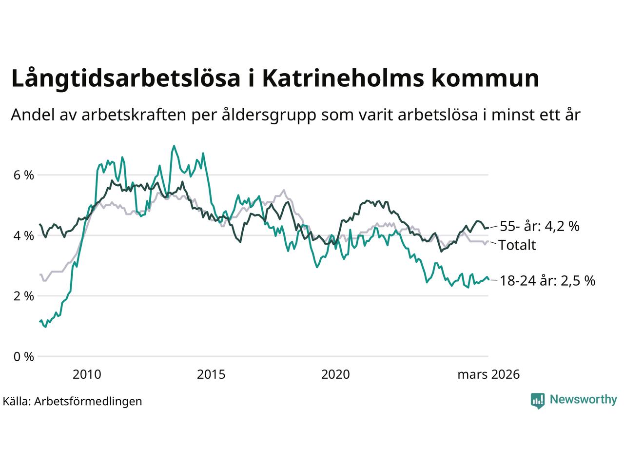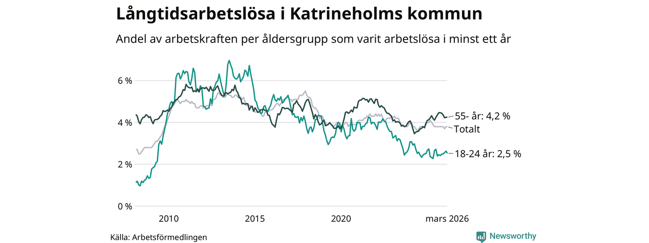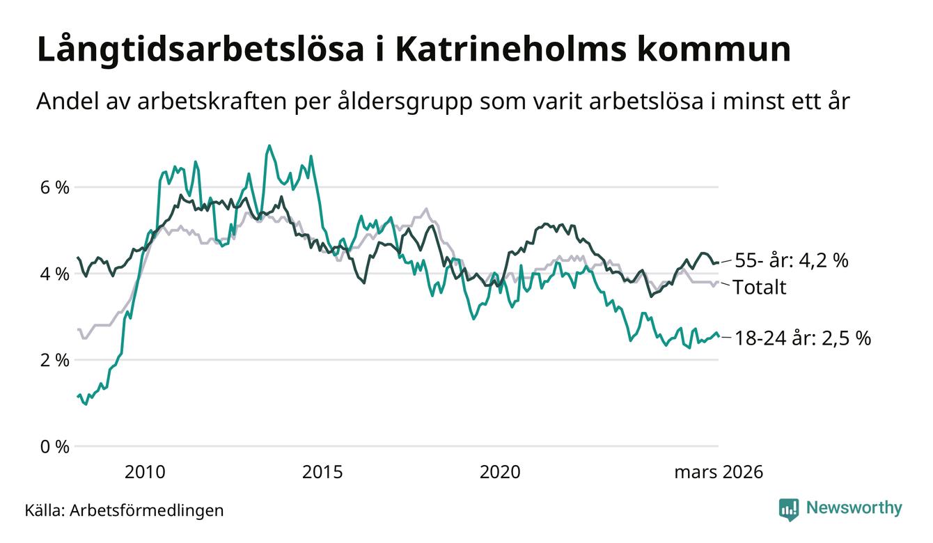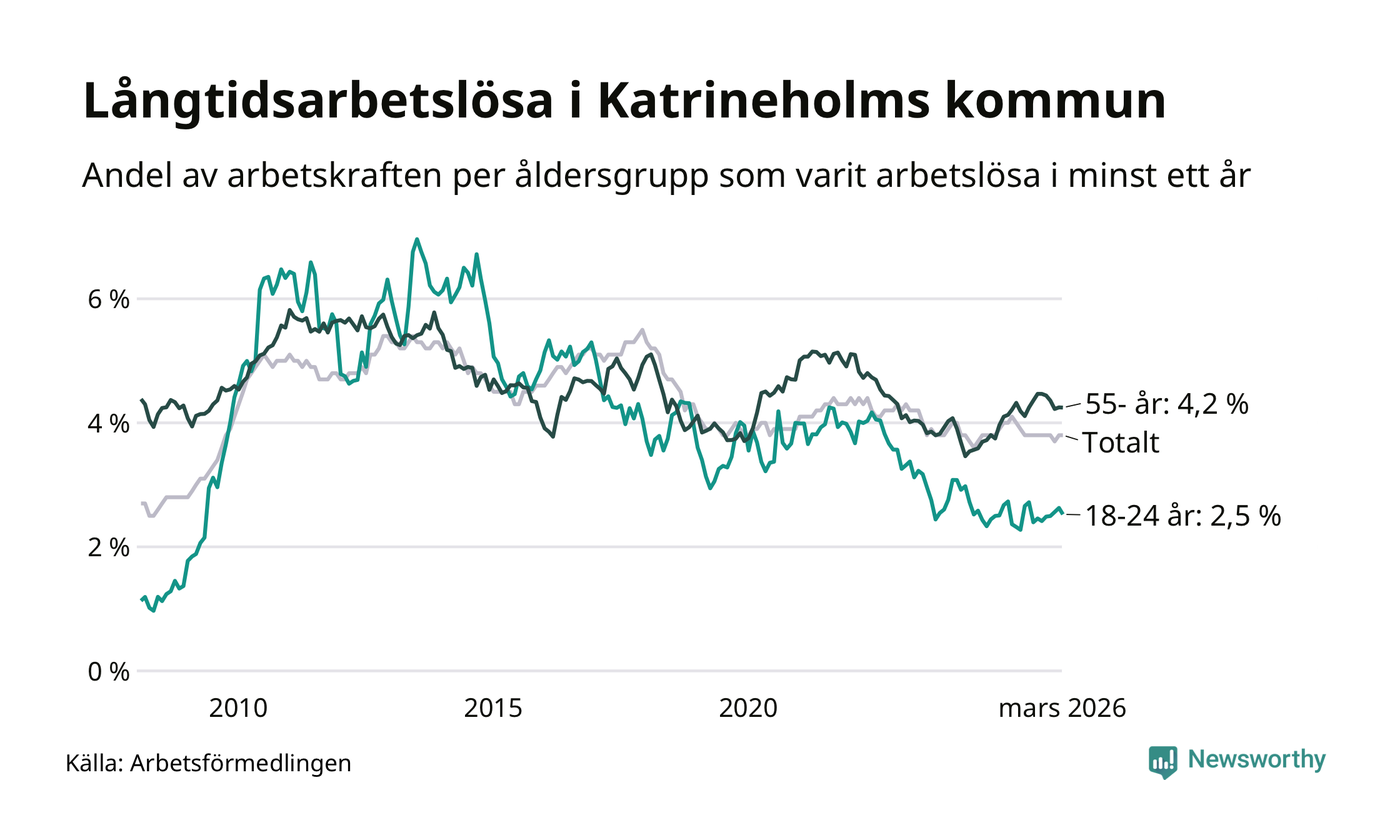 Av de 606 personerna som varit arbetslösa i mer än ett år i Katrineholms kommun är 157 personer mellan 55 och 661 år och 45 är mellan 18 och 24 år. För den äldre gruppen är andelen arbetslösa 4,2 procent medan den i den yngre gruppen är 2,5 procent. Även i riket som helhet är långtidsarbetslösheten högre i gruppen äldre.