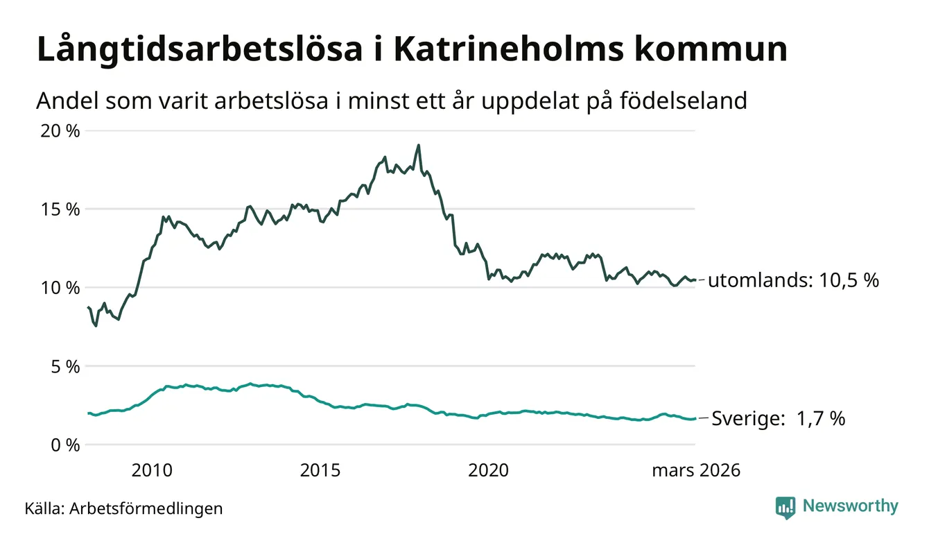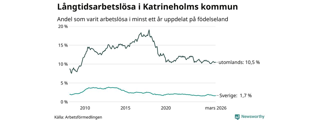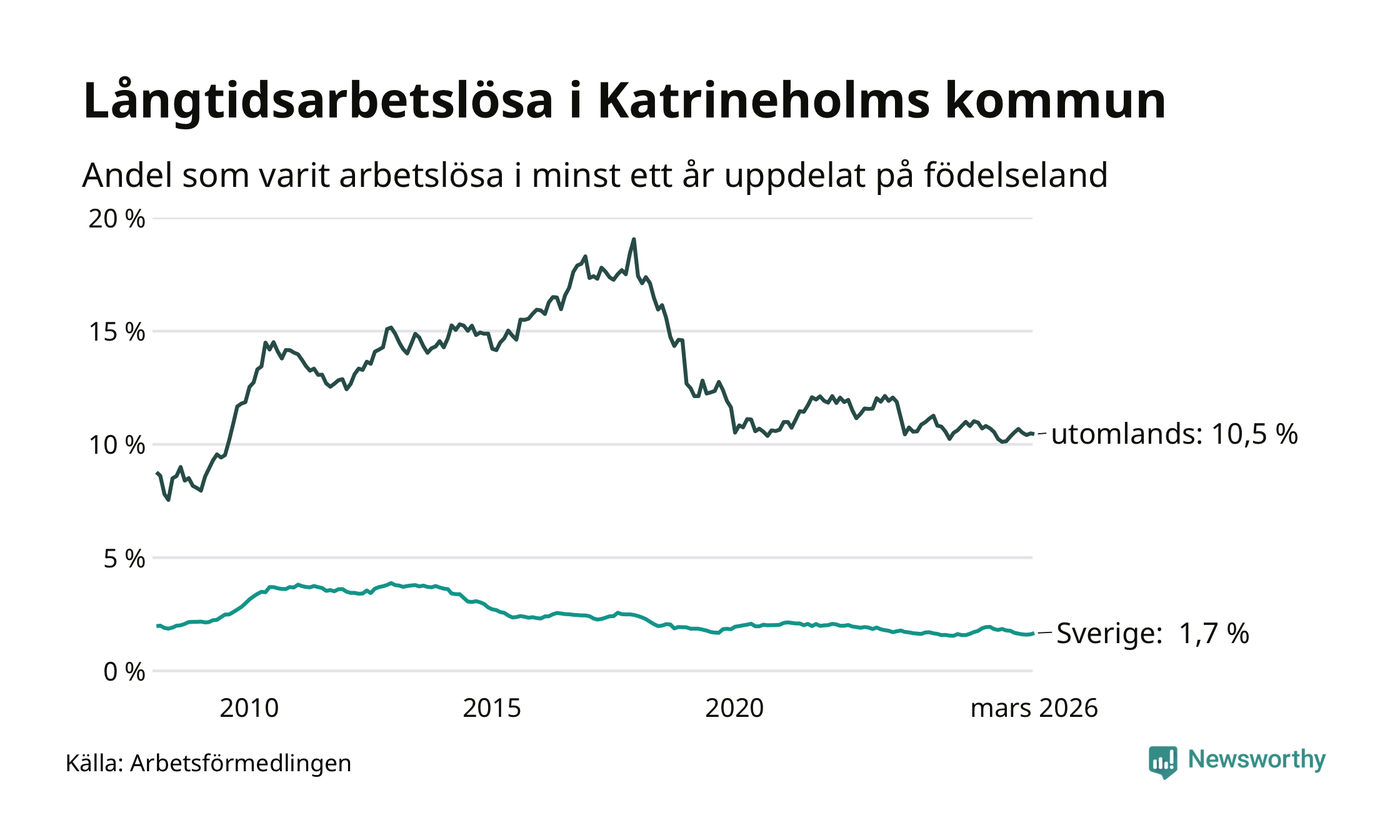 202 av de långtidsarbetslösa i Katrineholm är födda i Sverige, medan 404 är födda utomlands. Det innebär att långtidsarbetslösheten bland Sverigefödda är 1,7 procent, medan den är sex gånger så hög – 10,5 procent – bland födda utomlands. Även i riket som helhet är arbetslösheten högre bland utrikesfödda.