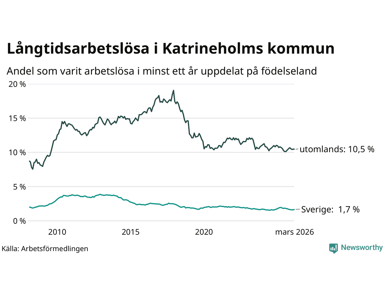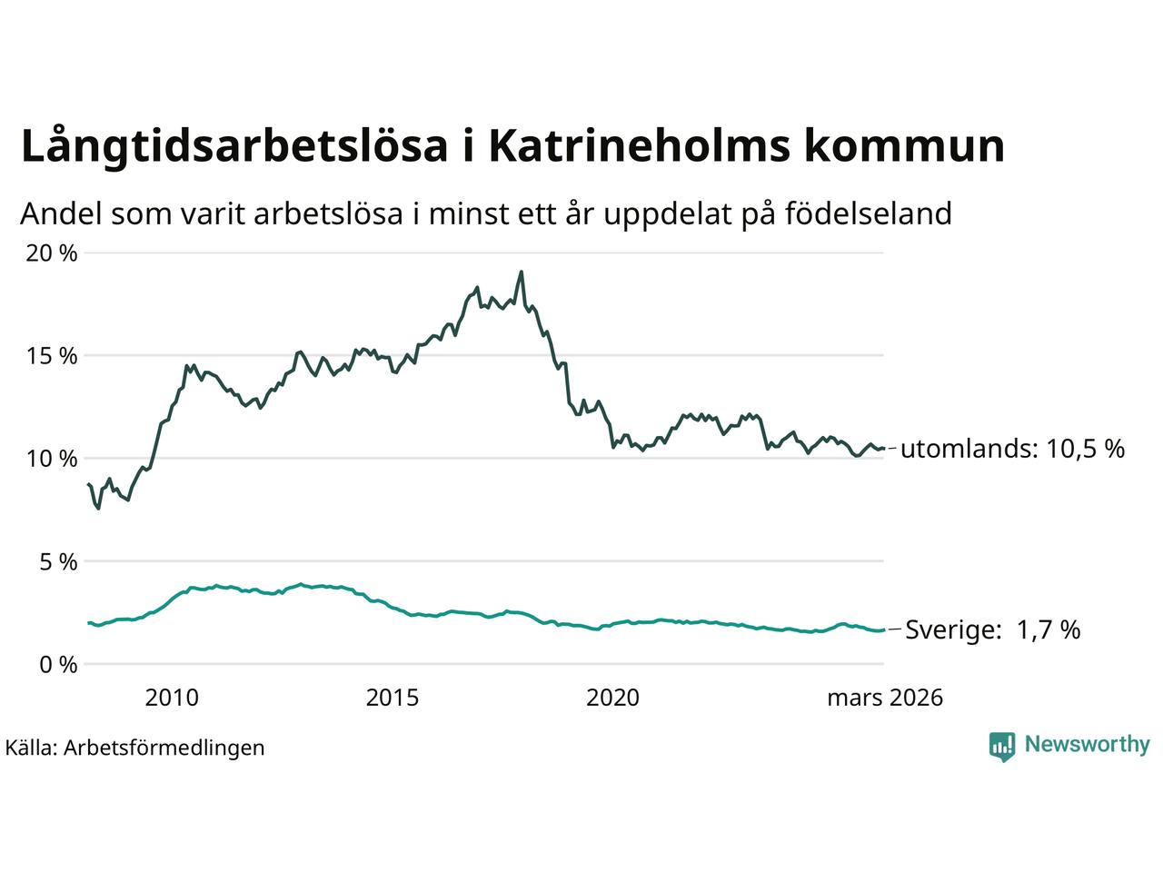 Graf: Andel arbetslösa uppdelat på födelseland i Katrineholm