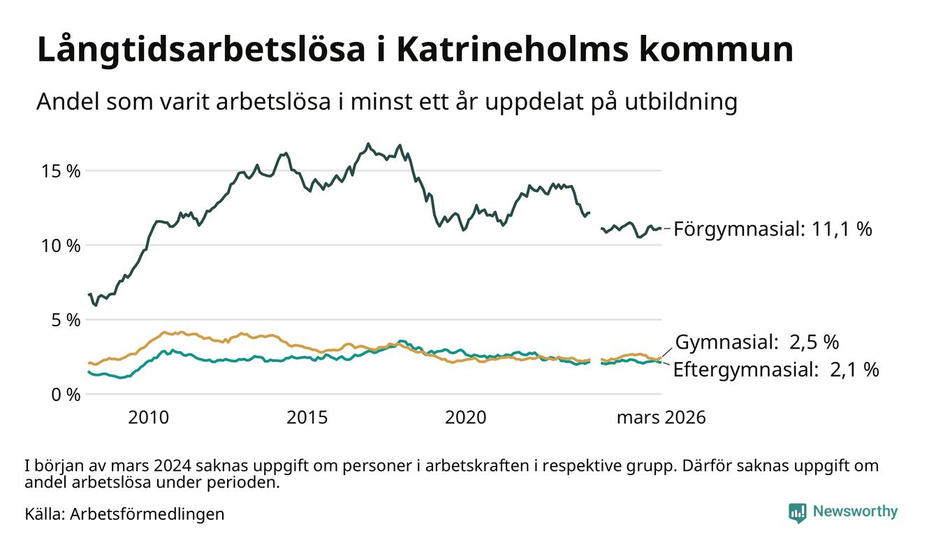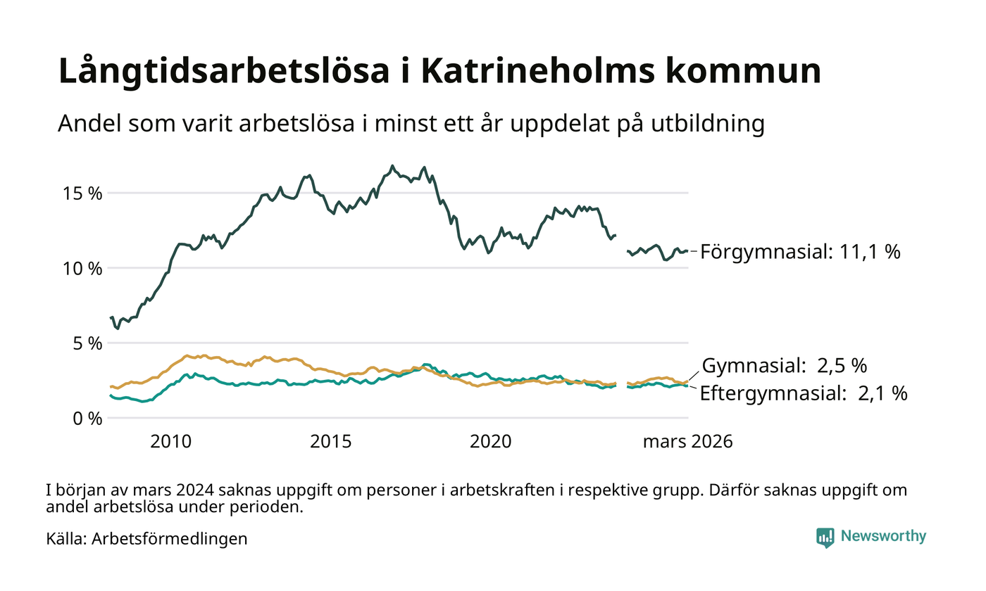 Graf över andel långtidsarbetslösa i Katrineholm uppdelat på utbildningsnivå