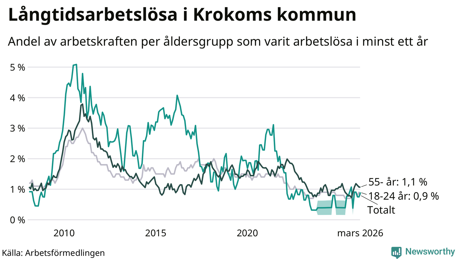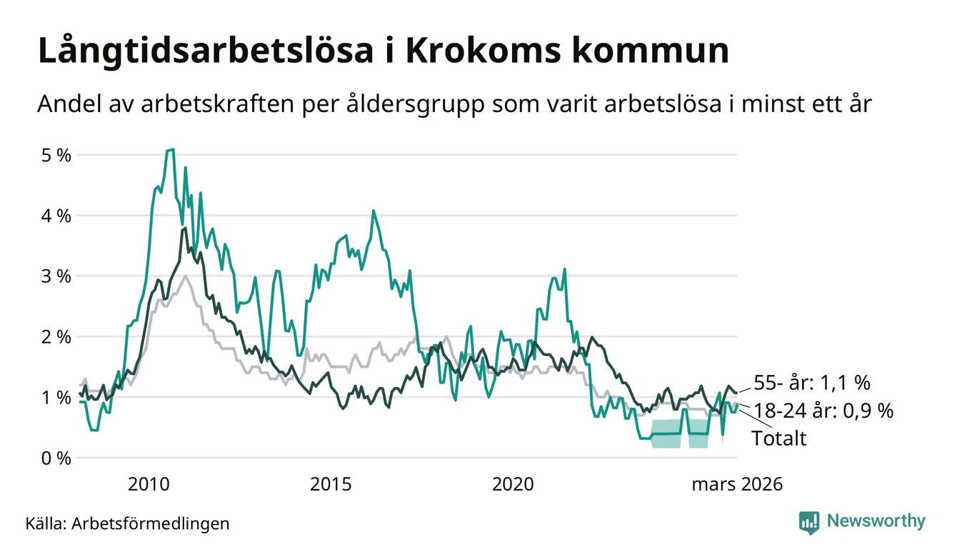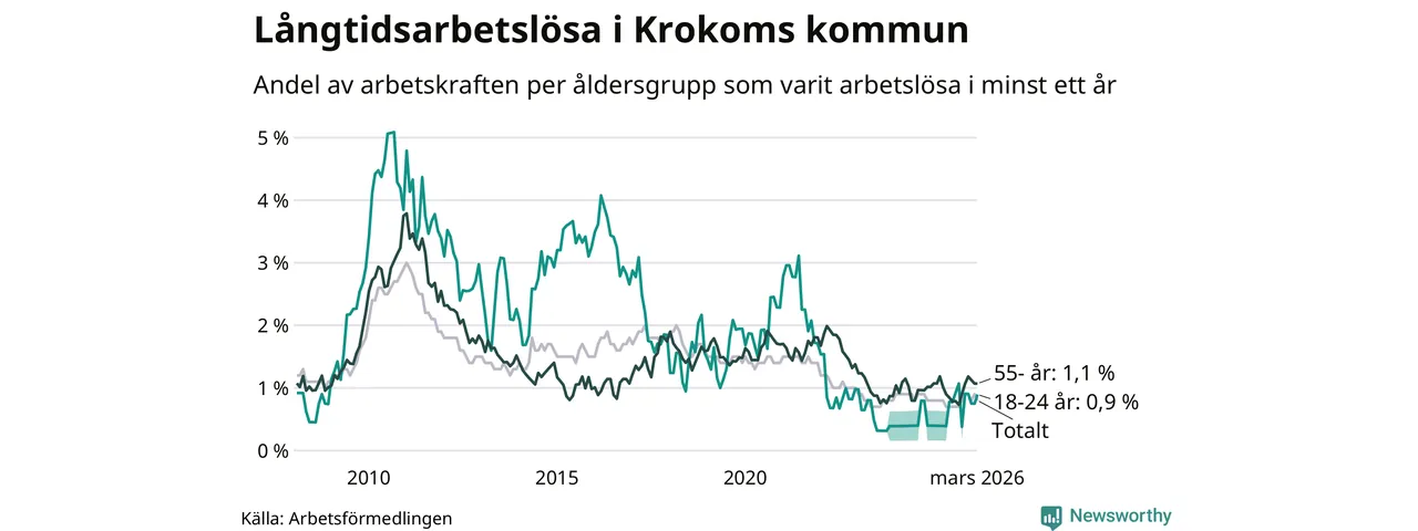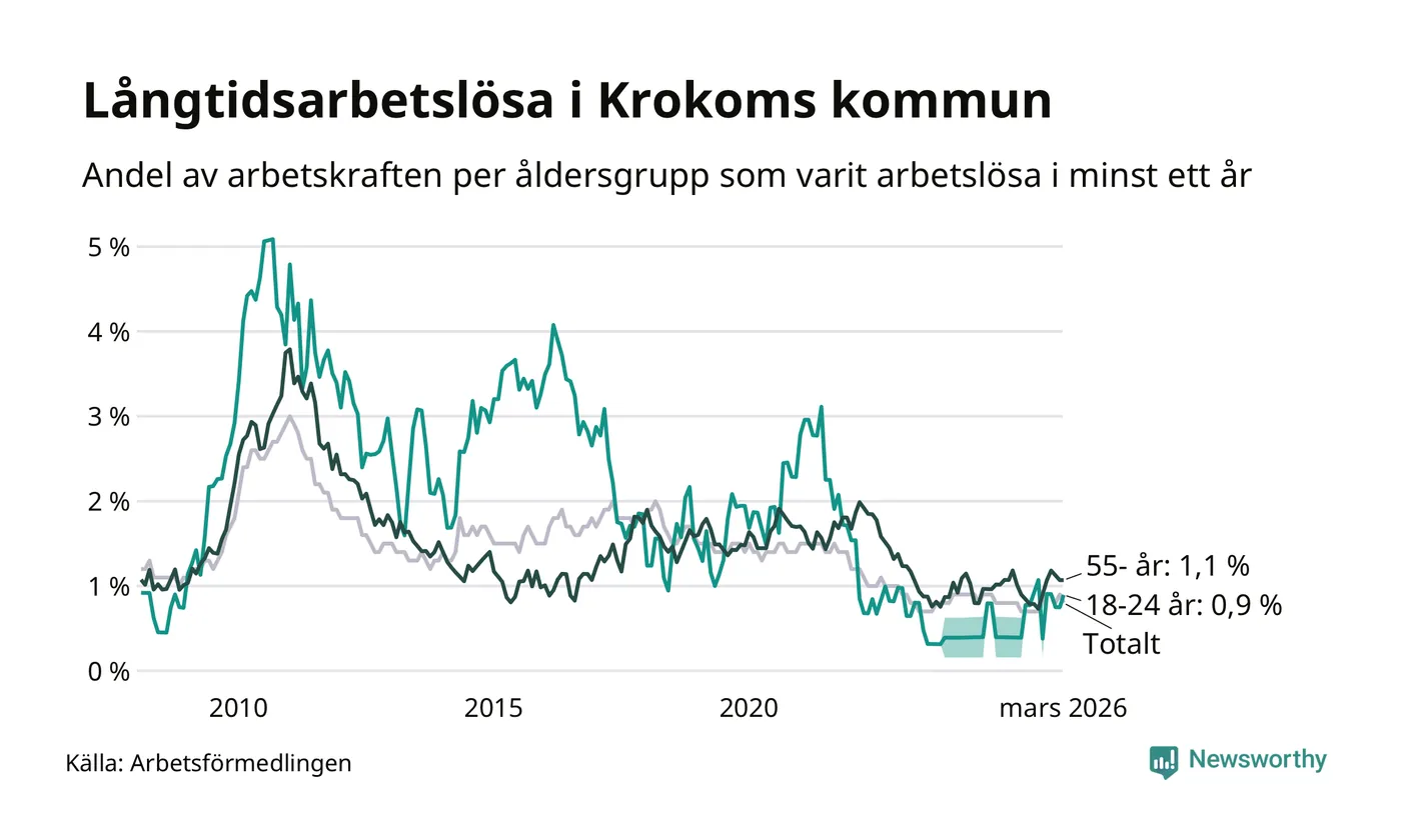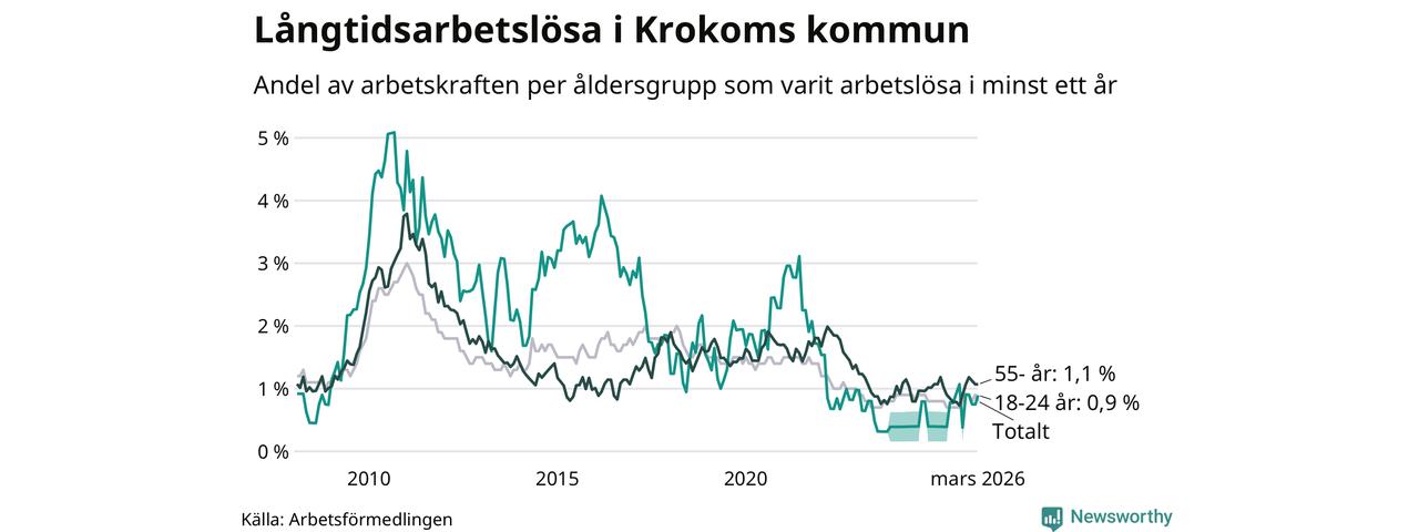 Av de 66 personerna som varit arbetslösa i mer än ett år i Krokoms kommun är 19 personer mellan 55 och 661 år och sex är mellan 18 och 24 år. För den äldre gruppen är andelen arbetslösa 1,1 procent medan den i den yngre gruppen är 0,9 procent. Även i riket som helhet är långtidsarbetslösheten högre i gruppen äldre.