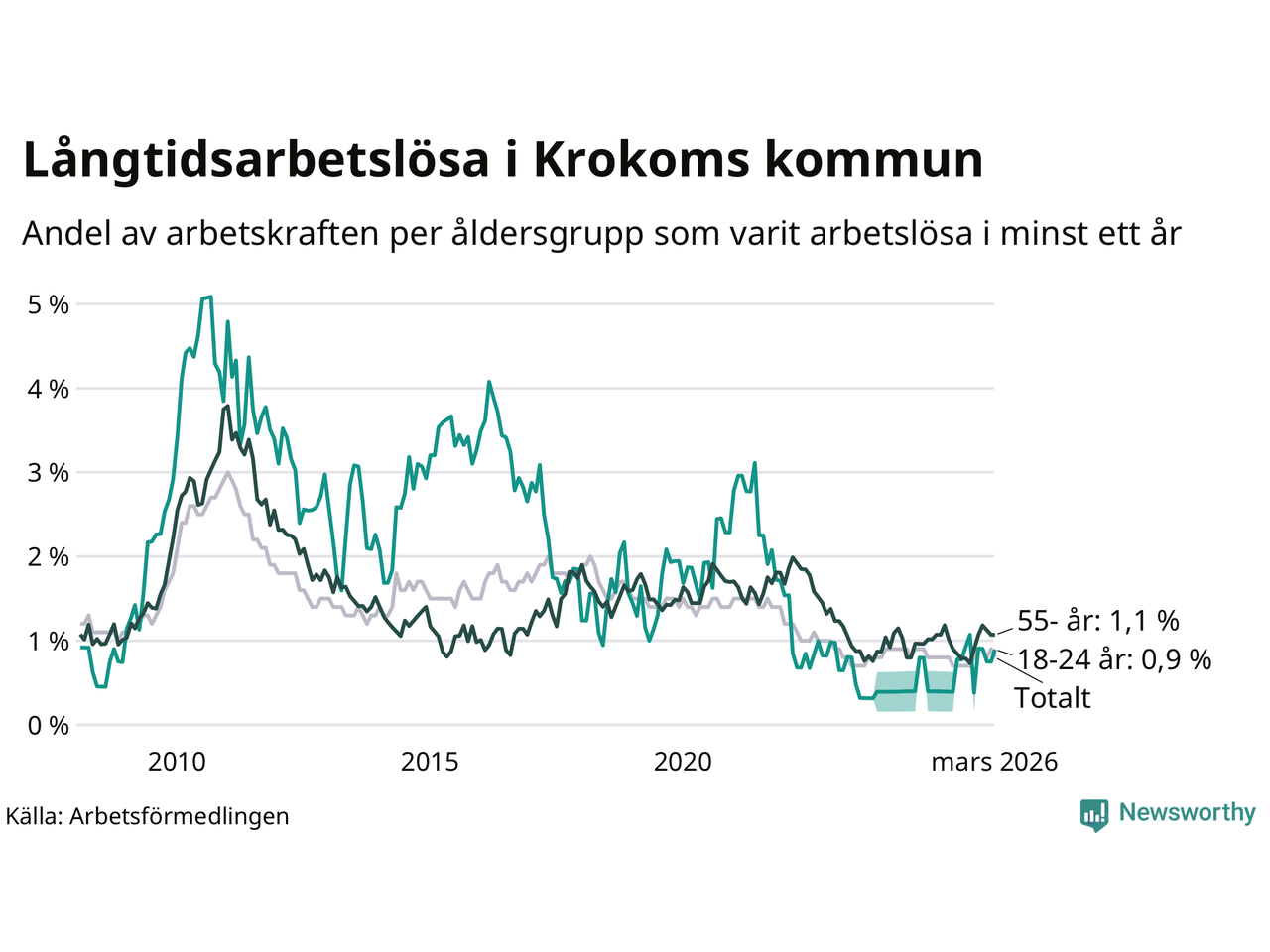 | Andel arbetslösa i minst två år | 0,3 % | 0,7 % | 1,6 % |