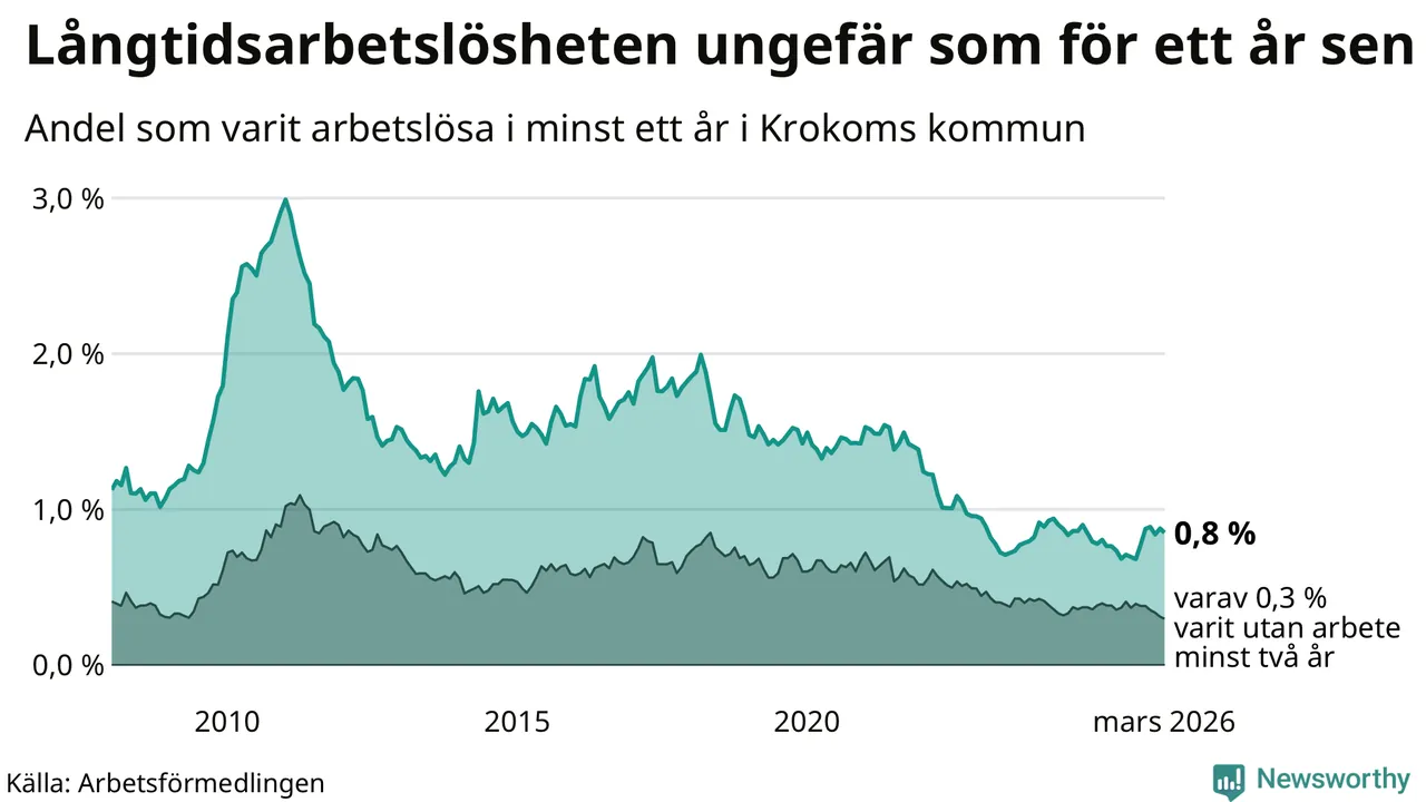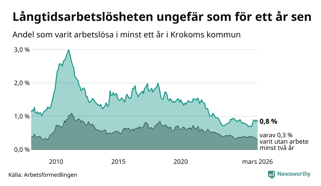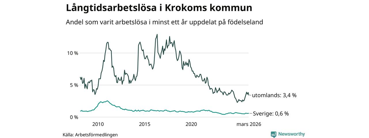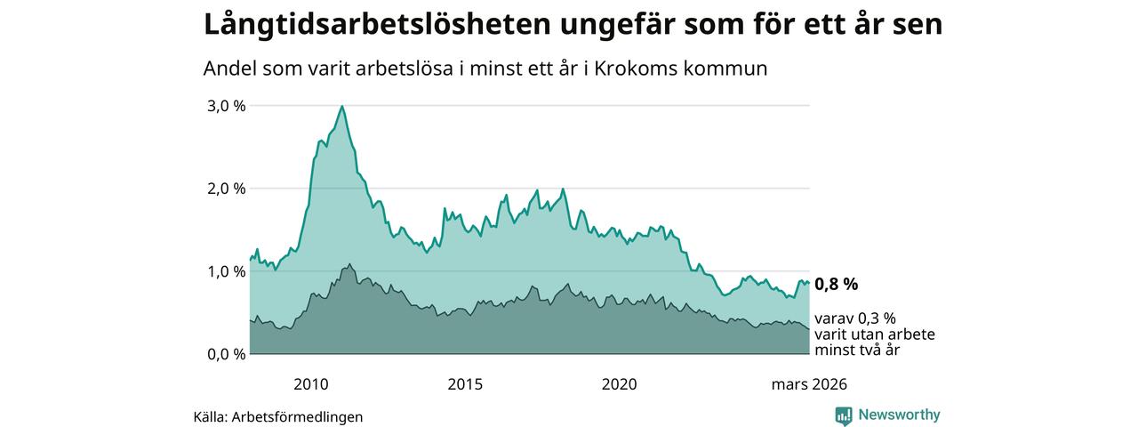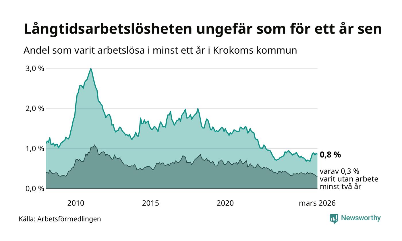 I mars hade 66 Krokombor varit arbetslösa i minst ett år, vilket är två färre än månaden innan. 66 personer motsvarar 0,8 procent av arbetskraften i kommunen – andelen långtidsarbetslösa är ungefär på samma nivå som för ett år sedan. Krokom tillhör de kommuner som har lägst andel långtidsarbetslösa i hela landet just nu.