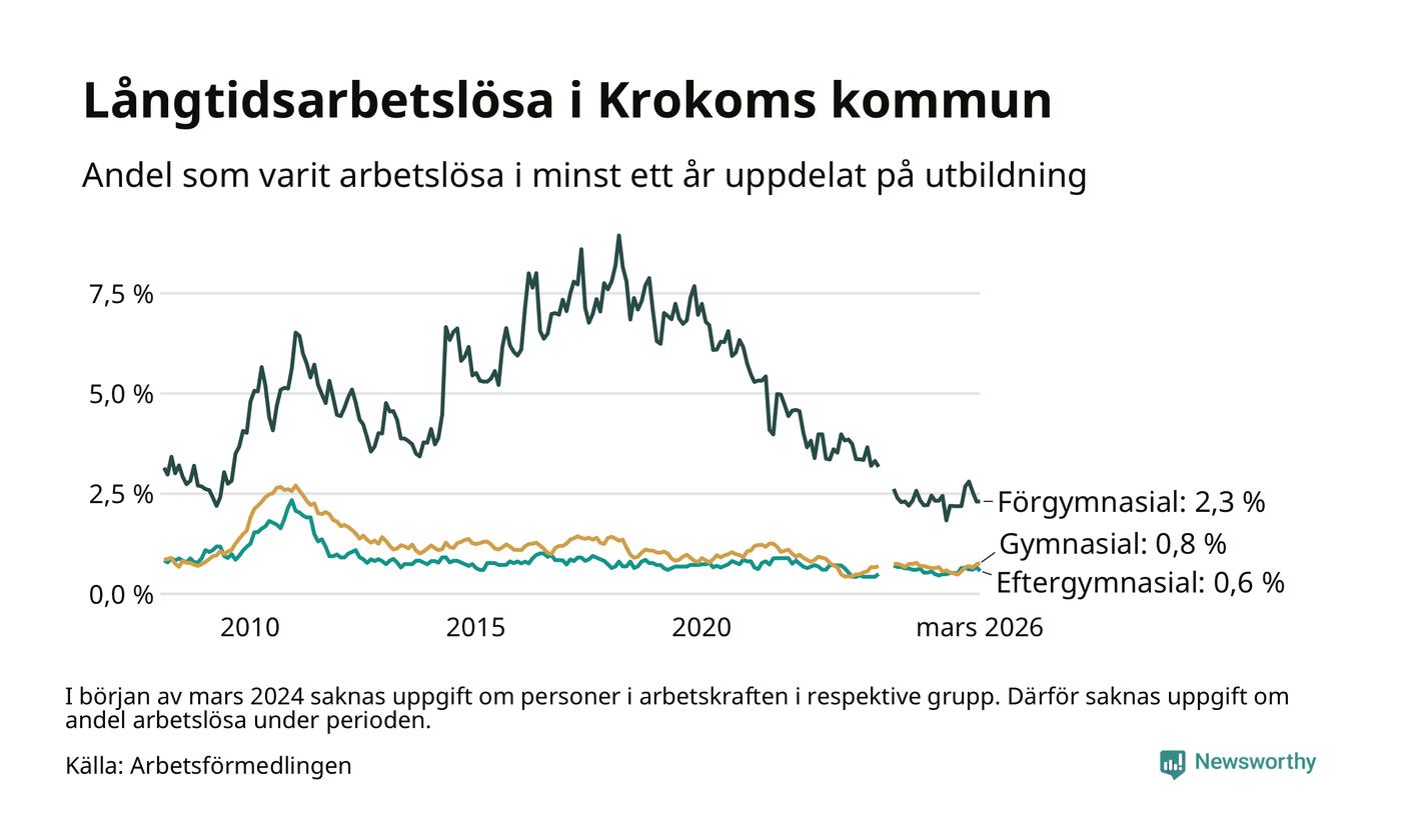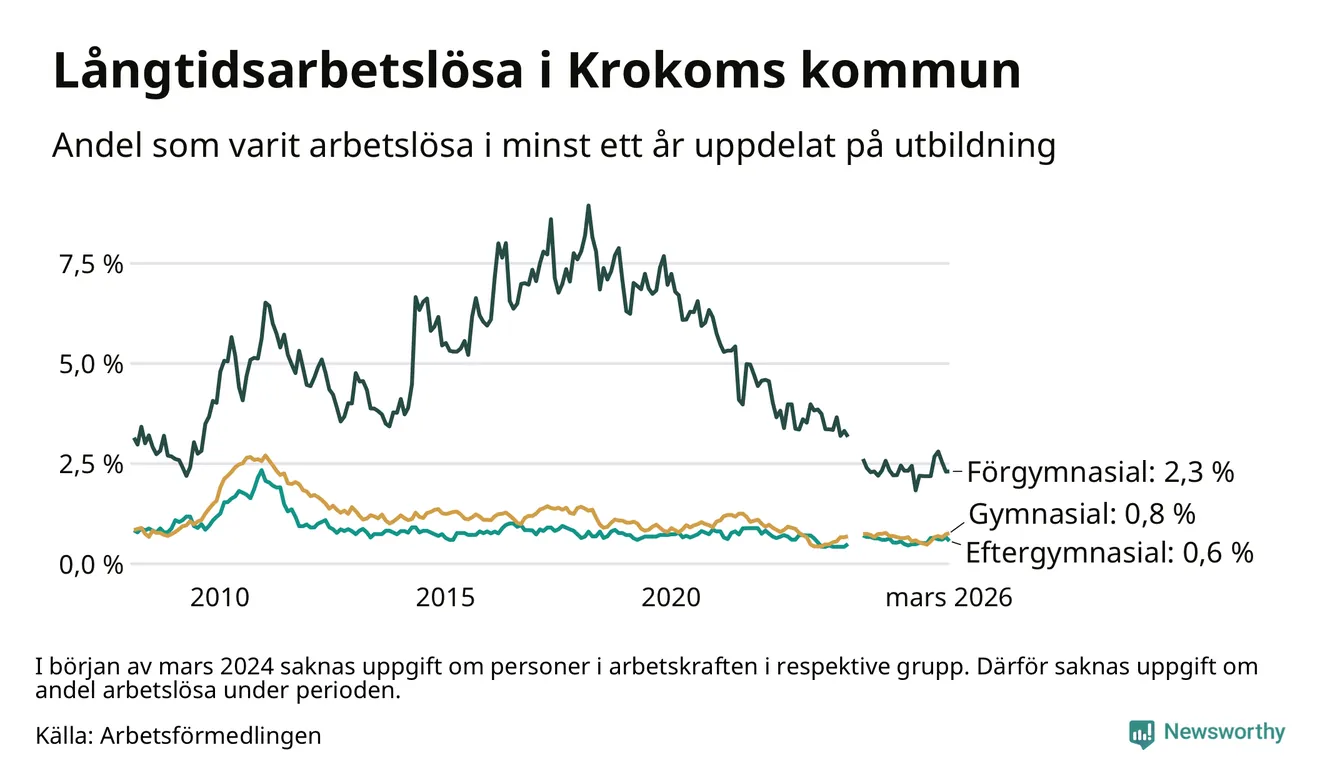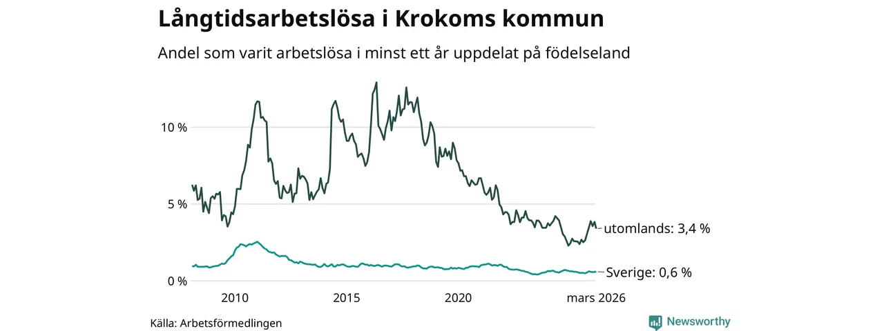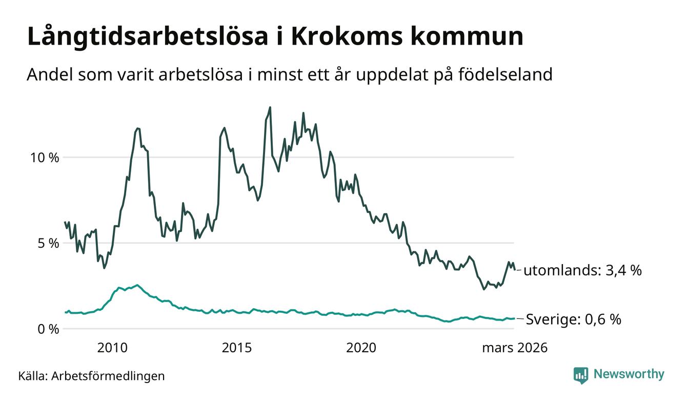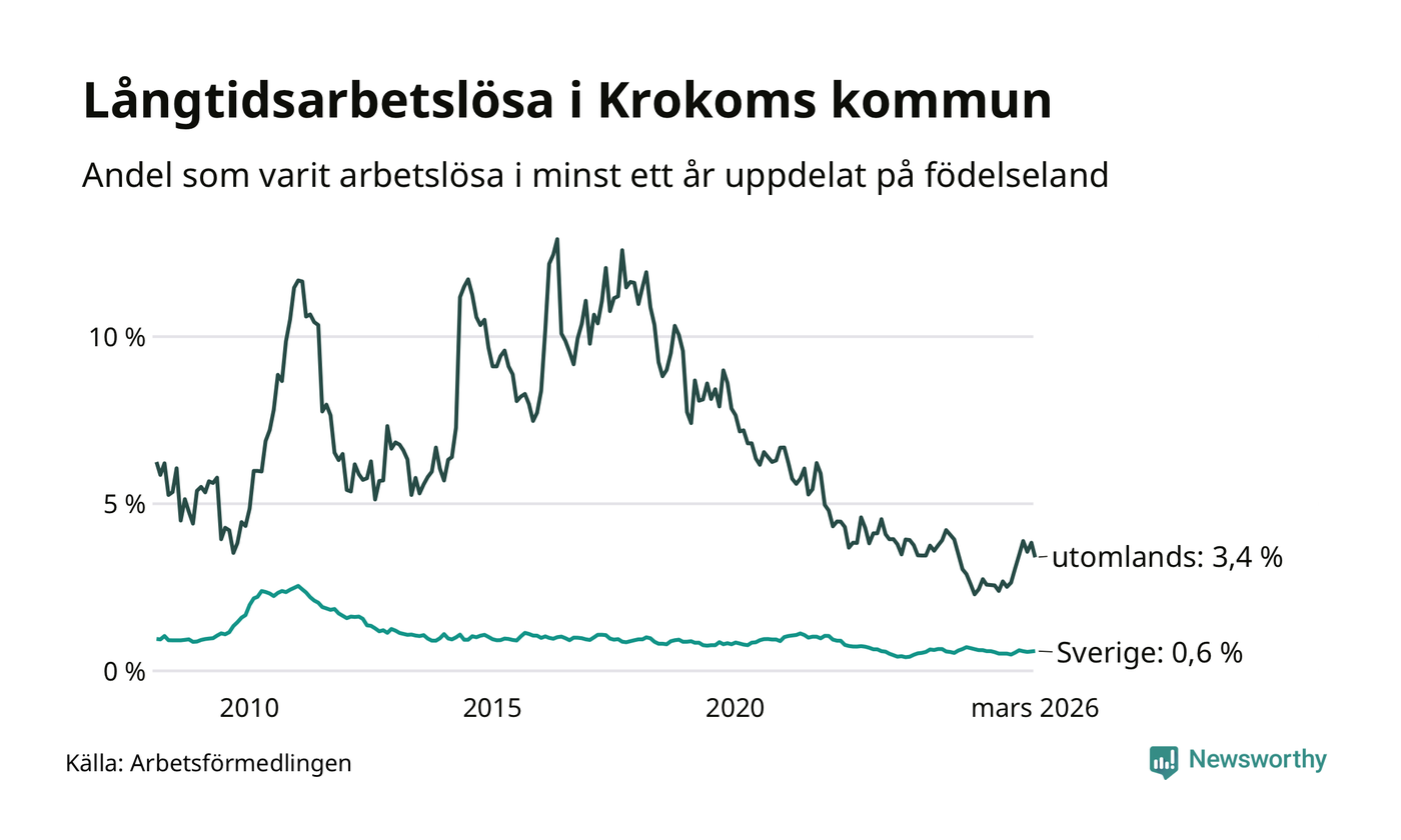 I mars hade 66 Krokombor varit arbetslösa i minst ett år, vilket är två färre än månaden innan. 66 personer motsvarar 0,8 procent av arbetskraften i kommunen – andelen långtidsarbetslösa är ungefär på samma nivå som för ett år sedan. Krokom tillhör de kommuner som har lägst andel långtidsarbetslösa i hela landet just nu.