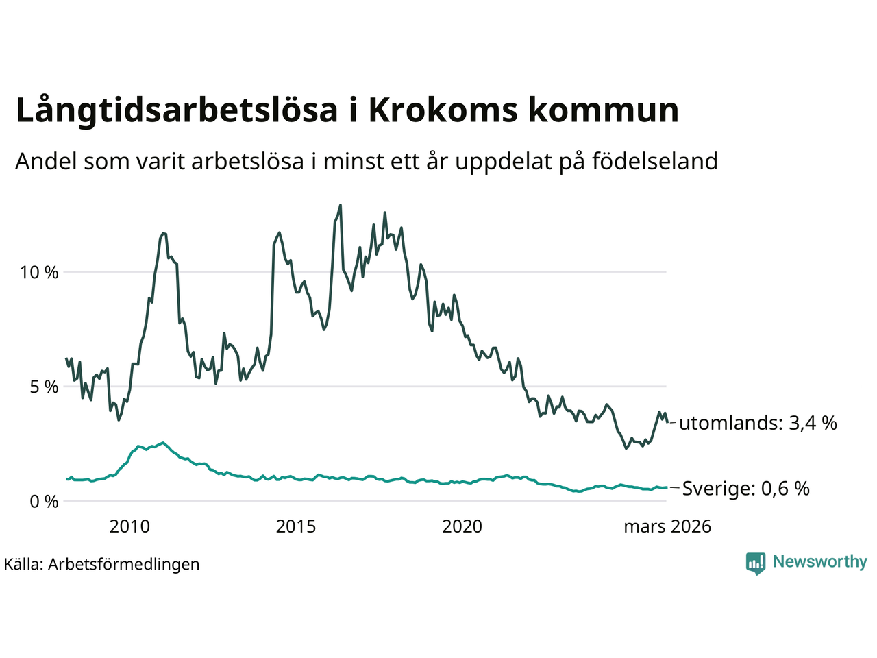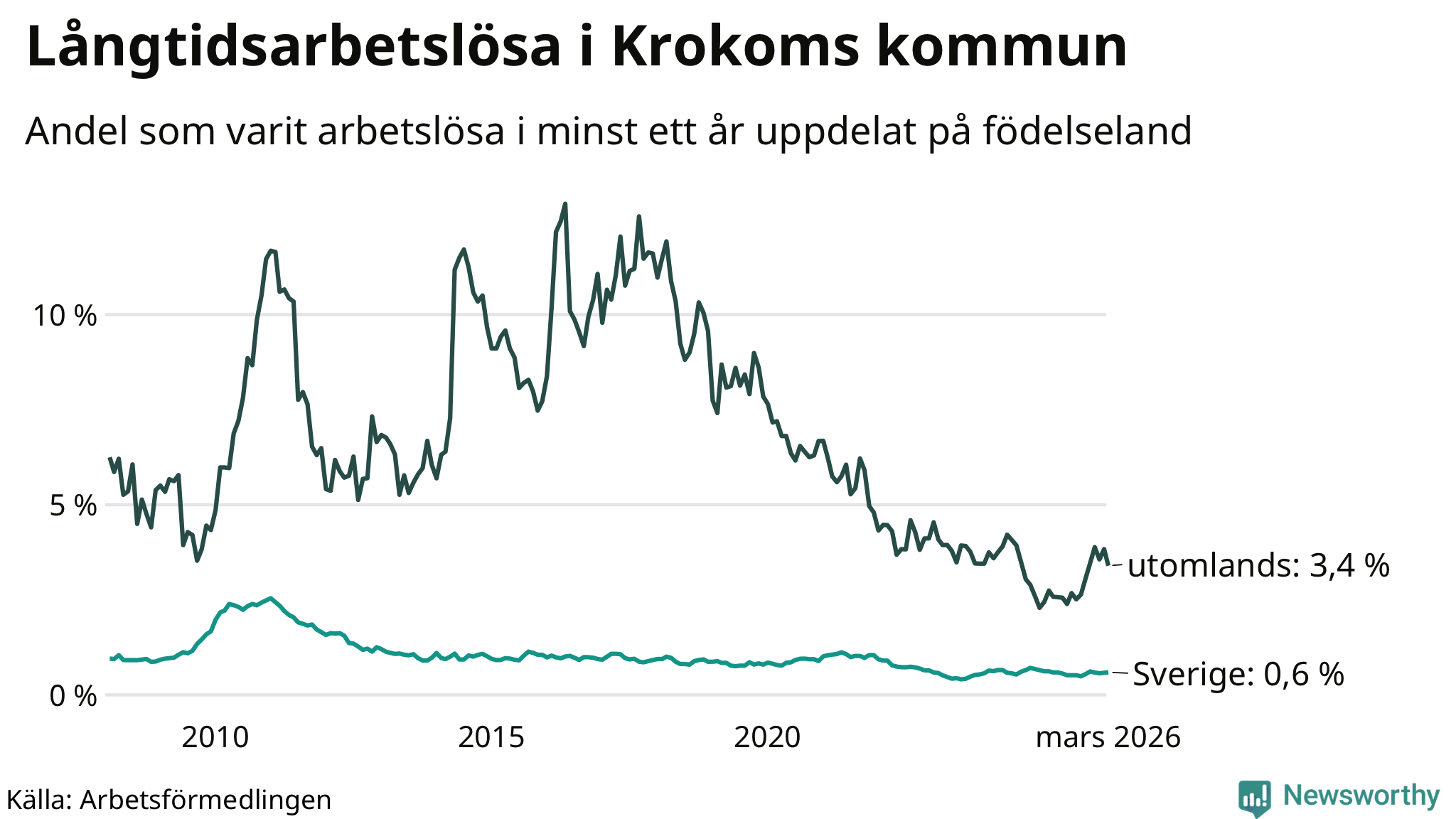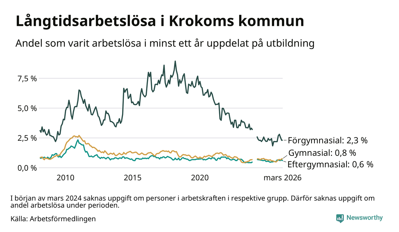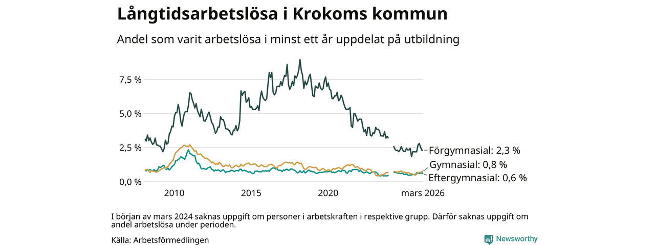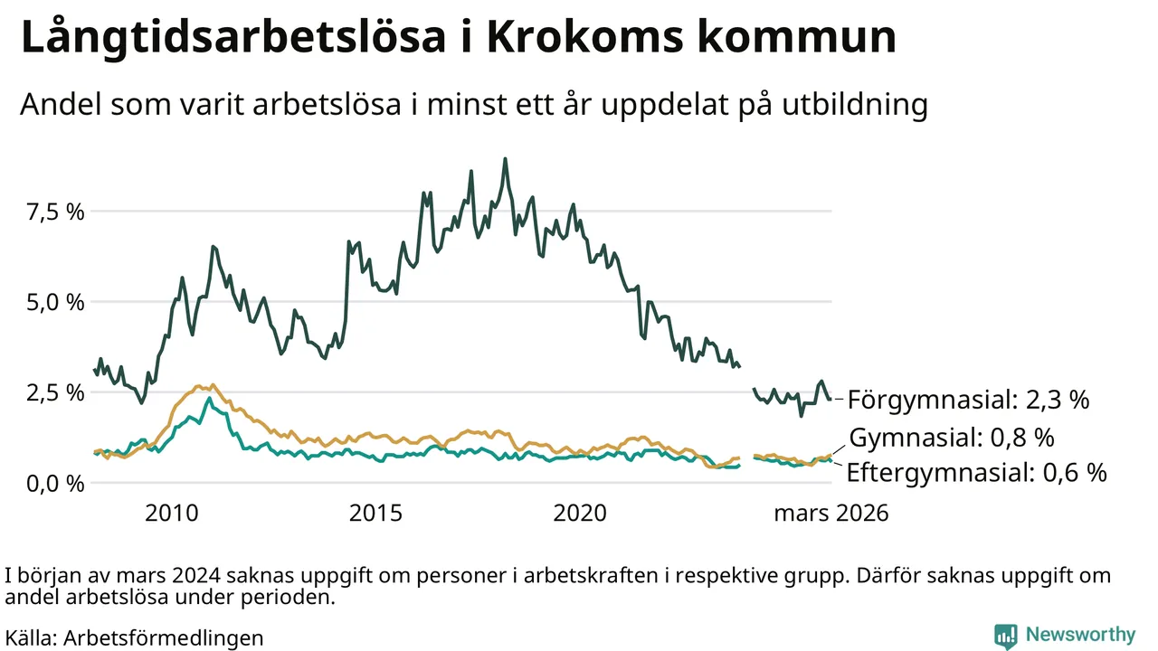I mars hade 66 Krokombor varit arbetslösa i minst ett år, vilket är två färre än månaden innan. 66 personer motsvarar 0,8 procent av arbetskraften i kommunen – andelen långtidsarbetslösa är ungefär på samma nivå som för ett år sedan. Krokom tillhör de kommuner som har lägst andel långtidsarbetslösa i hela landet just nu.