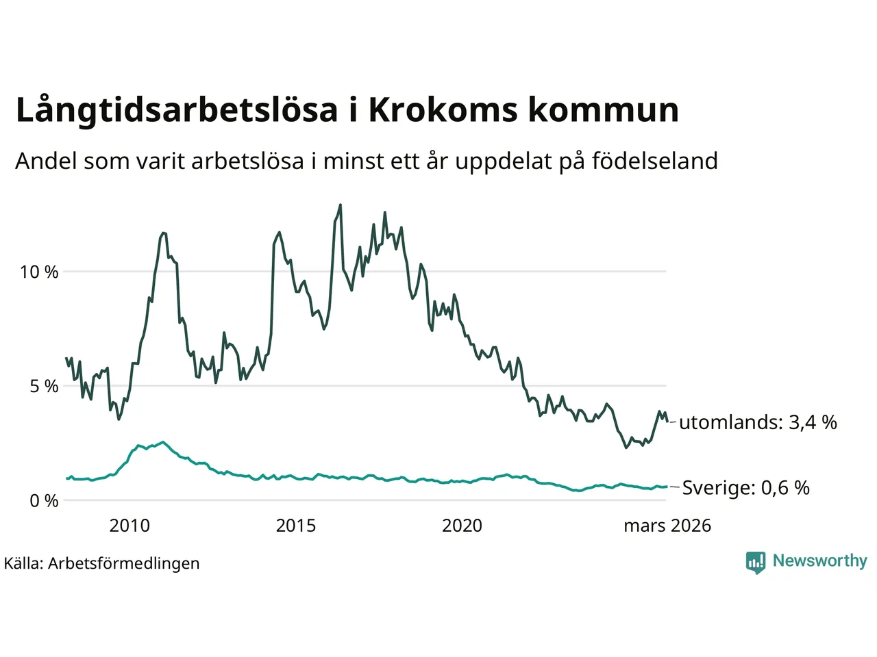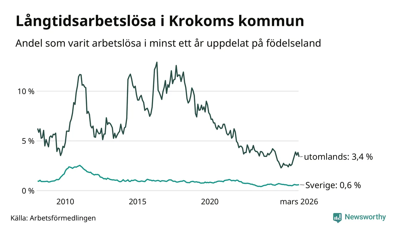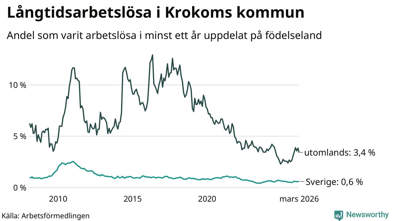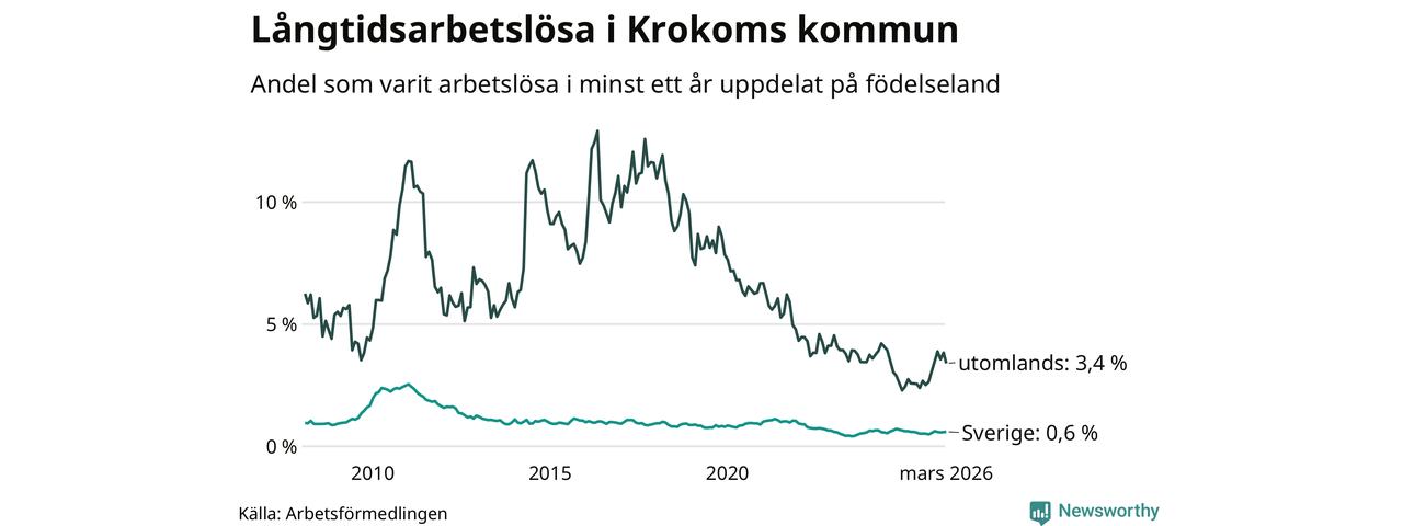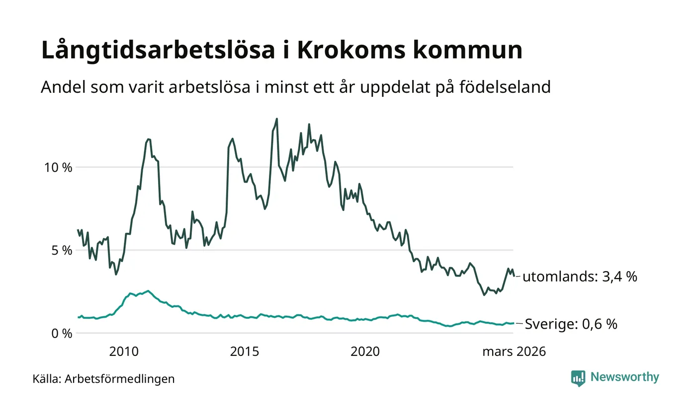42 av de långtidsarbetslösa i Krokom är födda i Sverige, medan 24 är födda utomlands. Det innebär att långtidsarbetslösheten bland Sverigefödda är 0,6 procent, medan den är sex gånger så hög – 3,4 procent – bland födda utomlands. Även i riket som helhet är arbetslösheten högre bland utrikesfödda.