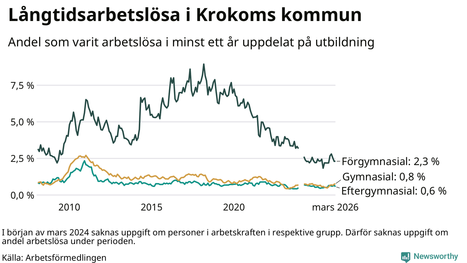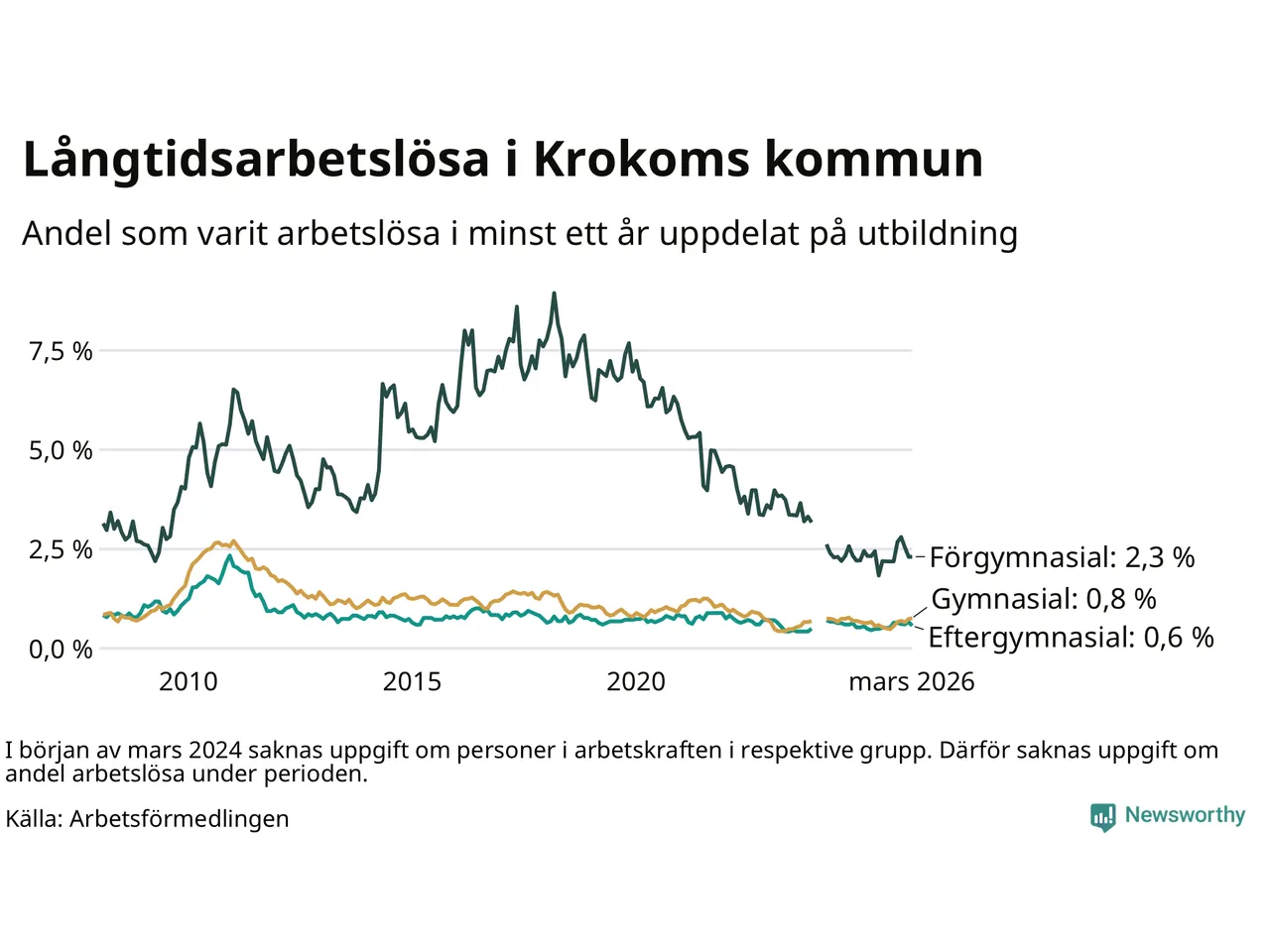 | Andel arbetslösa i minst ett år | 0,8 % | 1,4 % | 2,9 % |