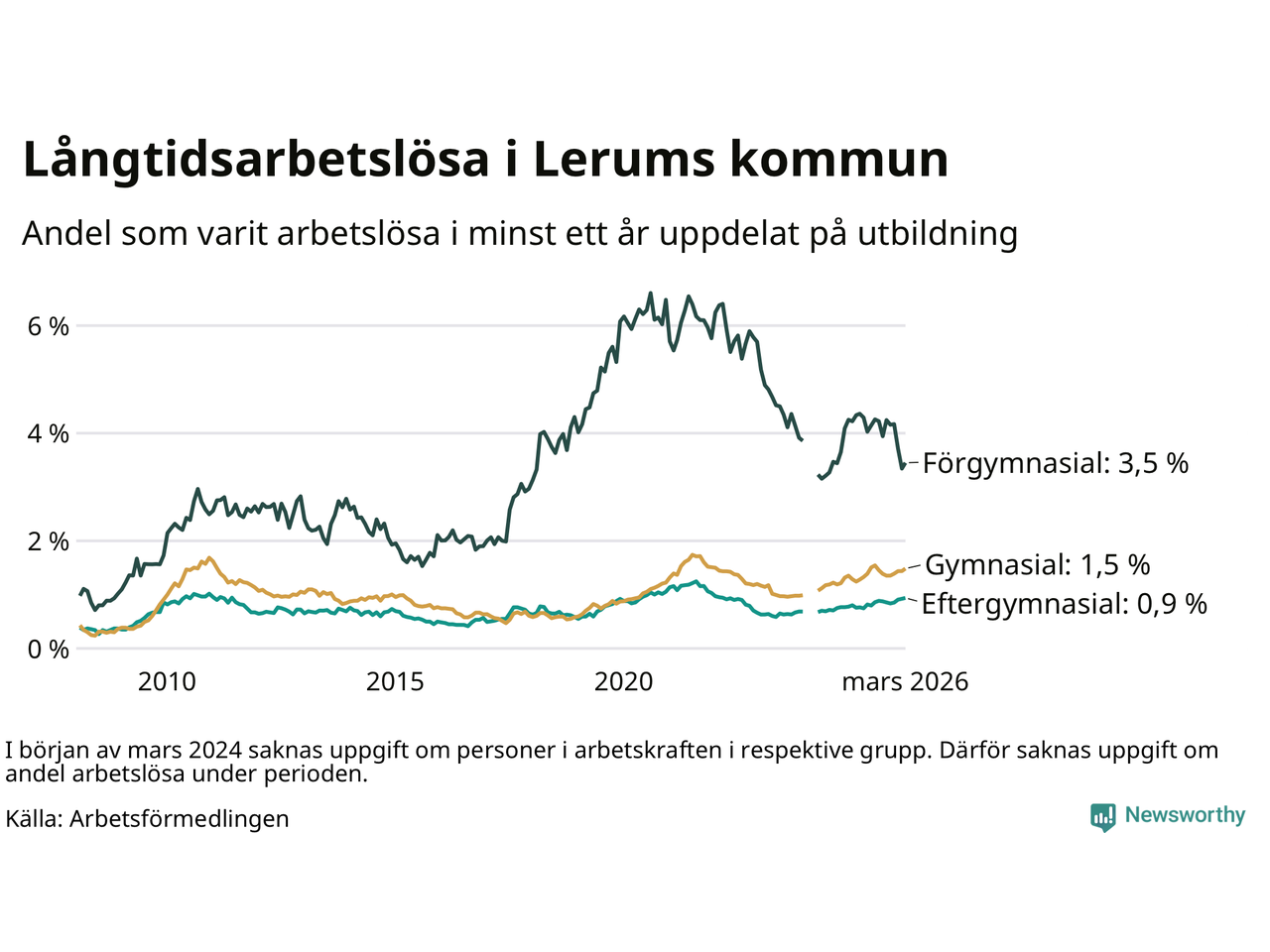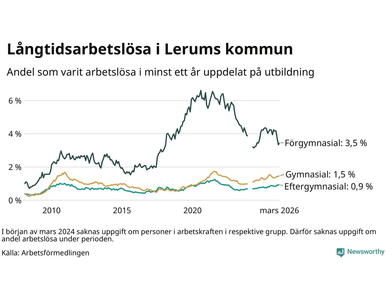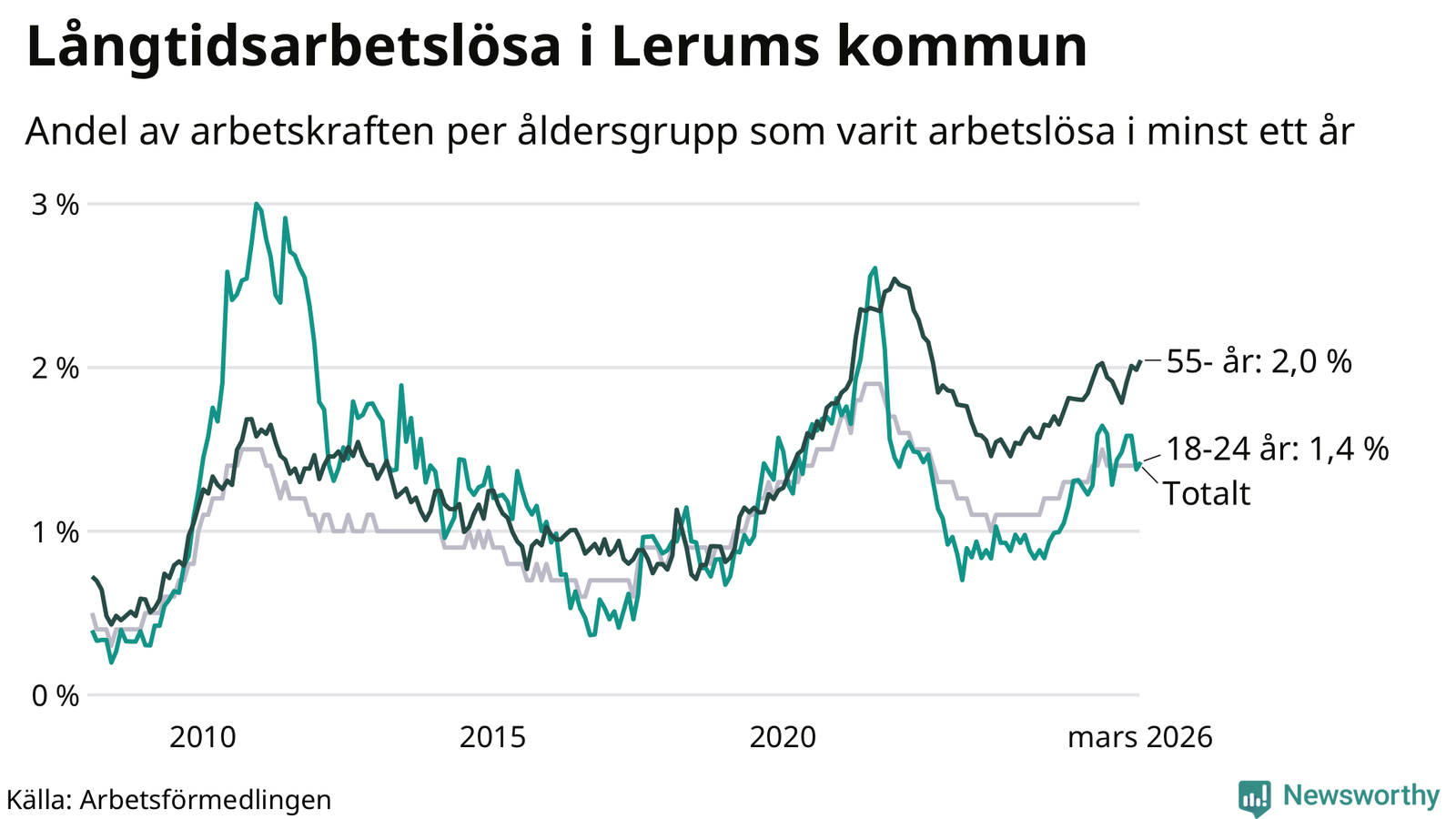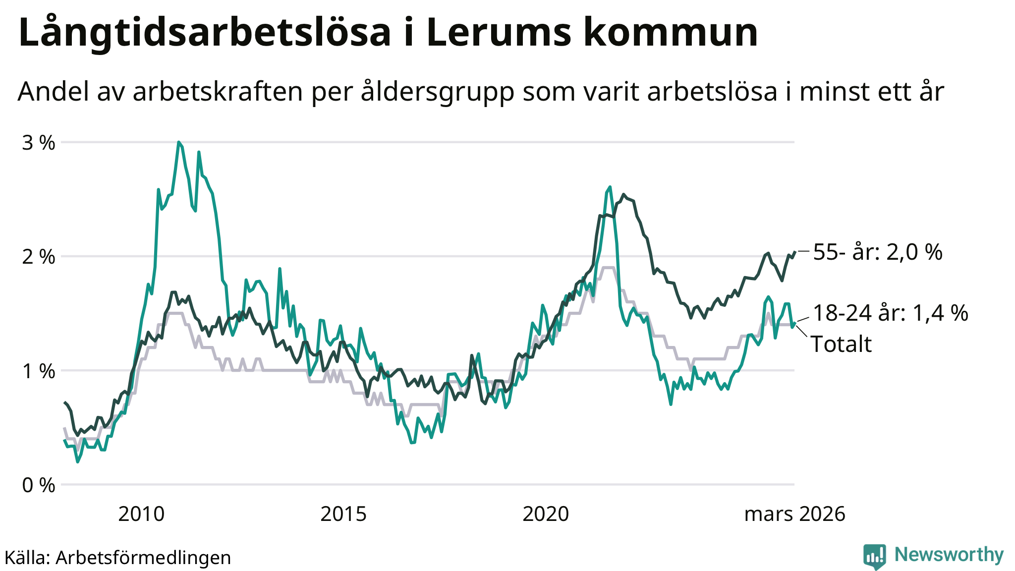 | Andel arbetslösa i minst ett år | 1,4 % | 2,5 % | 2,9 % |
