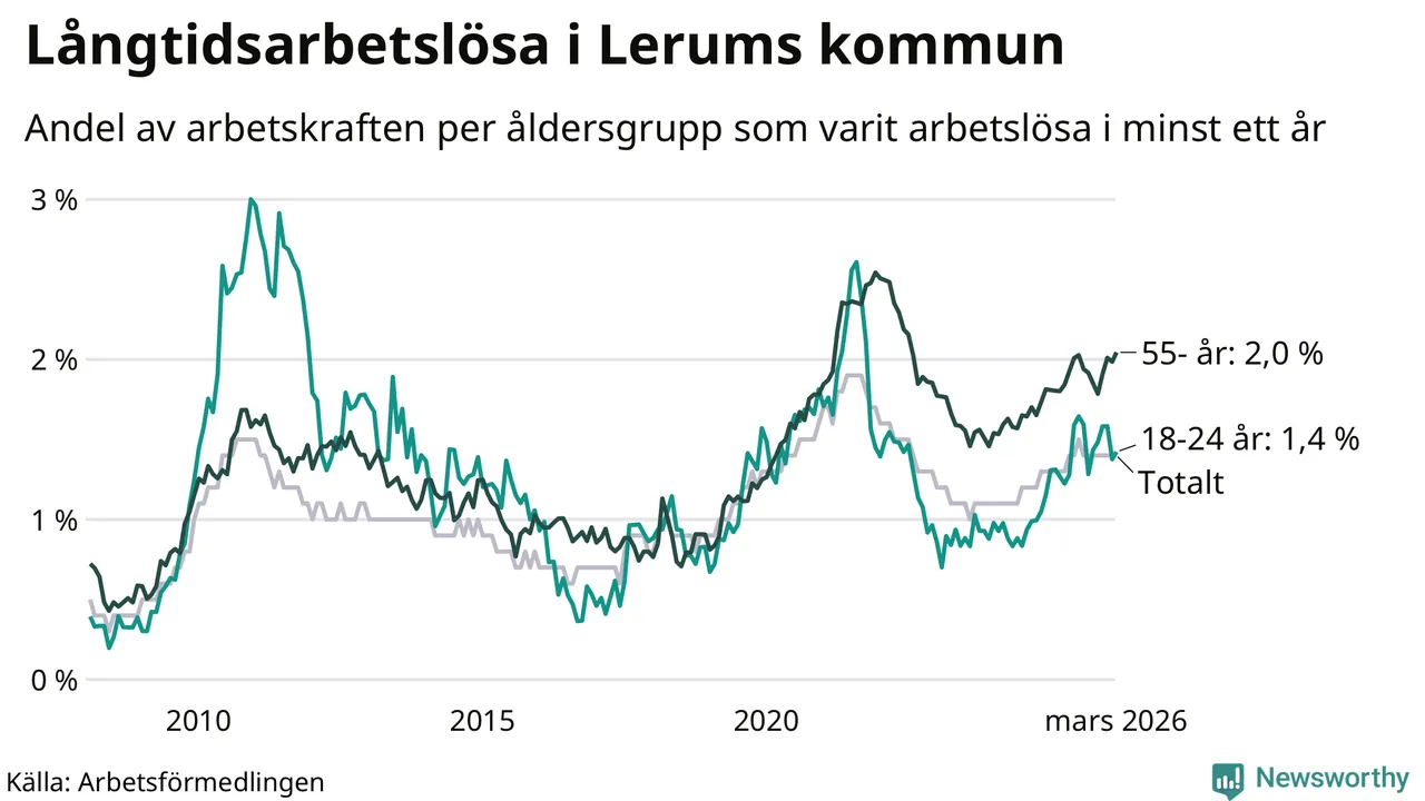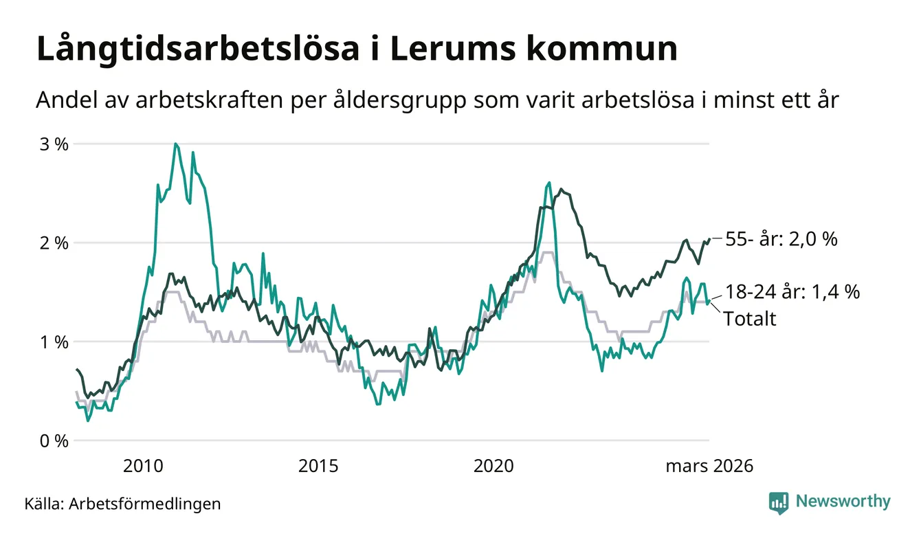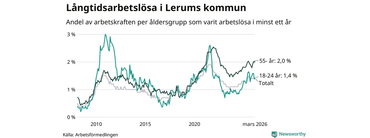 Av de 307 personerna som varit arbetslösa i mer än ett år i Lerums kommun är 98 personer mellan 55 och 661 år och 28 är mellan 18 och 24 år. För den äldre gruppen är andelen arbetslösa 2,0 procent medan den i den yngre gruppen är 1,4 procent. Även i riket som helhet är långtidsarbetslösheten högre i gruppen äldre.