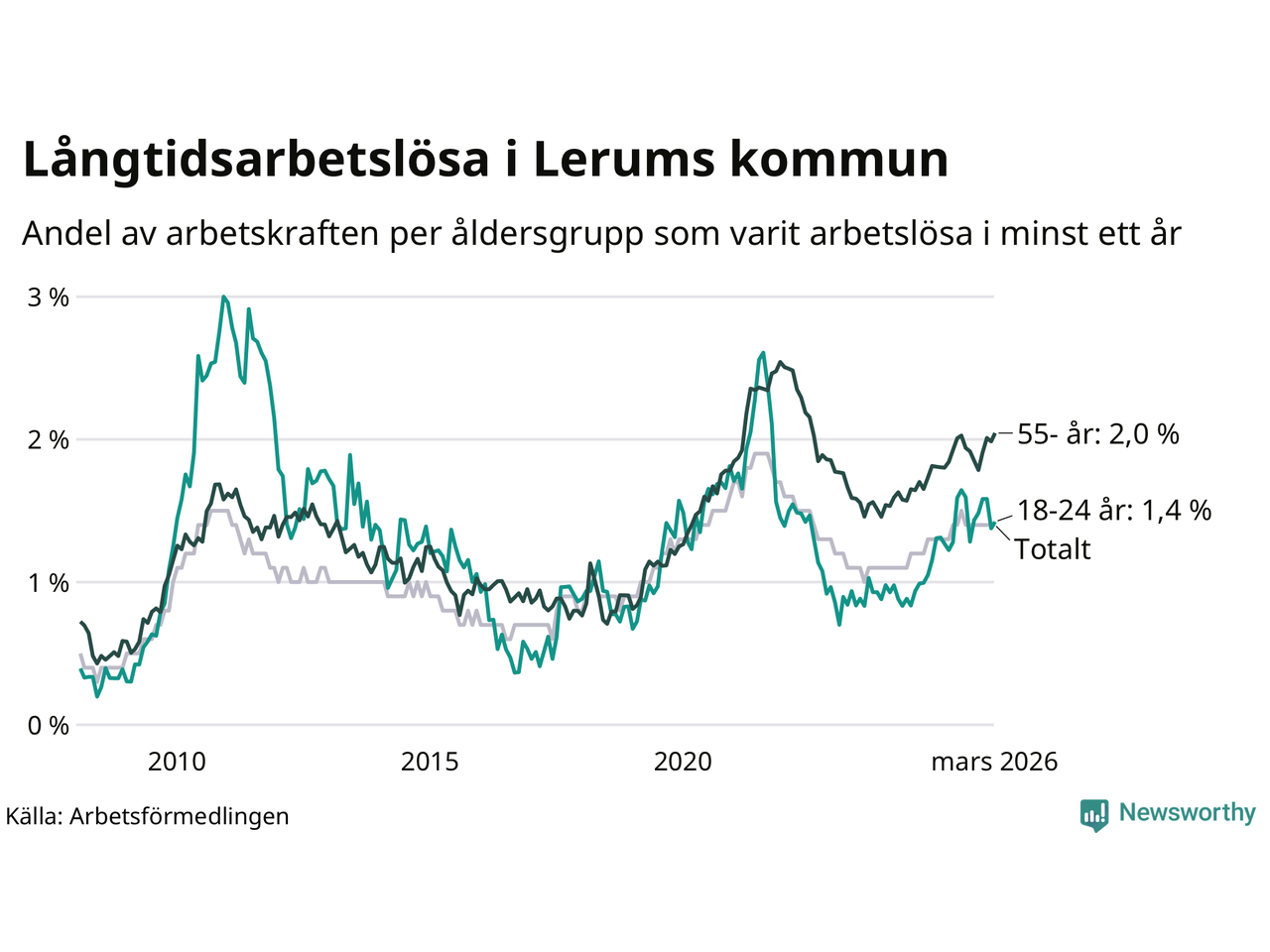 | Andel arbetslösa i minst två år | 0,7 % | 1,3 % | 1,6 % |