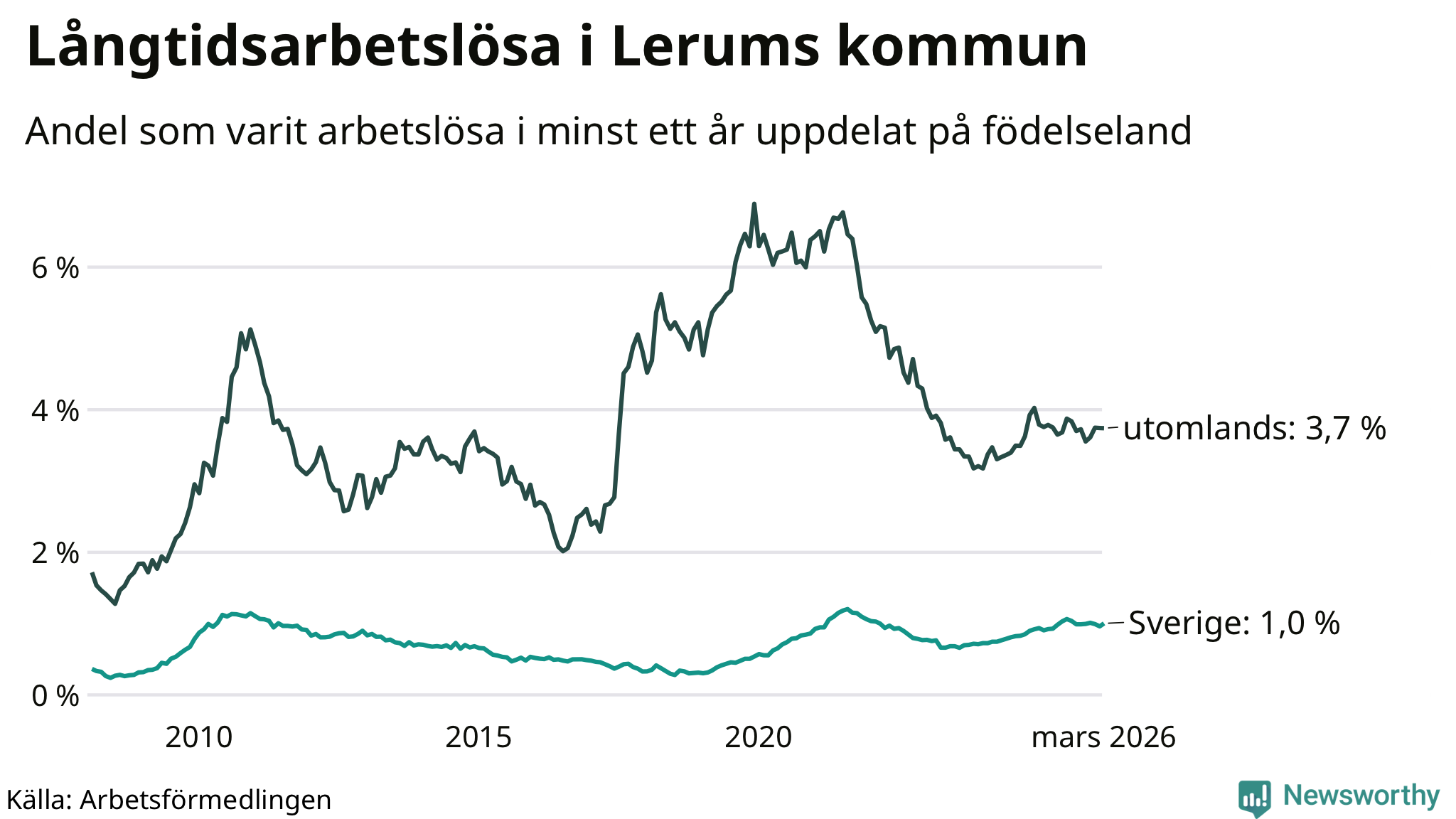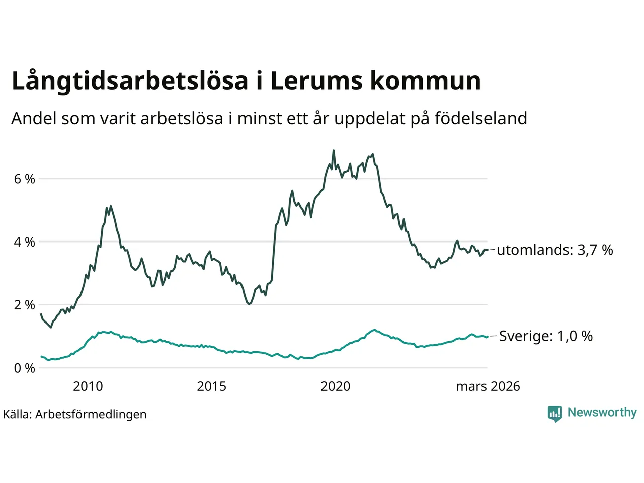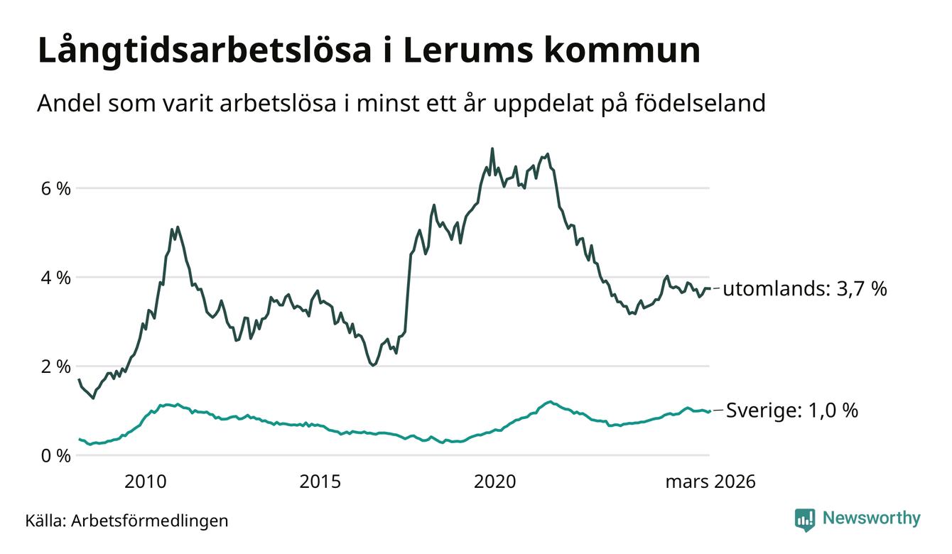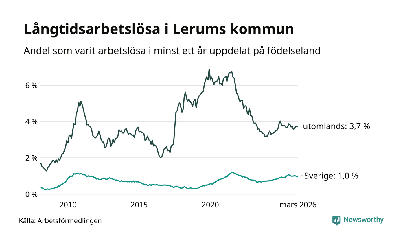 191 av de långtidsarbetslösa i Lerum är födda i Sverige, medan 116 är födda utomlands. Det innebär att långtidsarbetslösheten bland Sverigefödda är 1,0 procent, medan den är fyra gånger så hög – 3,7 procent – bland födda utomlands. Även i riket som helhet är arbetslösheten högre bland utrikesfödda.