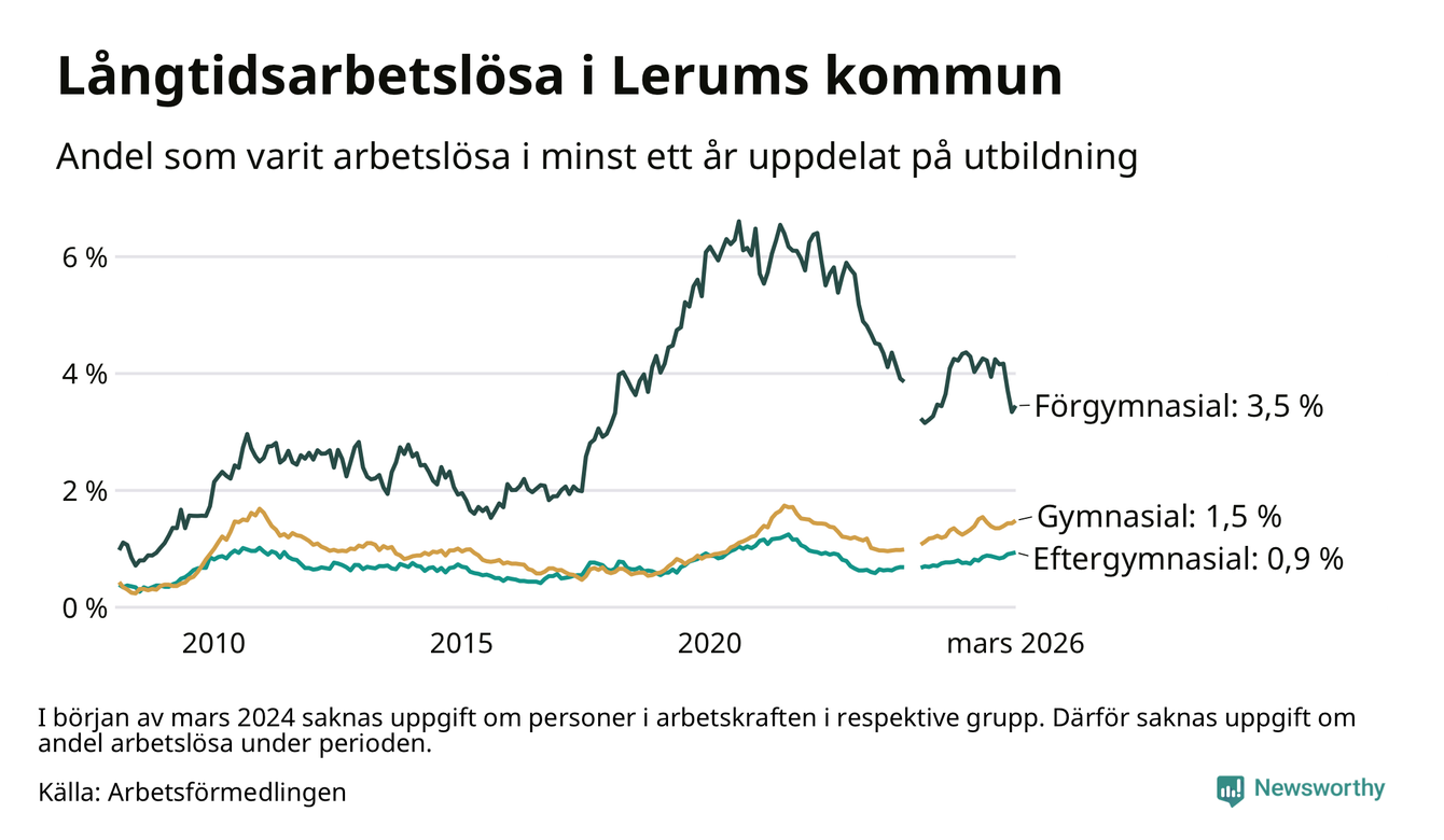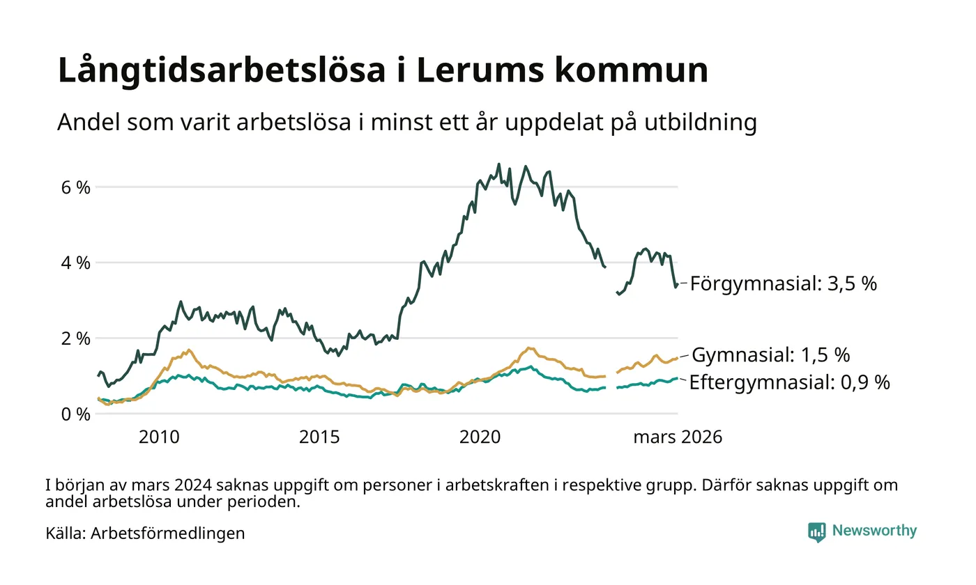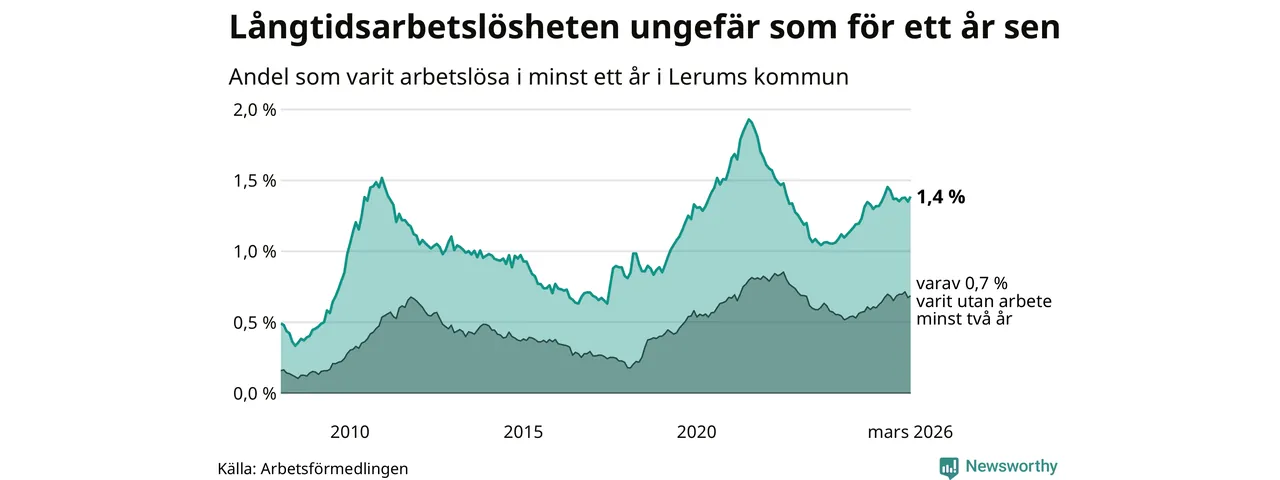 I mars hade 307 Lerumsbor varit arbetslösa i minst ett år, vilket är åtta fler än månaden innan. 307 personer motsvarar 1,4 procent av arbetskraften i kommunen – andelen långtidsarbetslösa är ungefär på samma nivå som för ett år sedan.