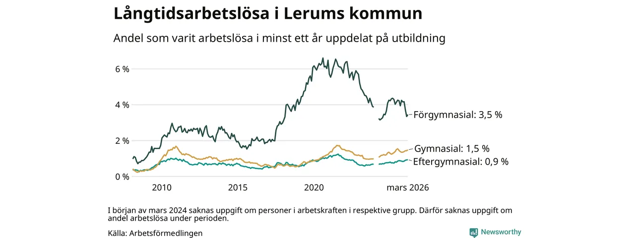 Andelen som varit utan arbete i minst ett år i Lerum var ungefär lika stor i mars jämfört med samma månad för ett år sedan. Det visar Arbetsfömedlingens senaste månadsstatistik.
