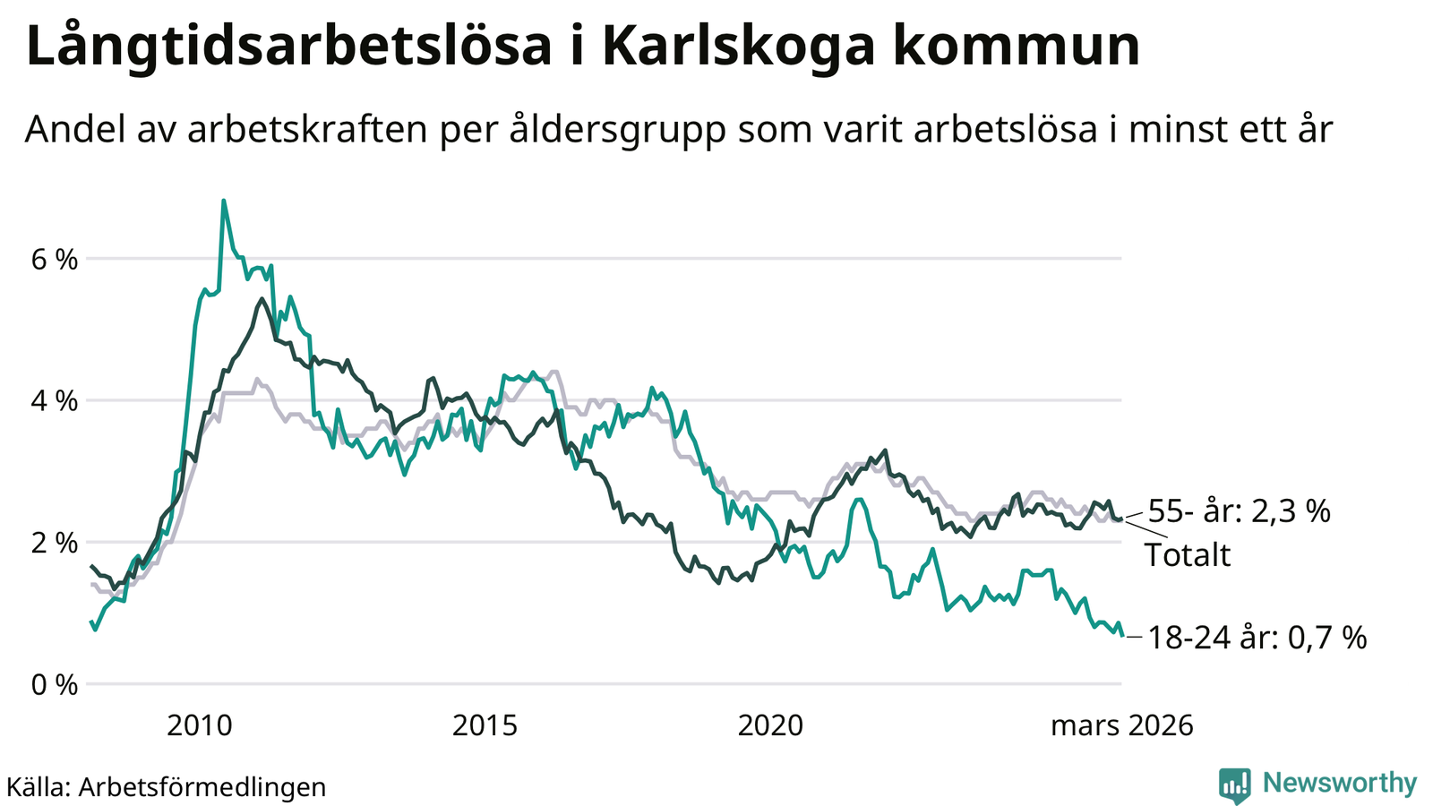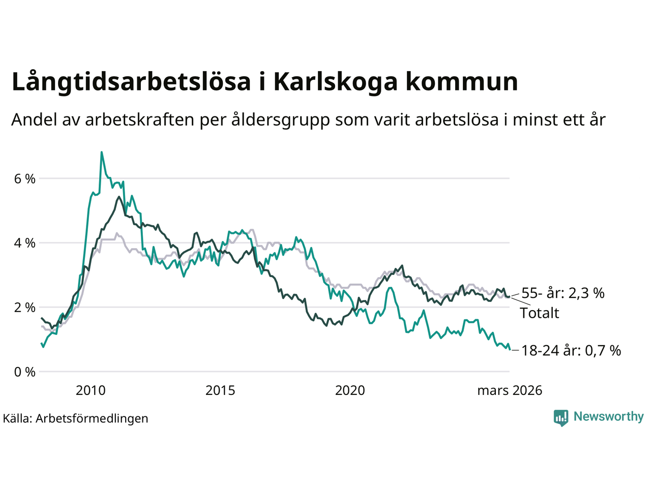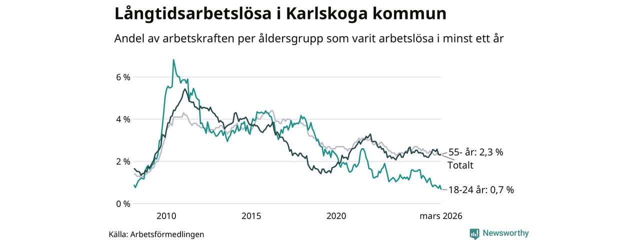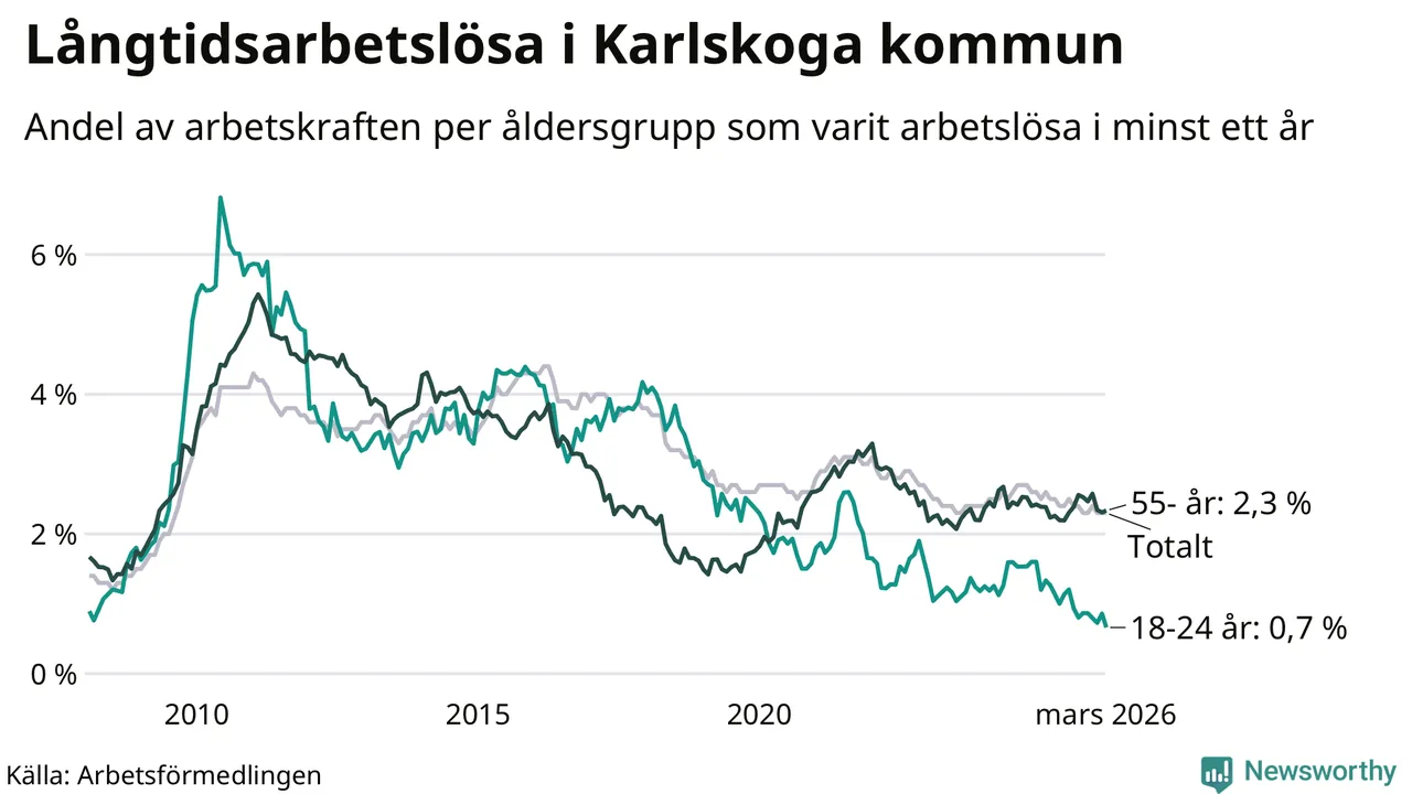 Av de 338 personerna som varit arbetslösa i mer än ett år i Karlskoga kommun är 82 personer mellan 55 och 661 år och tio är mellan 18 och 24 år. För den äldre gruppen är andelen arbetslösa 2,3 procent medan den i den yngre gruppen är 0,7 procent. Även i riket som helhet är långtidsarbetslösheten högre i gruppen äldre.