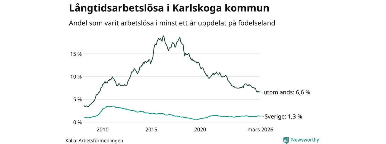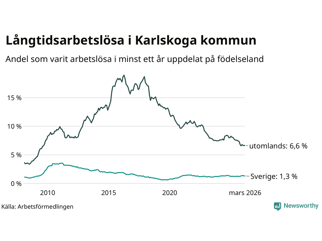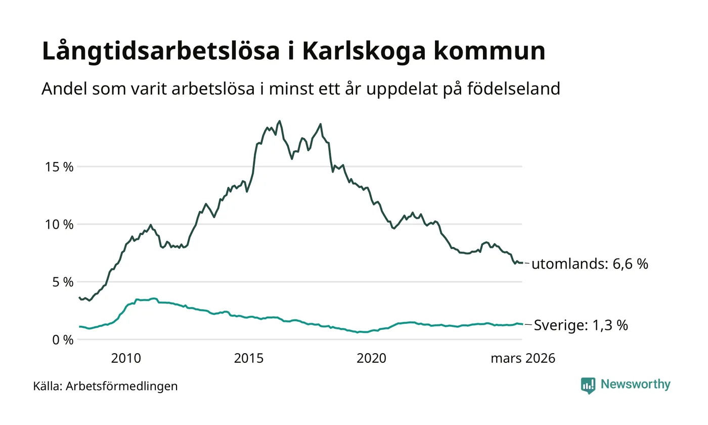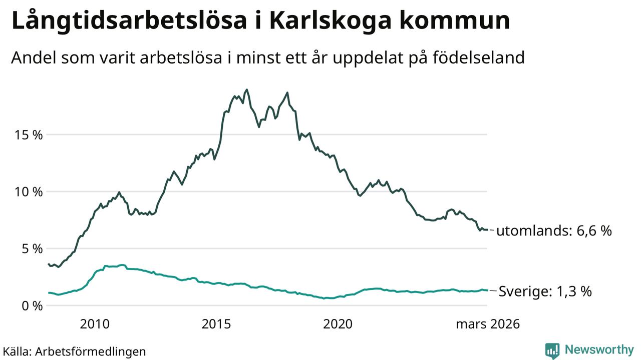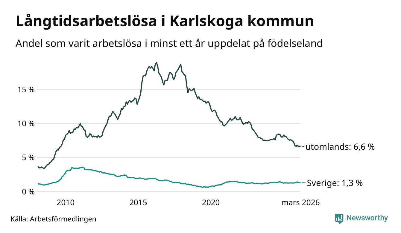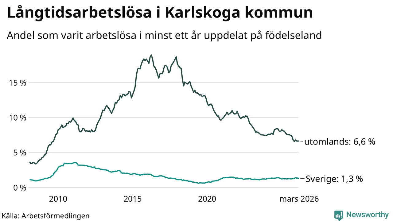 156 av de långtidsarbetslösa i Karlskoga är födda i Sverige, medan 182 är födda utomlands. Det innebär att långtidsarbetslösheten bland Sverigefödda är 1,3 procent, medan den är fem gånger så hög – 6,6 procent – bland födda utomlands. Även i riket som helhet är arbetslösheten högre bland utrikesfödda.