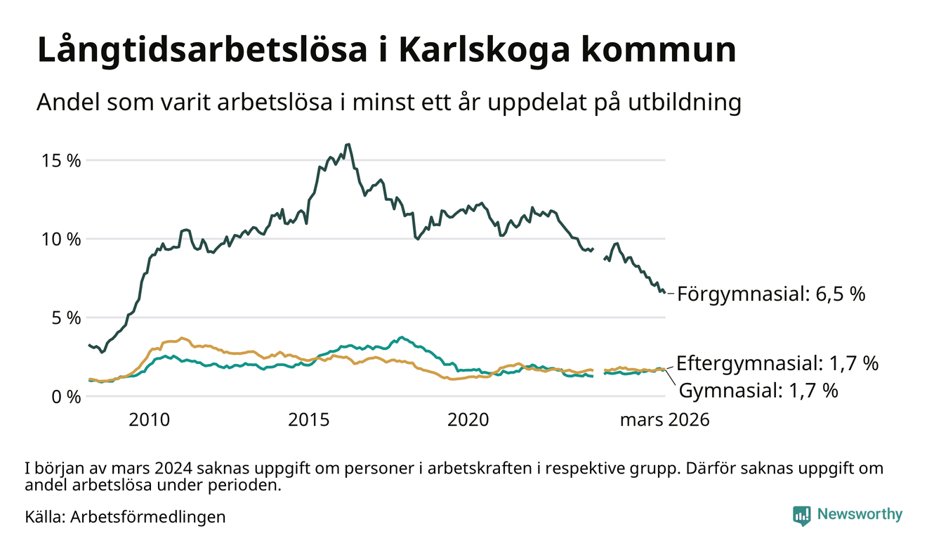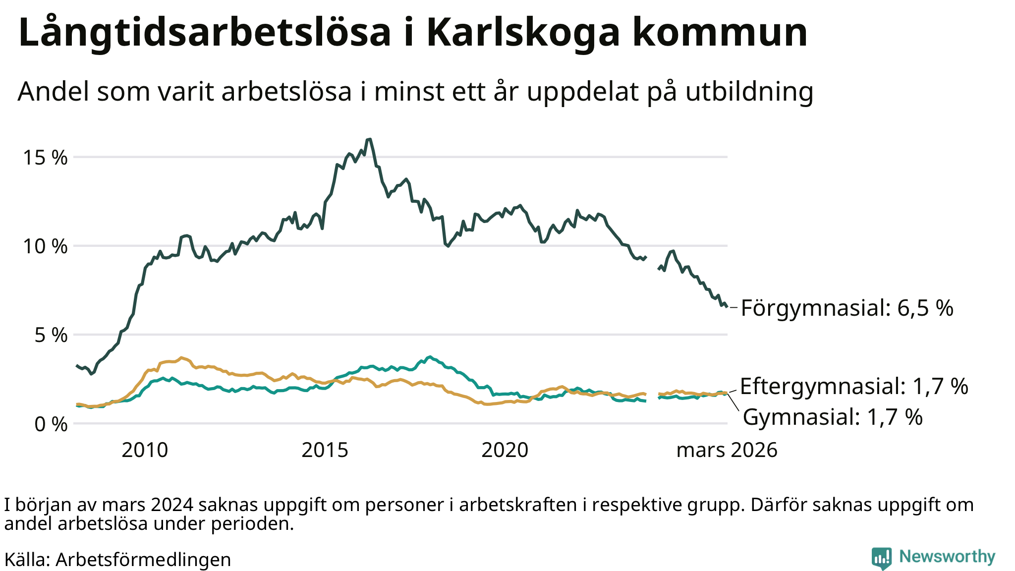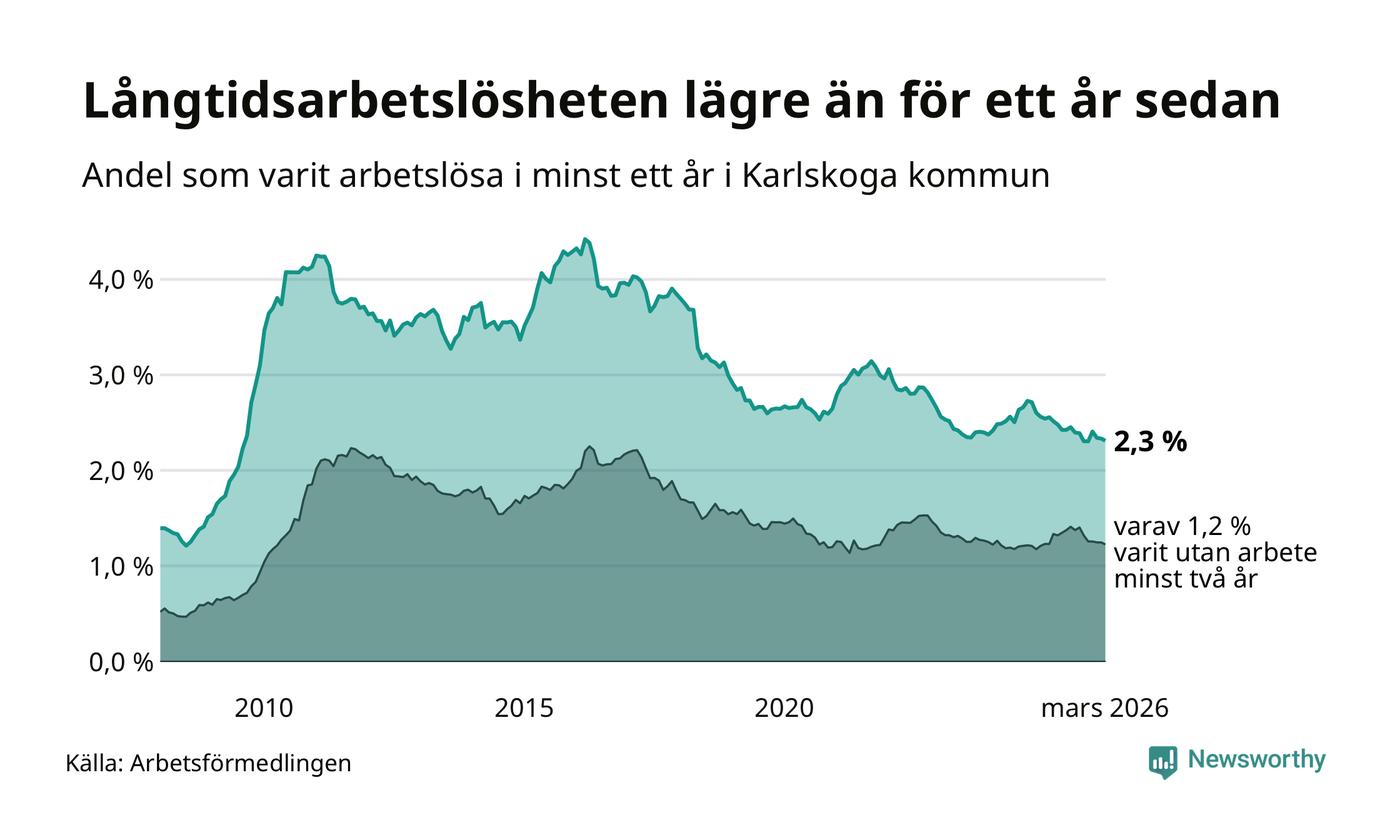 I mars hade 338 Karlskogabor varit arbetslösa i minst ett år, vilket är tre färre än månaden innan. 338 personer motsvarar 2,3 procent av arbetskraften i kommunen – andelen långtidsarbetslösa är 0,2 procentenheter lägre än samma månad för ett år sedan.