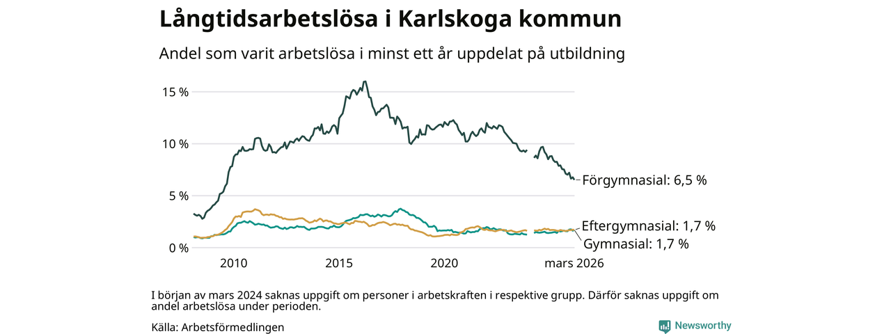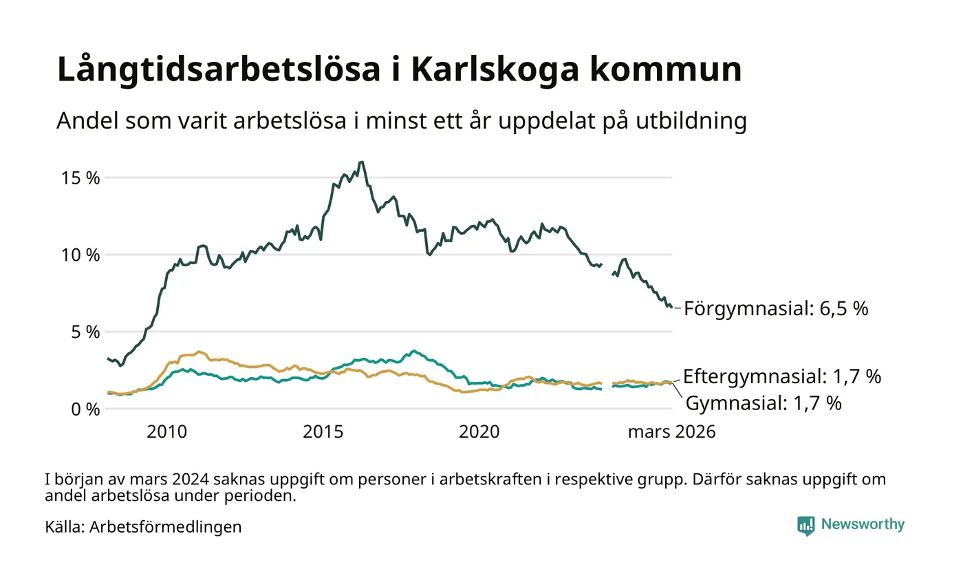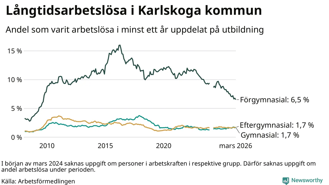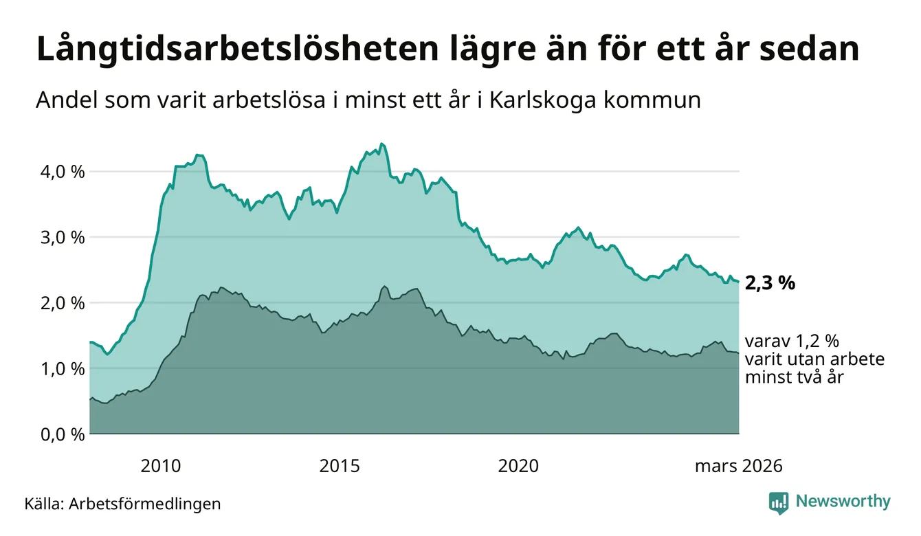 Andelen som varit utan arbete i minst ett år i Karlskoga var lägre i mars jämfört med samma månad för ett år sedan. Det visar Arbetsfömedlingens senaste månadsstatistik.