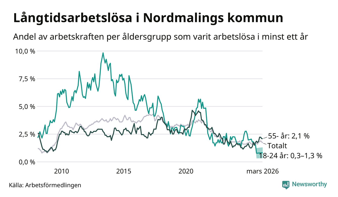Av de 56 personerna som varit arbetslösa i mer än ett år i Nordmalings kommun är 17 personer mellan 55 och 661 år och mellan en och fyra är mellan 18 och 24 år. För den äldre gruppen är andelen arbetslösa 2,1 procent medan den i den yngre gruppen är mellan 0,3 och 1,3 procent. Även i riket som helhet är långtidsarbetslösheten högre i gruppen äldre.