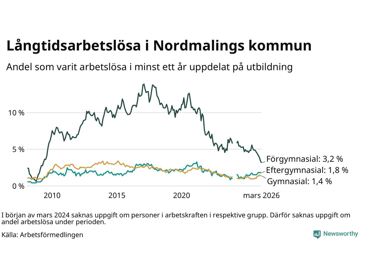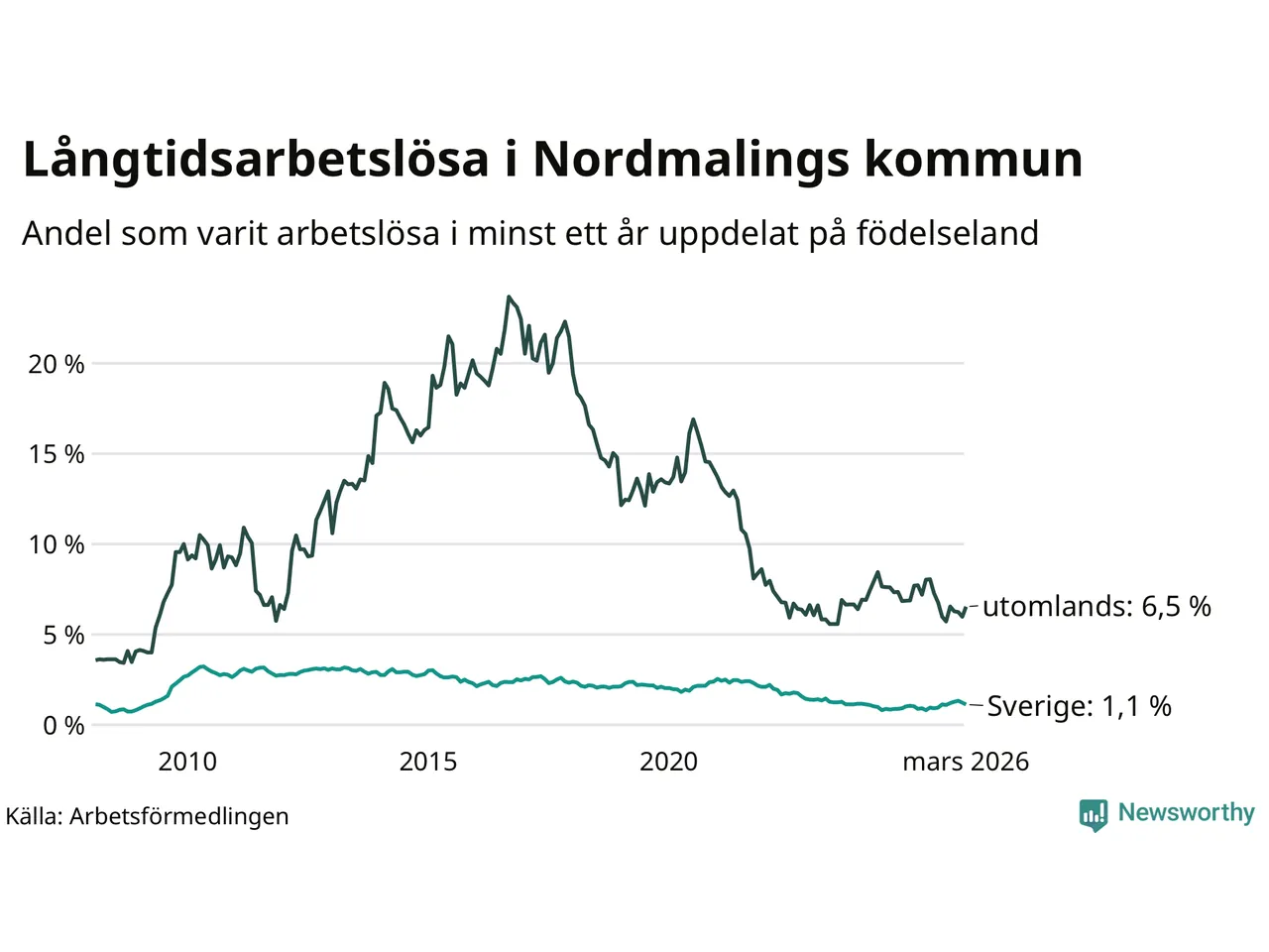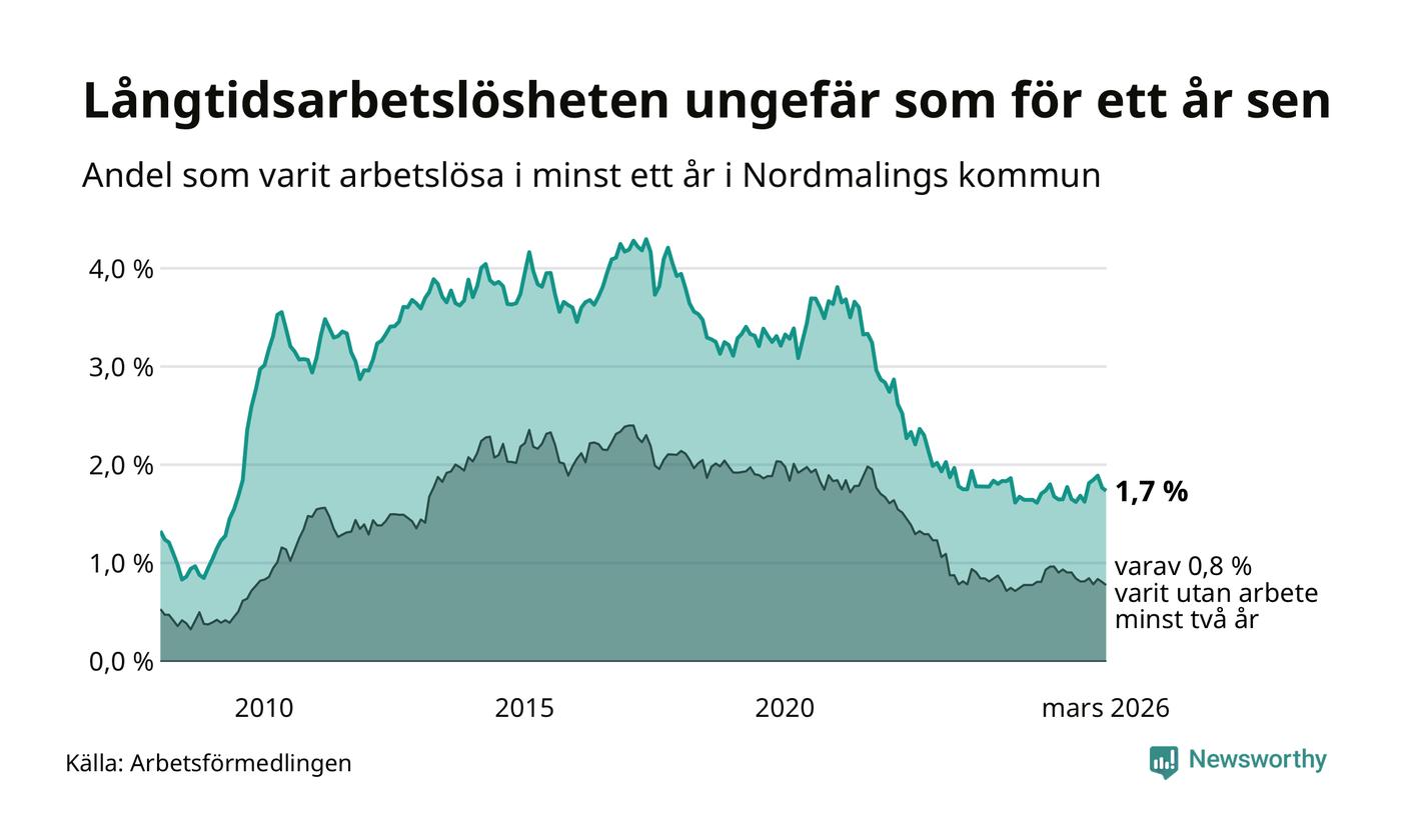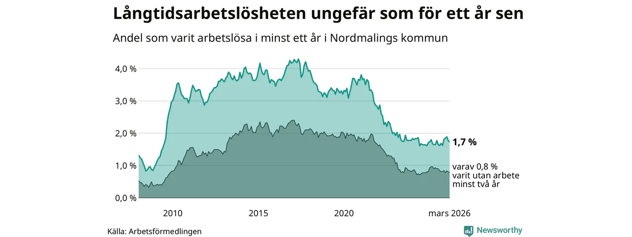 I mars hade 56 Nordmalingsbor varit arbetslösa i minst ett år, vilket är en färre än månaden innan. 56 personer motsvarar 1,7 procent av arbetskraften i kommunen – andelen långtidsarbetslösa är ungefär på samma nivå som för ett år sedan.