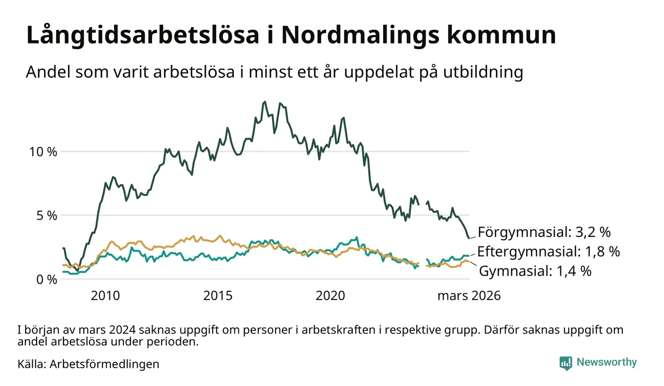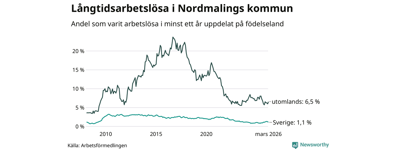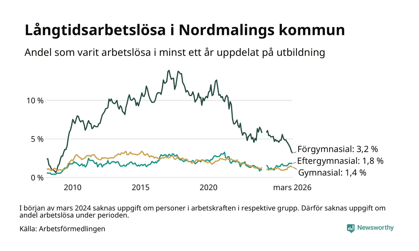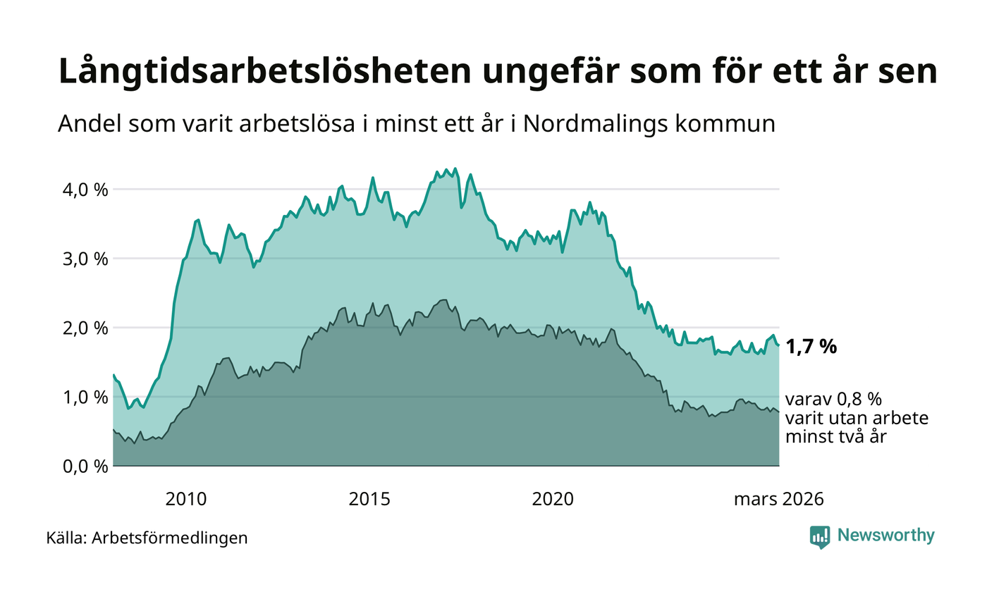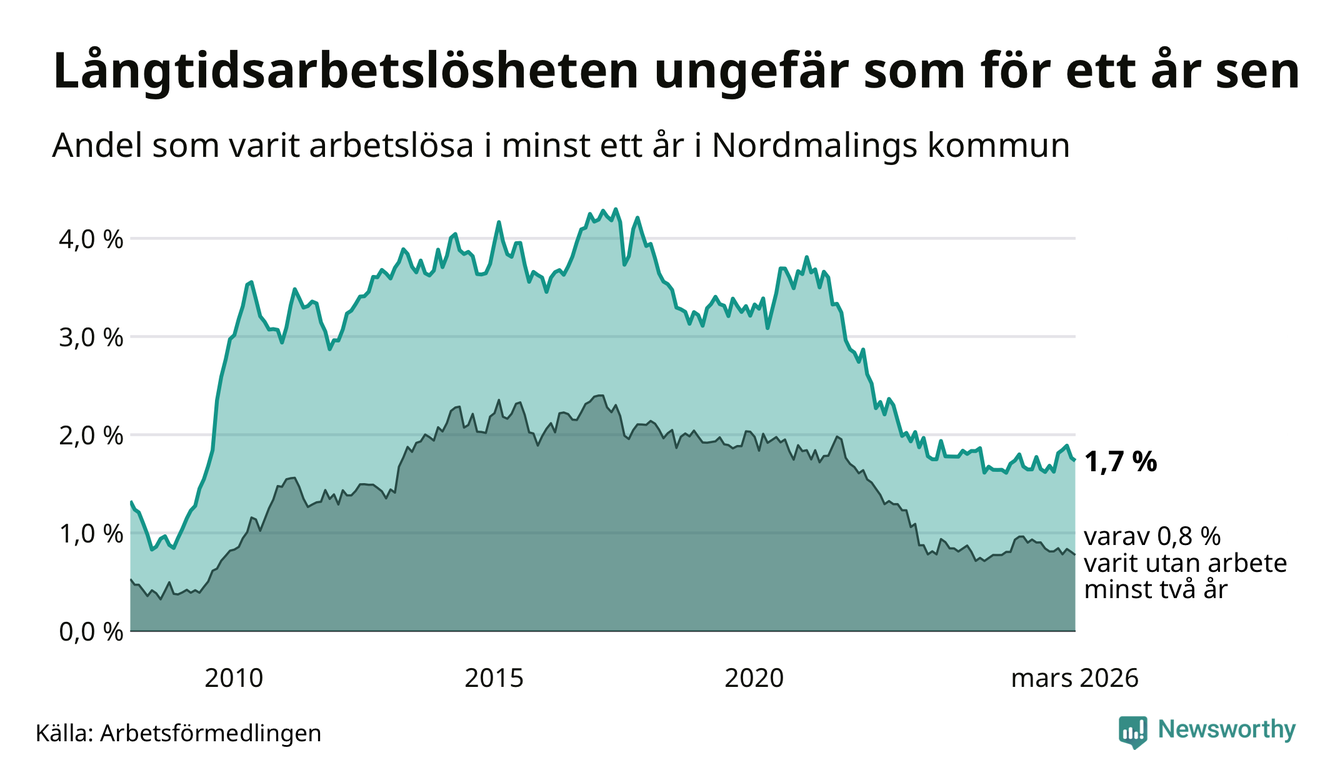 I mars hade 56 Nordmalingsbor varit arbetslösa i minst ett år, vilket är en färre än månaden innan. 56 personer motsvarar 1,7 procent av arbetskraften i kommunen – andelen långtidsarbetslösa är ungefär på samma nivå som för ett år sedan.