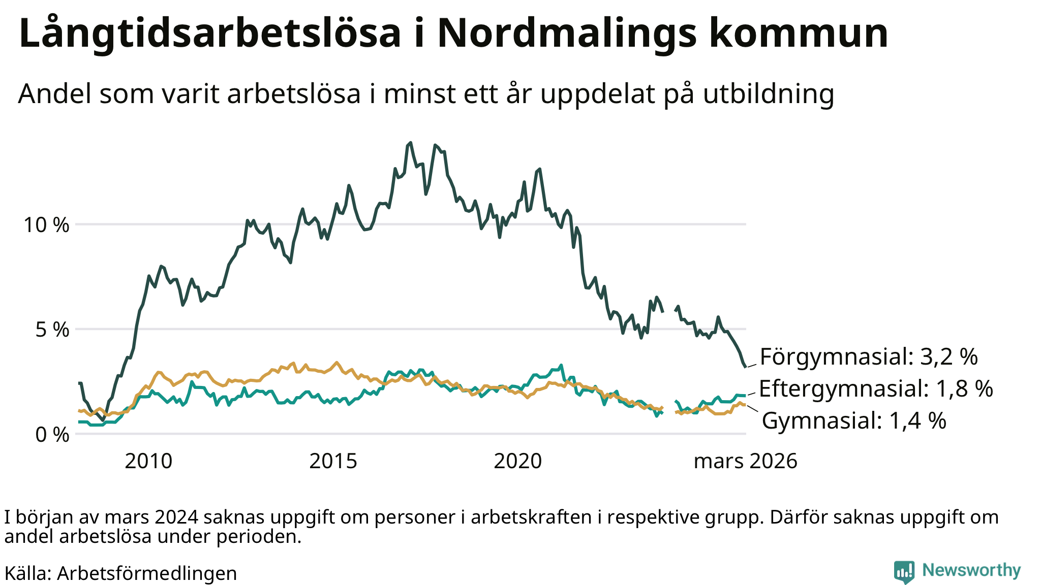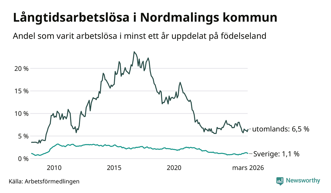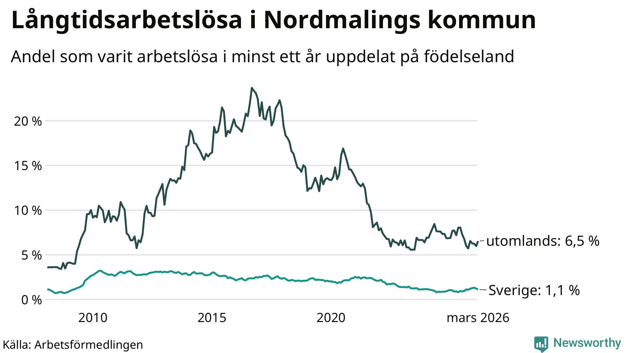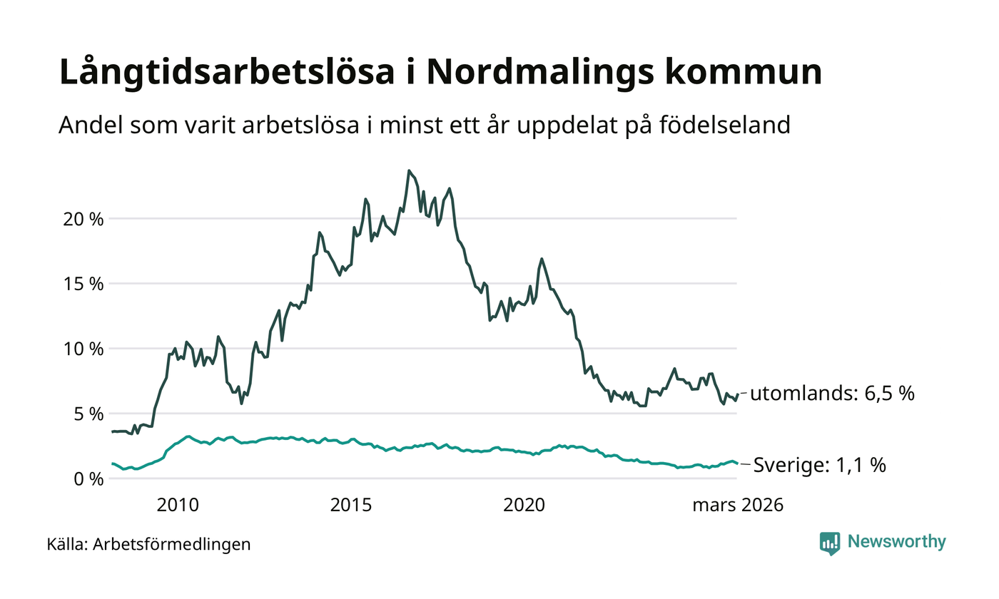 I mars hade 56 Nordmalingsbor varit arbetslösa i minst ett år, vilket är en färre än månaden innan. 56 personer motsvarar 1,7 procent av arbetskraften i kommunen – andelen långtidsarbetslösa är ungefär på samma nivå som för ett år sedan.