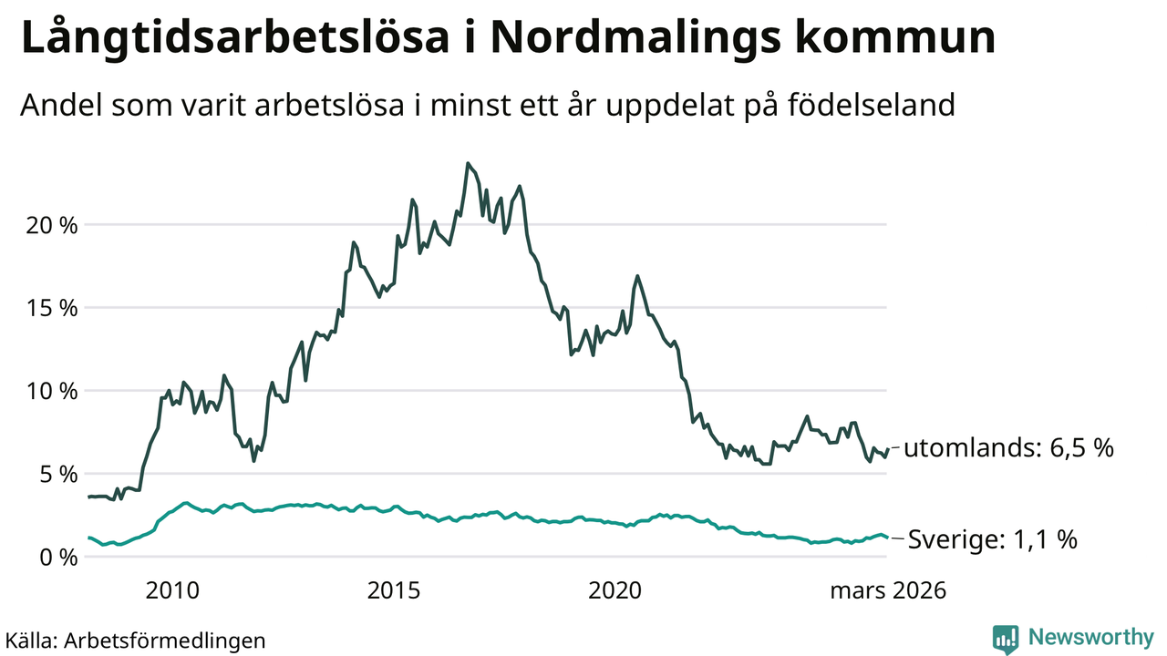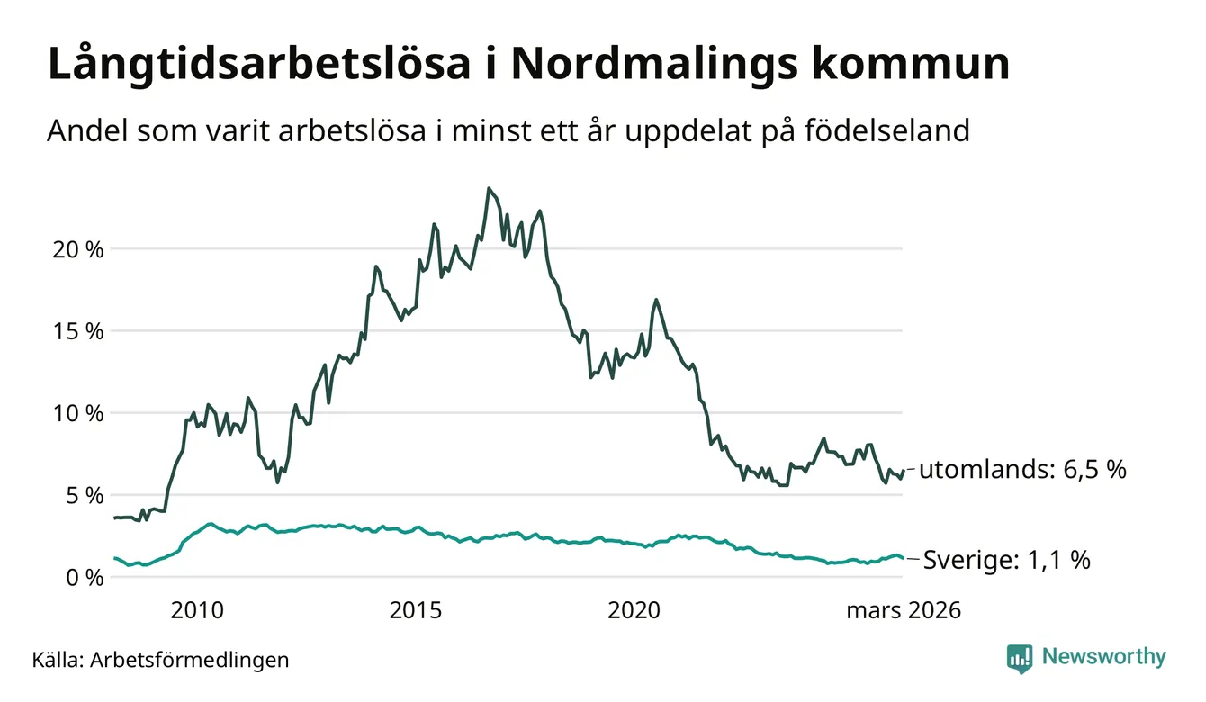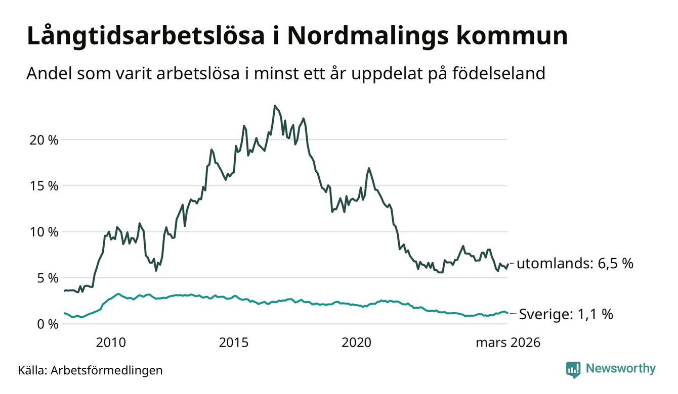 32 av de långtidsarbetslösa i Nordmaling är födda i Sverige, medan 24 är födda utomlands. Det innebär att långtidsarbetslösheten bland Sverigefödda är 1,1 procent, medan den är sex gånger så hög – 6,5 procent – bland födda utomlands. Även i riket som helhet är arbetslösheten högre bland utrikesfödda.