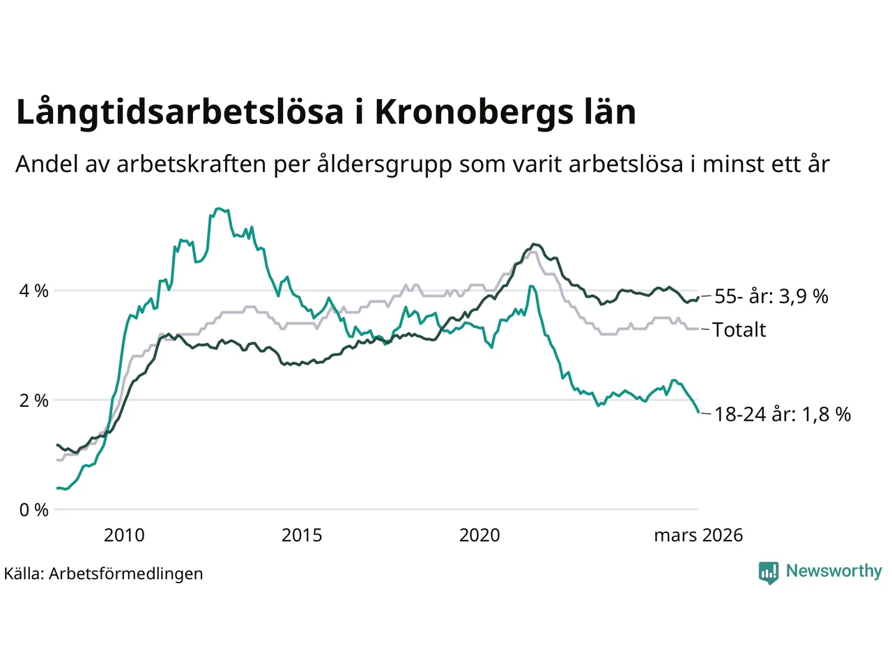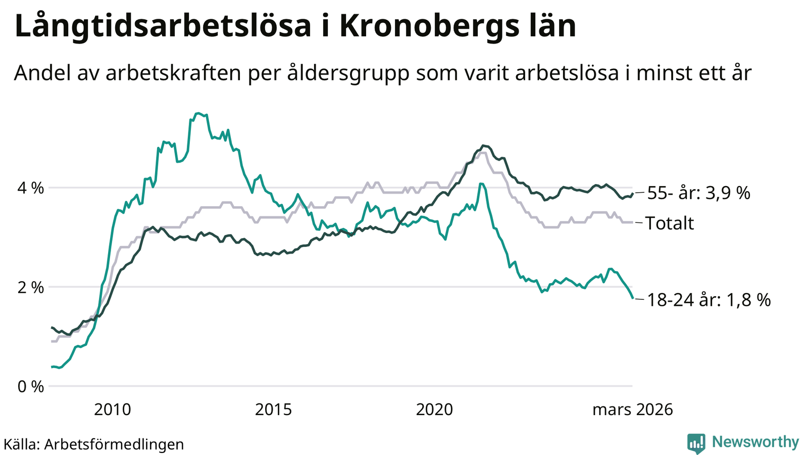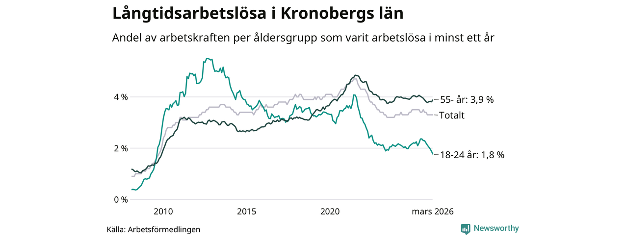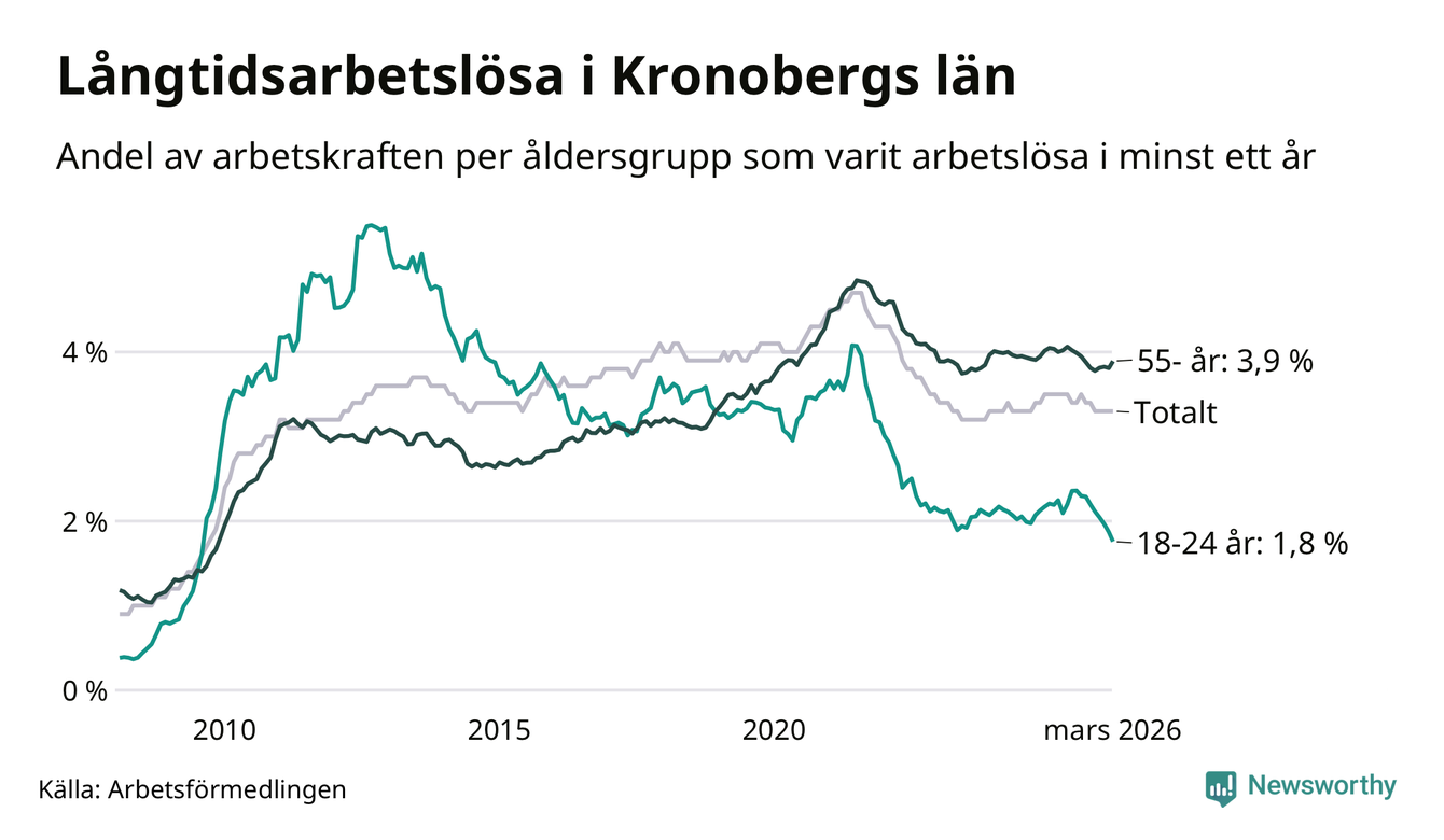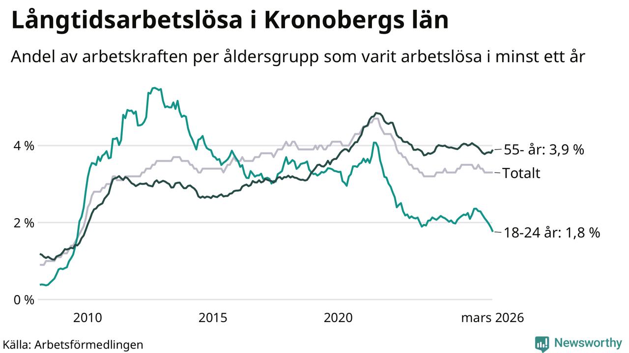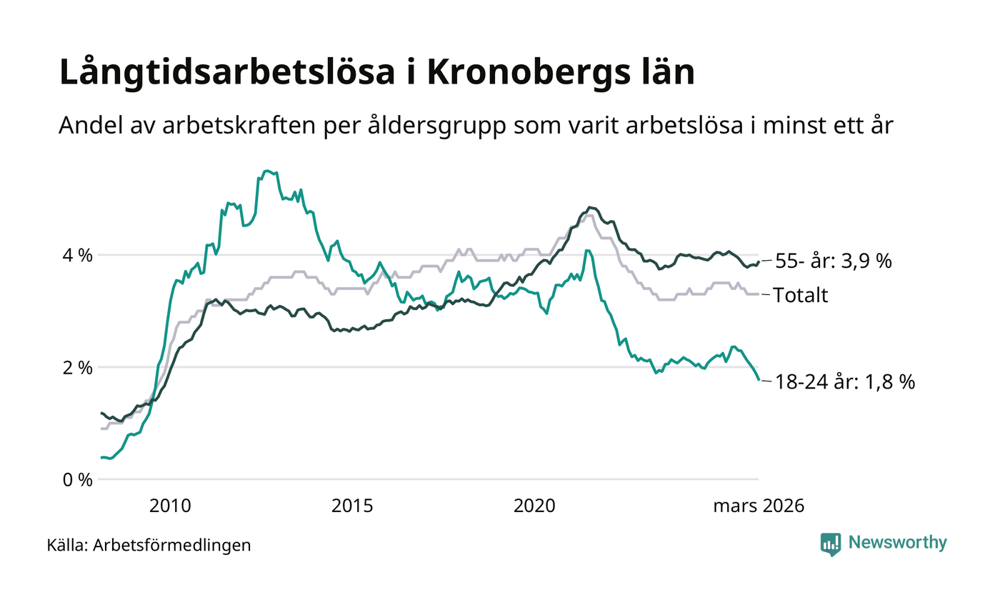 Av de 3 304 personerna som varit arbetslösa i mer än ett år i Kronobergs län är 836 personer mellan 55 och 661 år och 204 är mellan 18 och 24 år. För den äldre gruppen är andelen arbetslösa 3,9 procent medan den i den yngre gruppen är 1,8 procent. Även i riket som helhet är långtidsarbetslösheten högre i gruppen äldre.