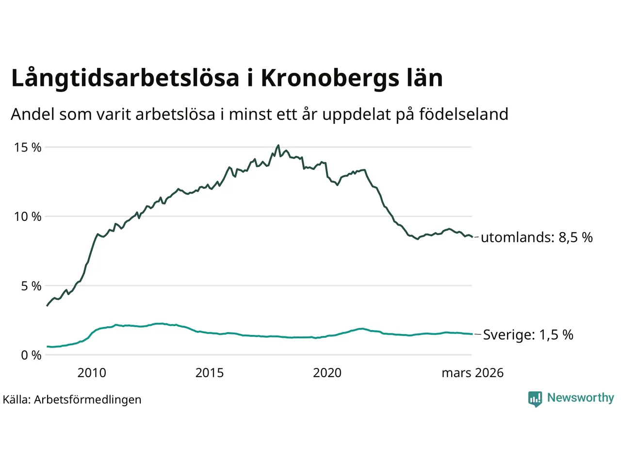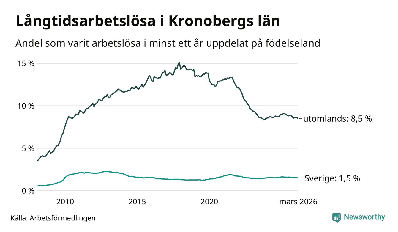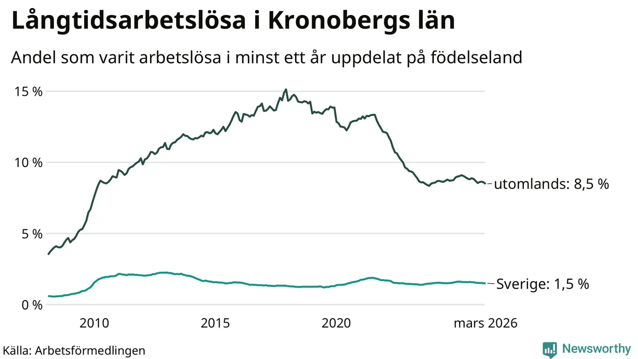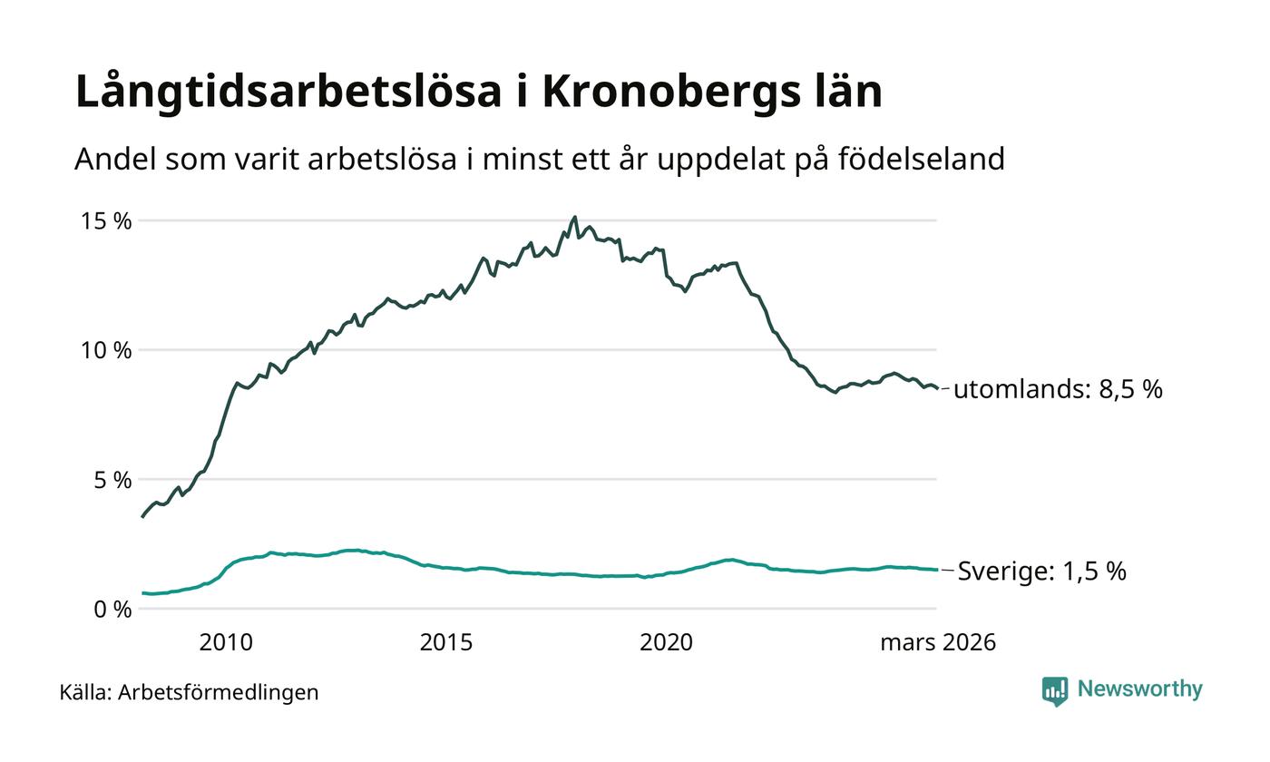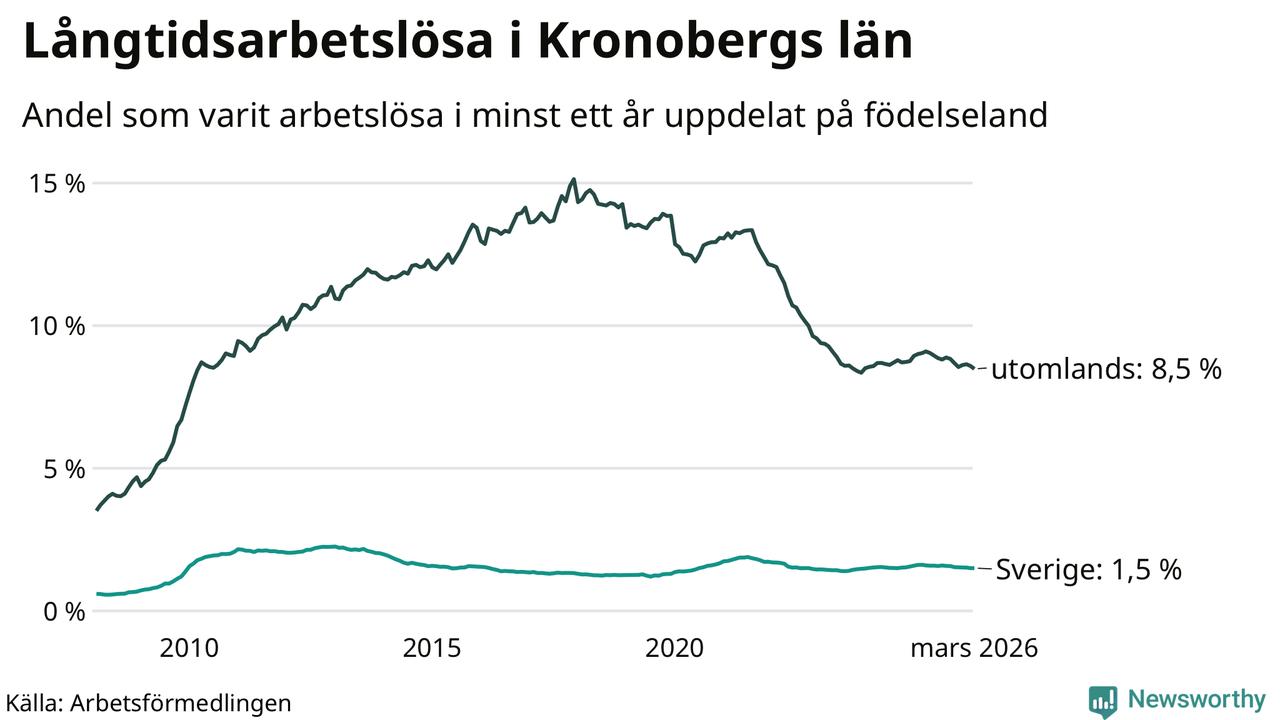 1 118 av de långtidsarbetslösa i Kronoberg är födda i Sverige och mellan 2 187 och 2 190 är födda utomlands. Det innebär att långtidsarbetslösheten bland Sverigefödda är 1,5 procent, medan den ligger på 8,5 procent för utlandsfödda.