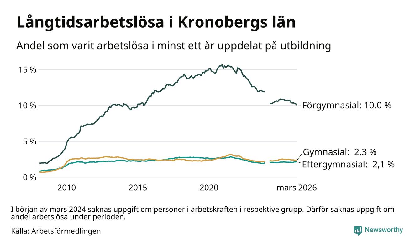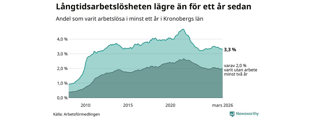 I mars hade 3 304 Kronobergsbor varit arbetslösa i minst ett år, vilket är 24 färre än månaden innan. 3 304 personer motsvarar 3,3 procent av arbetskraften i länet – andelen långtidsarbetslösa är 0,2 procentenheter lägre än samma månad för ett år sedan.