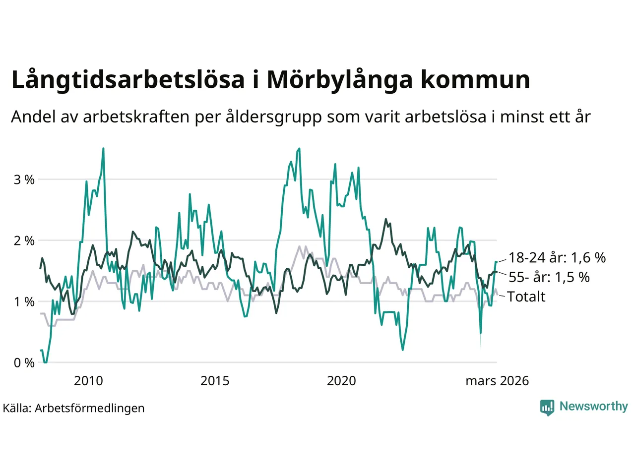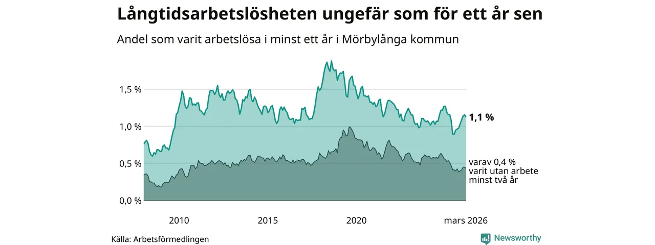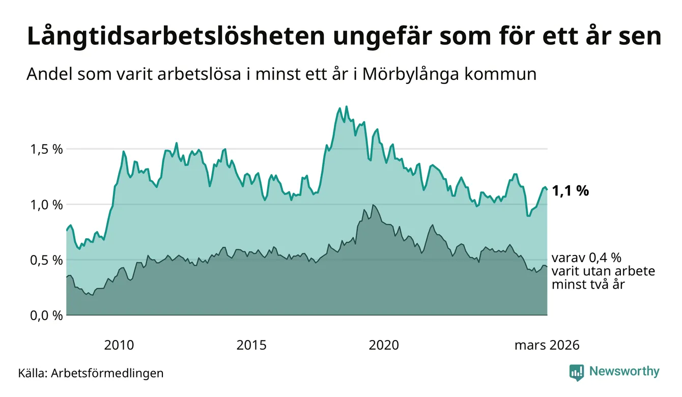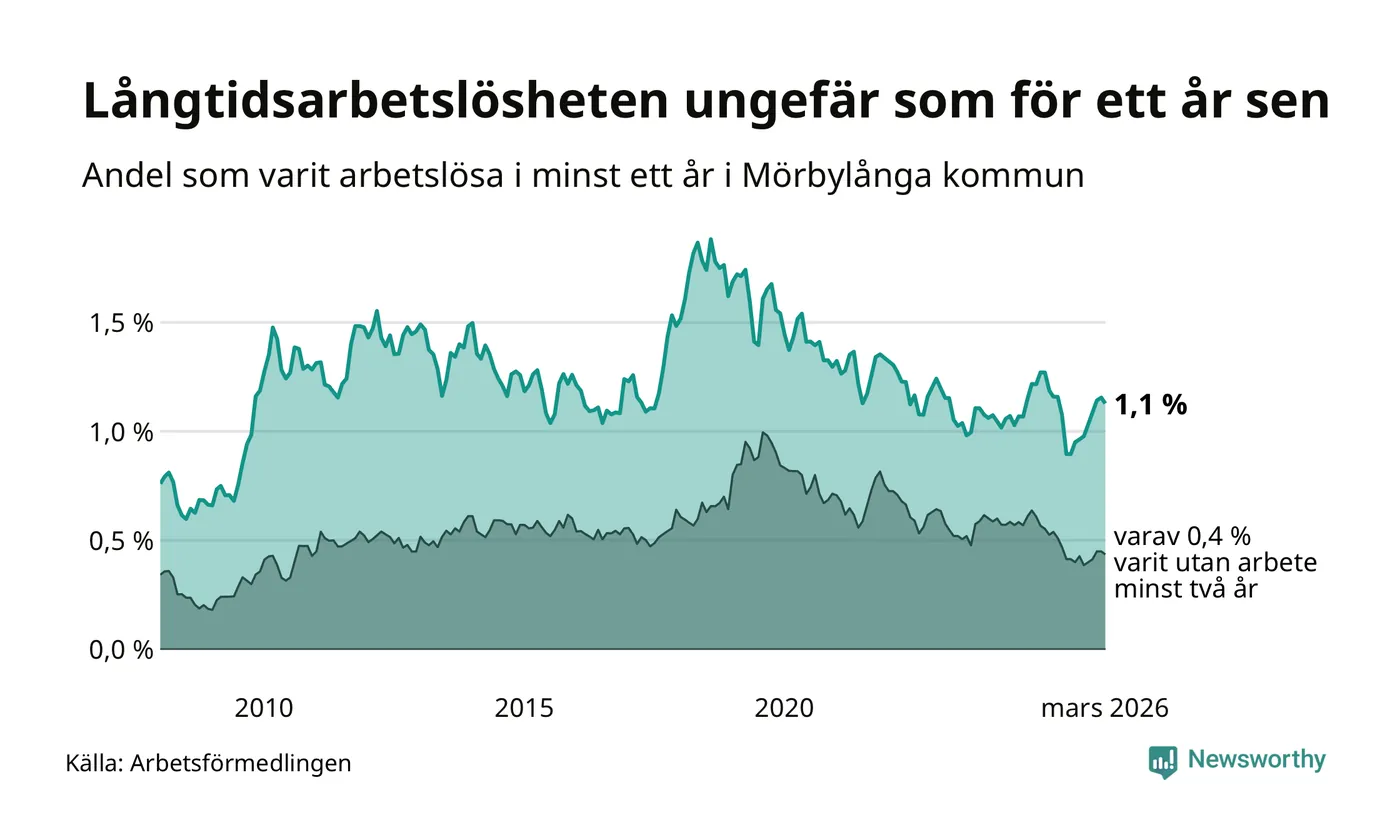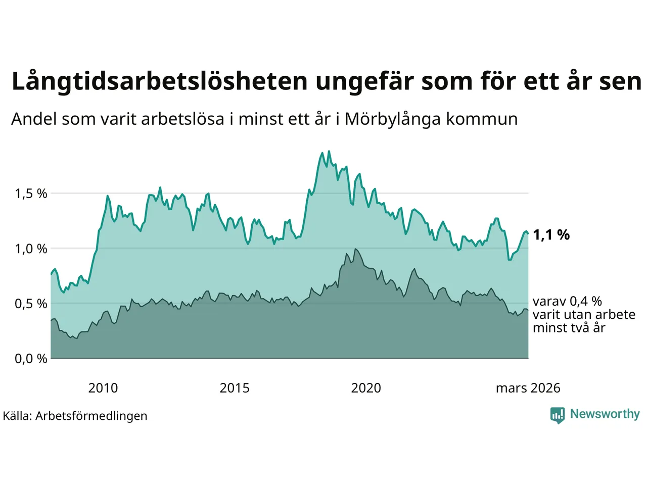 I mars hade 83 Mörbylångabor varit arbetslösa i minst ett år, vilket är två färre än månaden innan. Det är den första månaden sedan juli 2025 som antalet arbetslösa minskar. 83 personer motsvarar 1,1 procent av arbetskraften i kommunen – andelen långtidsarbetslösa är ungefär på samma nivå som för ett år sedan. Mörbylånga tillhör de kommuner som har lägst andel långtidsarbetslösa i hela landet just nu.