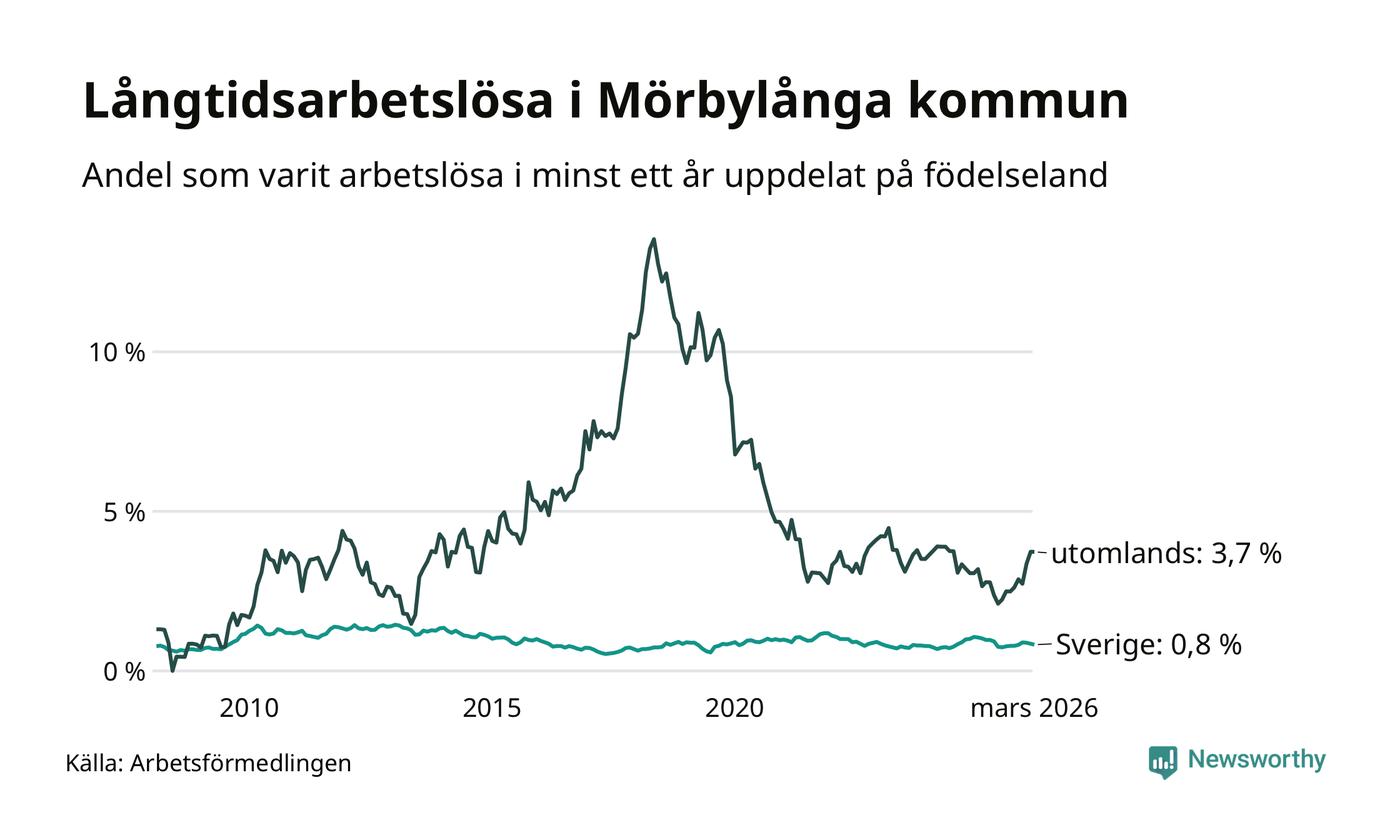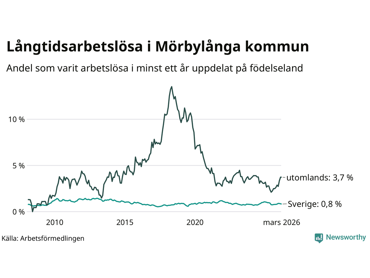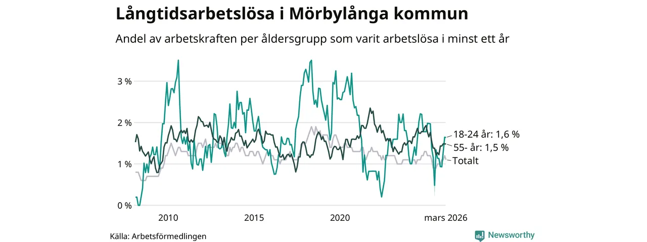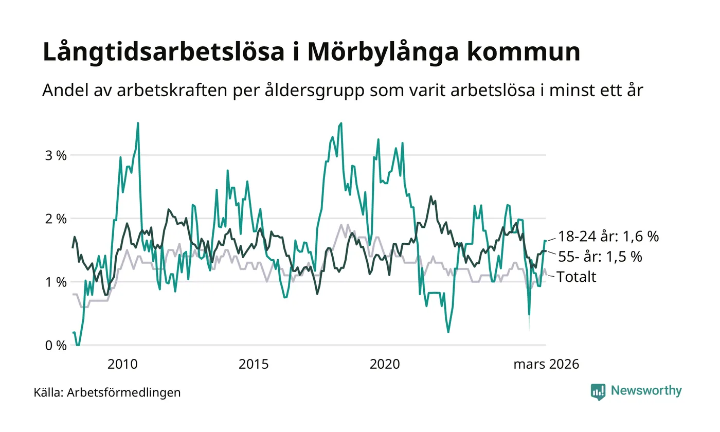 I mars hade 83 Mörbylångabor varit arbetslösa i minst ett år, vilket är två färre än månaden innan. Det är den första månaden sedan juli 2025 som antalet arbetslösa minskar. 83 personer motsvarar 1,1 procent av arbetskraften i kommunen – andelen långtidsarbetslösa är ungefär på samma nivå som för ett år sedan. Mörbylånga tillhör de kommuner som har lägst andel långtidsarbetslösa i hela landet just nu.