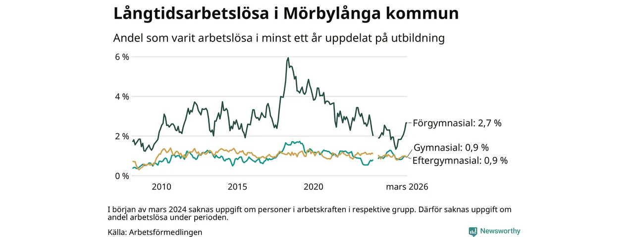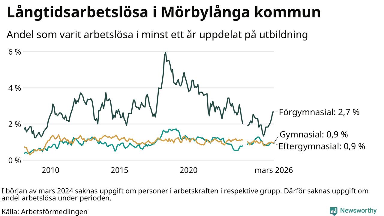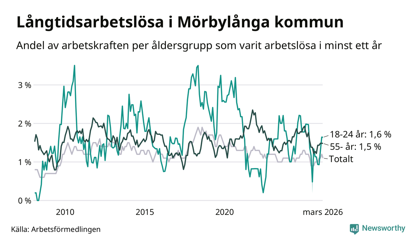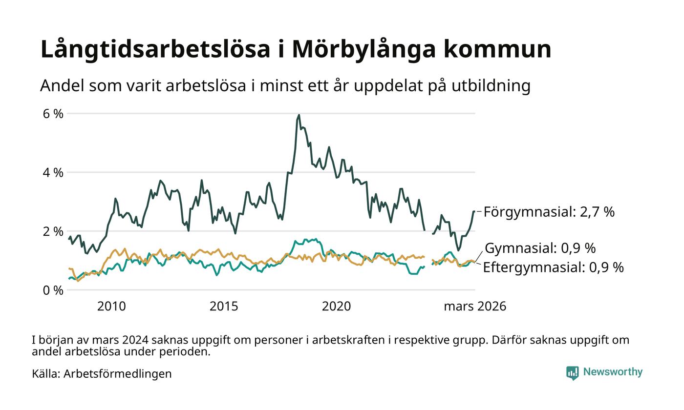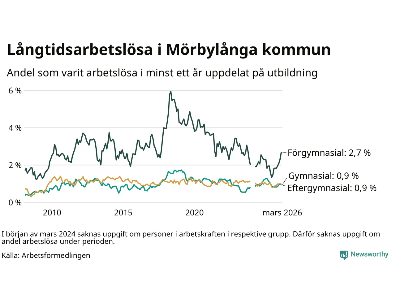 I mars hade 83 Mörbylångabor varit arbetslösa i minst ett år, vilket är två färre än månaden innan. Det är den första månaden sedan juli 2025 som antalet arbetslösa minskar. 83 personer motsvarar 1,1 procent av arbetskraften i kommunen – andelen långtidsarbetslösa är ungefär på samma nivå som för ett år sedan. Mörbylånga tillhör de kommuner som har lägst andel långtidsarbetslösa i hela landet just nu.