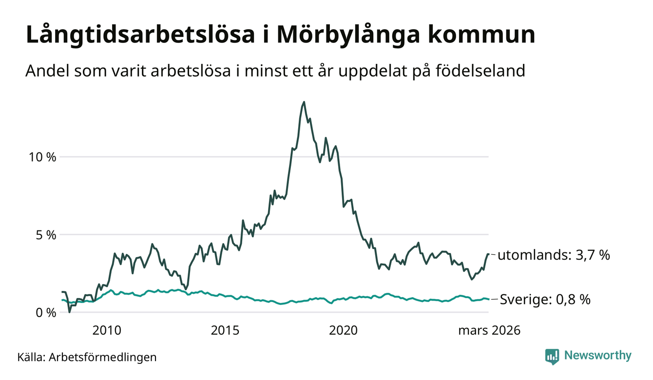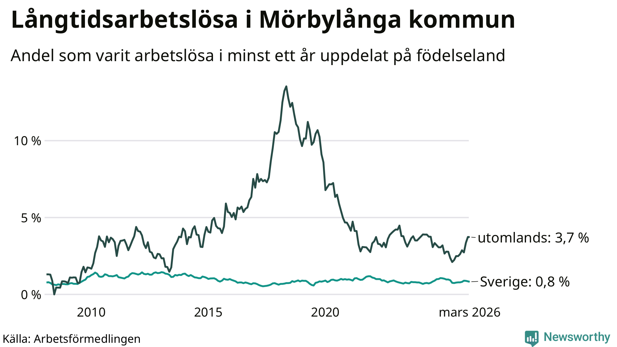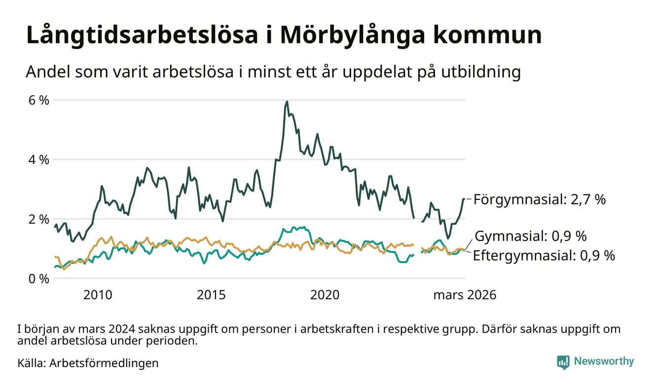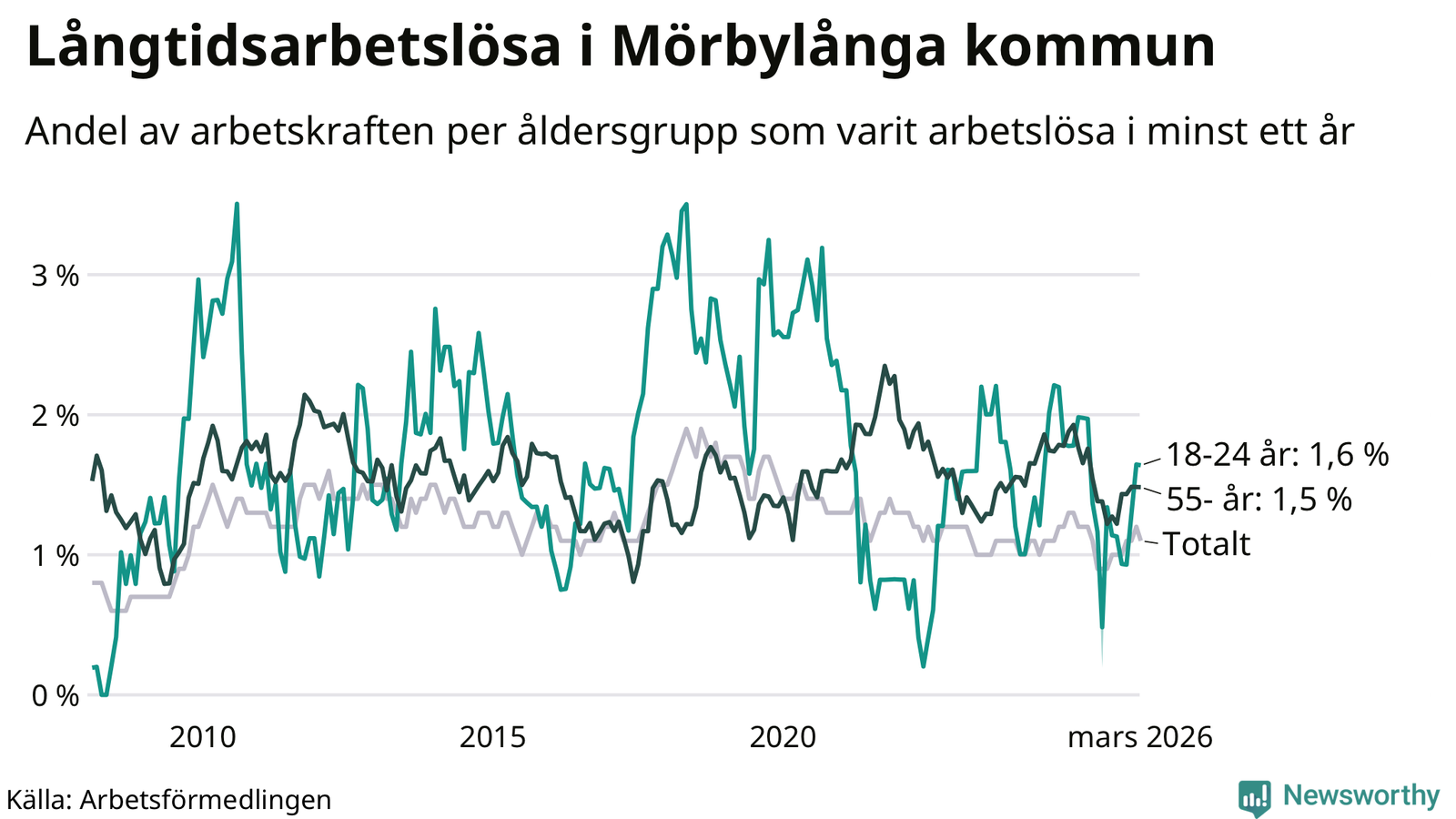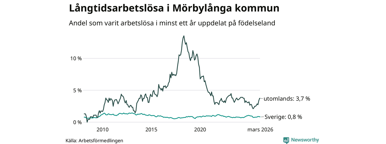 I mars hade 83 Mörbylångabor varit arbetslösa i minst ett år, vilket är två färre än månaden innan. Det är den första månaden sedan juli 2025 som antalet arbetslösa minskar. 83 personer motsvarar 1,1 procent av arbetskraften i kommunen – andelen långtidsarbetslösa är ungefär på samma nivå som för ett år sedan. Mörbylånga tillhör de kommuner som har lägst andel långtidsarbetslösa i hela landet just nu.