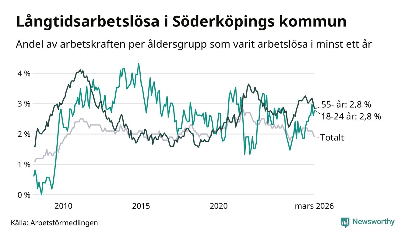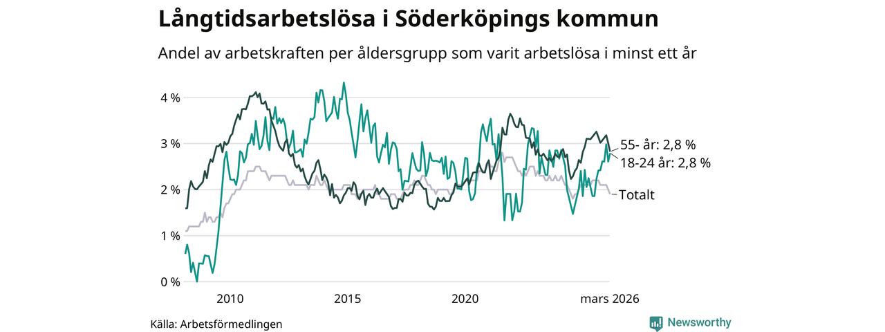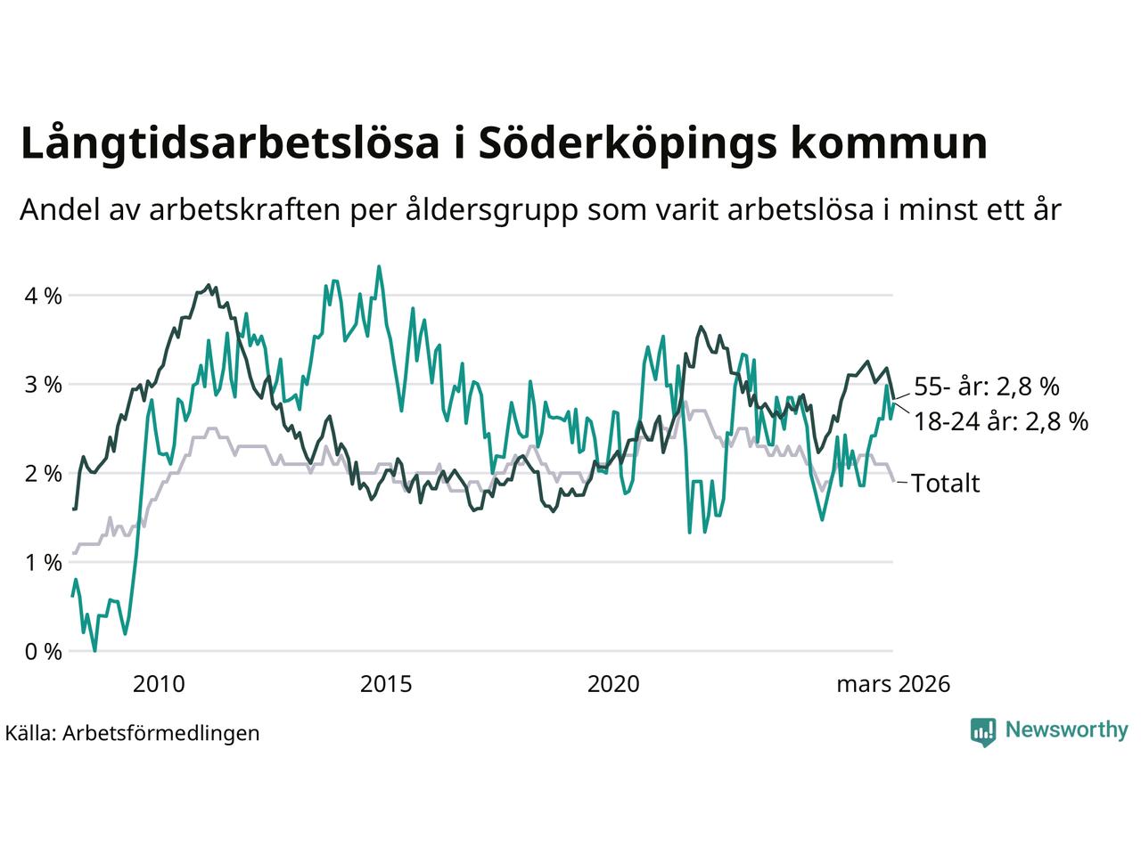 Av de 134 personerna som varit arbetslösa i mer än ett år i Söderköpings kommun är 49 personer mellan 55 och 661 år och 15 är mellan 18 och 24 år.