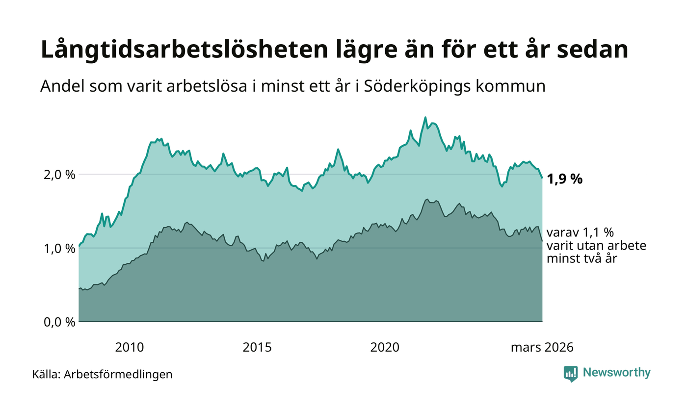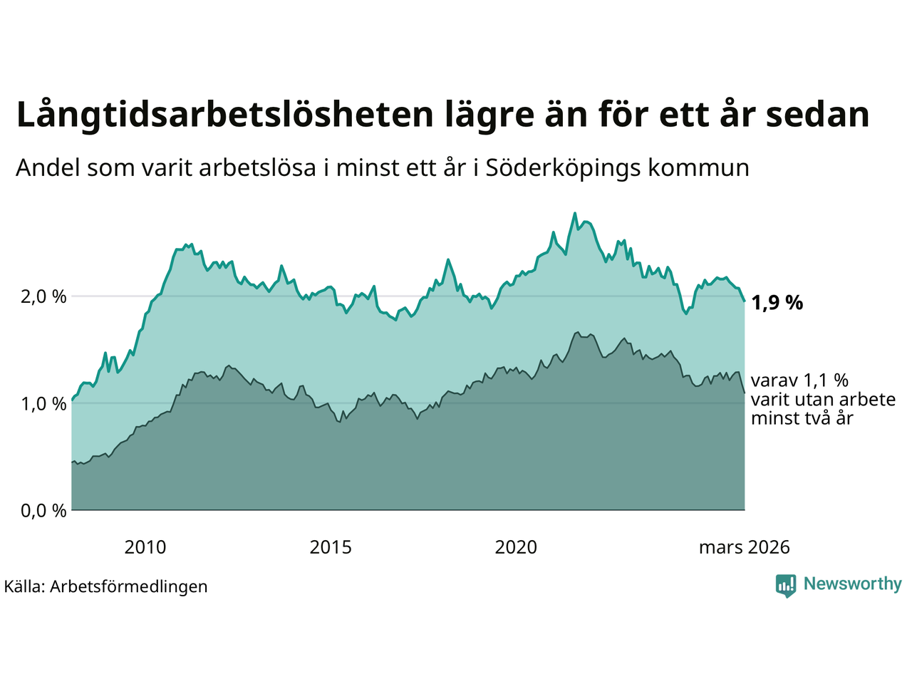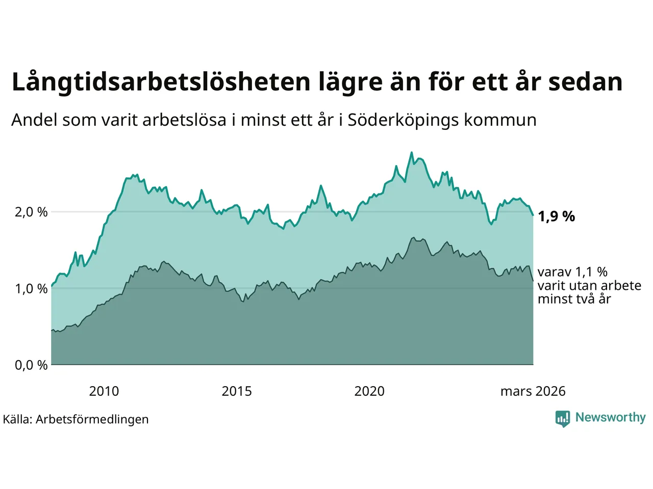 I mars hade 134 Söderköpingsbor varit arbetslösa i minst ett år, vilket är fyra färre än månaden innan. 134 personer motsvarar 1,9 procent av arbetskraften i kommunen – andelen långtidsarbetslösa är 0,2 procentenheter lägre än samma månad för ett år sedan.