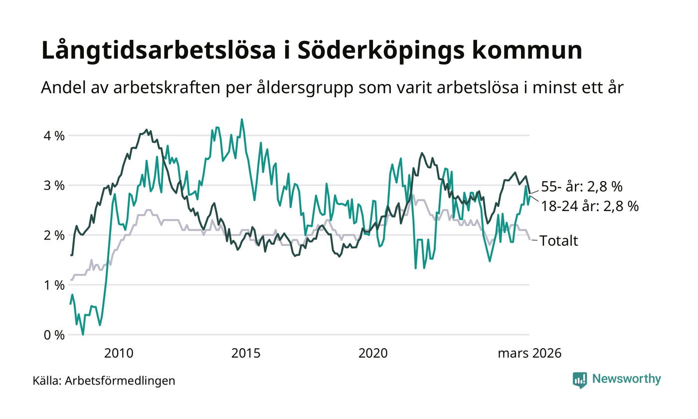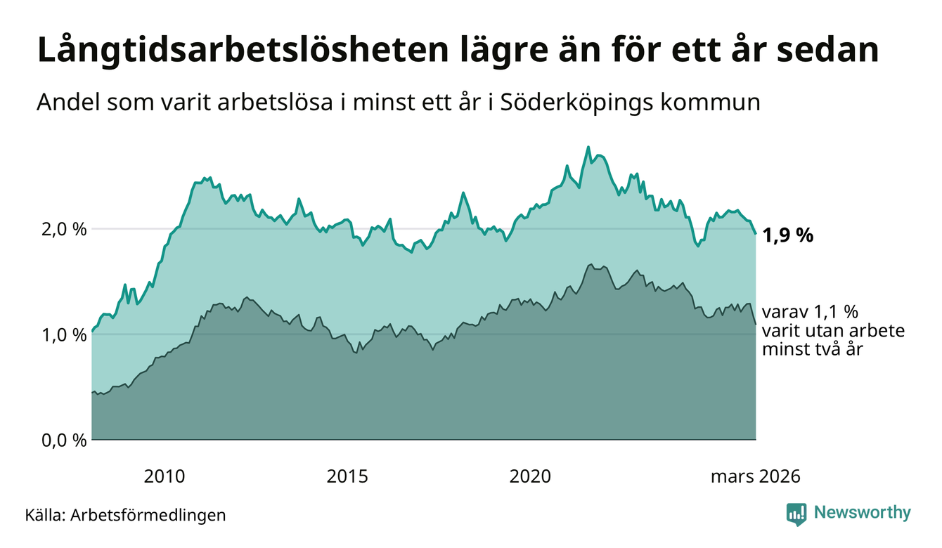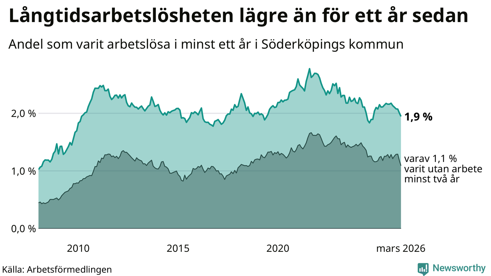 I mars hade 134 Söderköpingsbor varit arbetslösa i minst ett år, vilket är fyra färre än månaden innan. 134 personer motsvarar 1,9 procent av arbetskraften i kommunen – andelen långtidsarbetslösa är 0,2 procentenheter lägre än samma månad för ett år sedan.