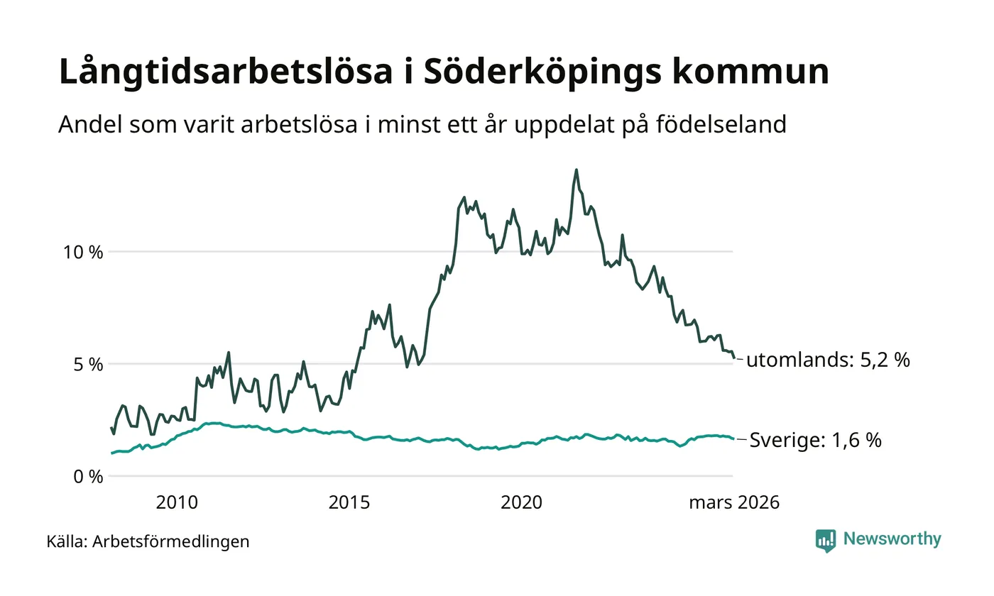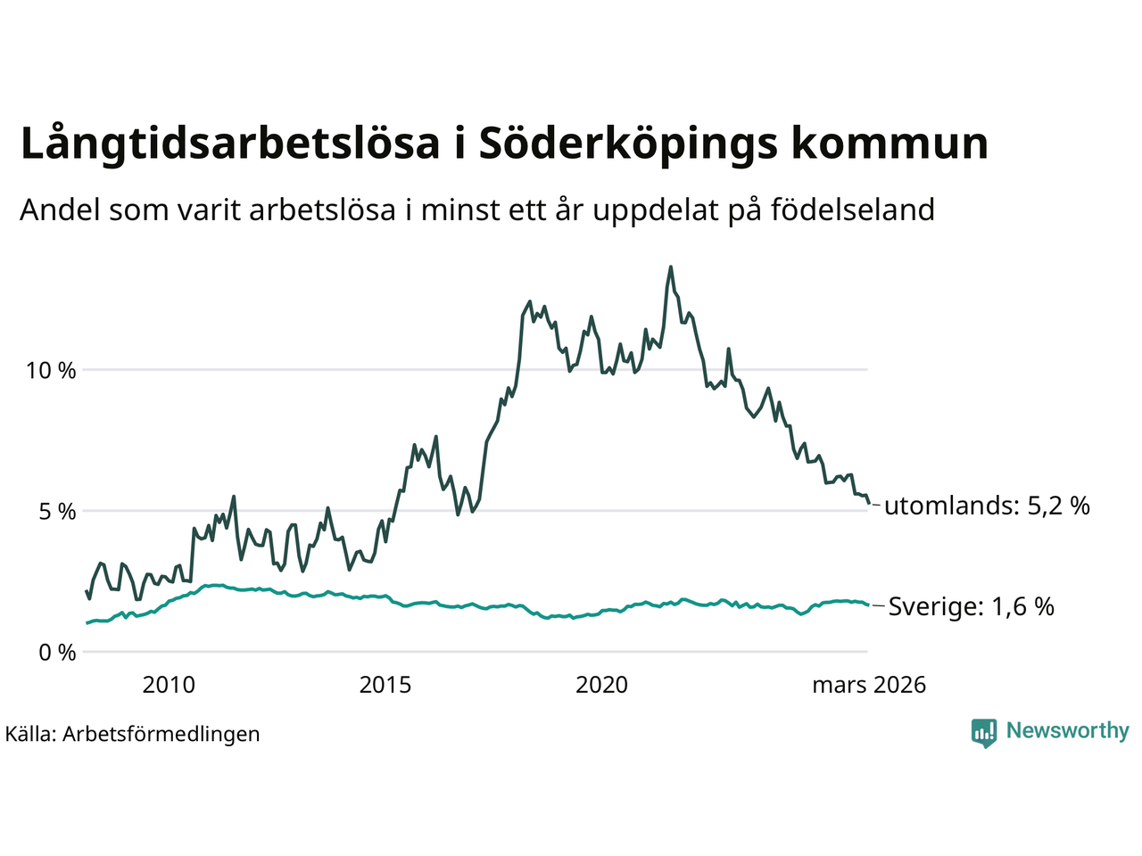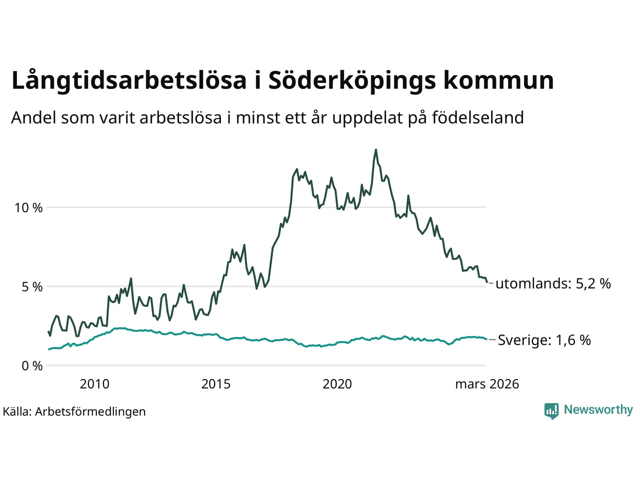 104 av de långtidsarbetslösa i Söderköping är födda i Sverige, medan 30 är födda utomlands. Det innebär att långtidsarbetslösheten bland Sverigefödda är 1,6 procent, medan den är tre gånger så hög – 5,2 procent – bland födda utomlands. Även i riket som helhet är arbetslösheten högre bland utrikesfödda.