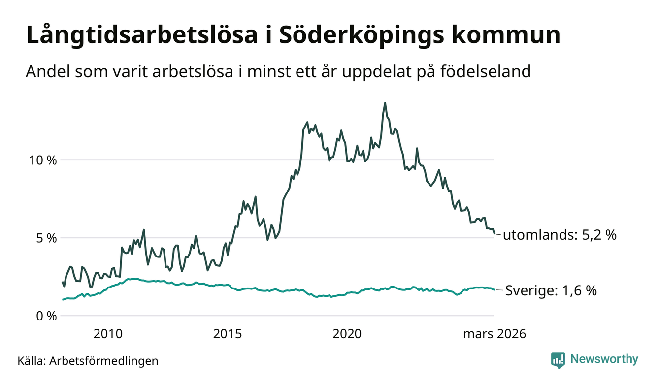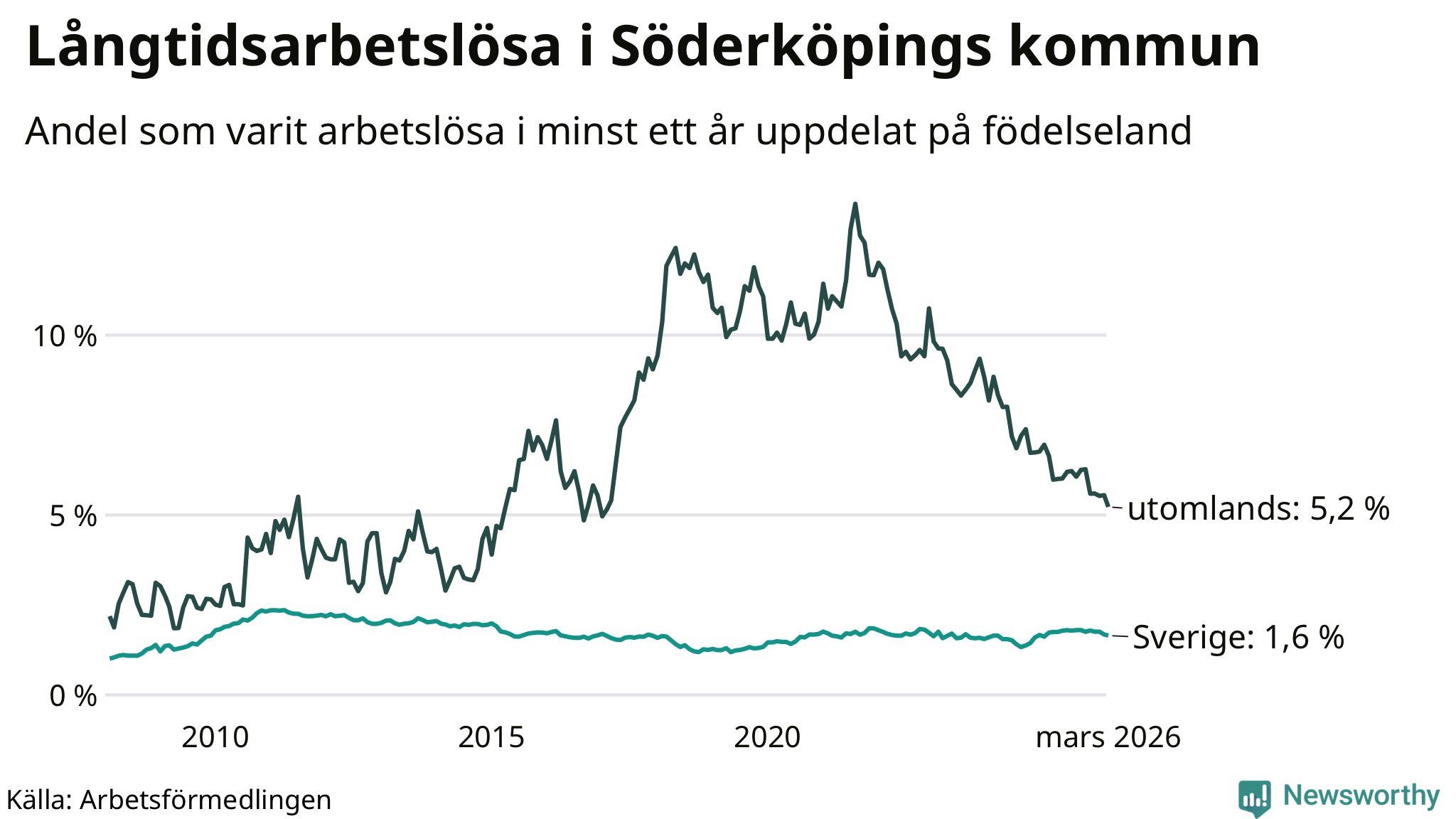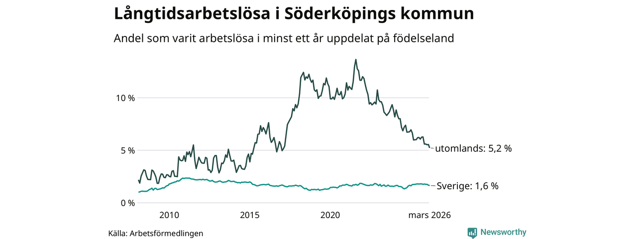 104 av de långtidsarbetslösa i Söderköping är födda i Sverige, medan 30 är födda utomlands. Det innebär att långtidsarbetslösheten bland Sverigefödda är 1,6 procent, medan den är tre gånger så hög – 5,2 procent – bland födda utomlands. Även i riket som helhet är arbetslösheten högre bland utrikesfödda.