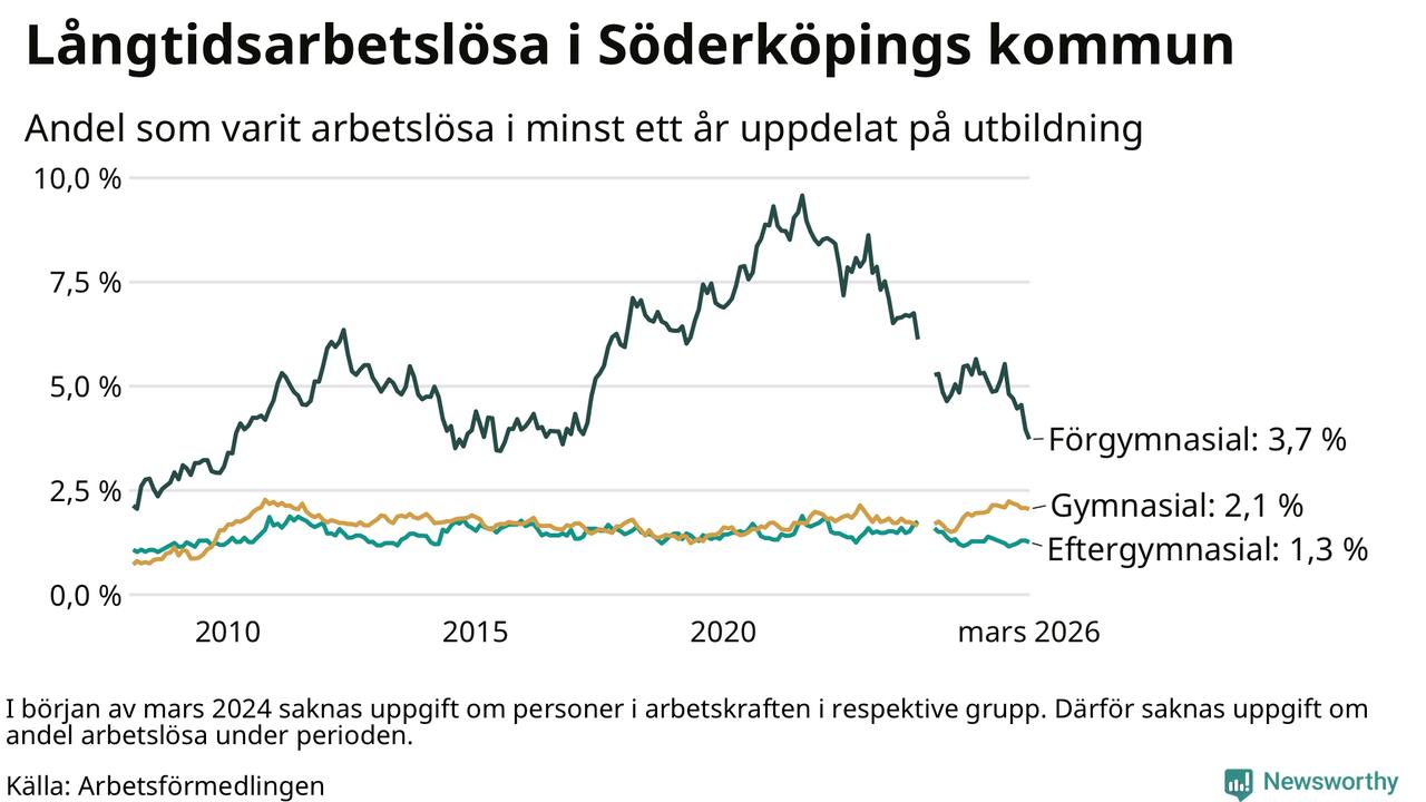 Graf över andel långtidsarbetslösa i Söderköping uppdelat på utbildningsnivå