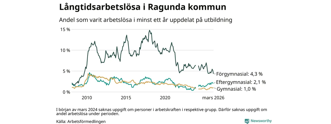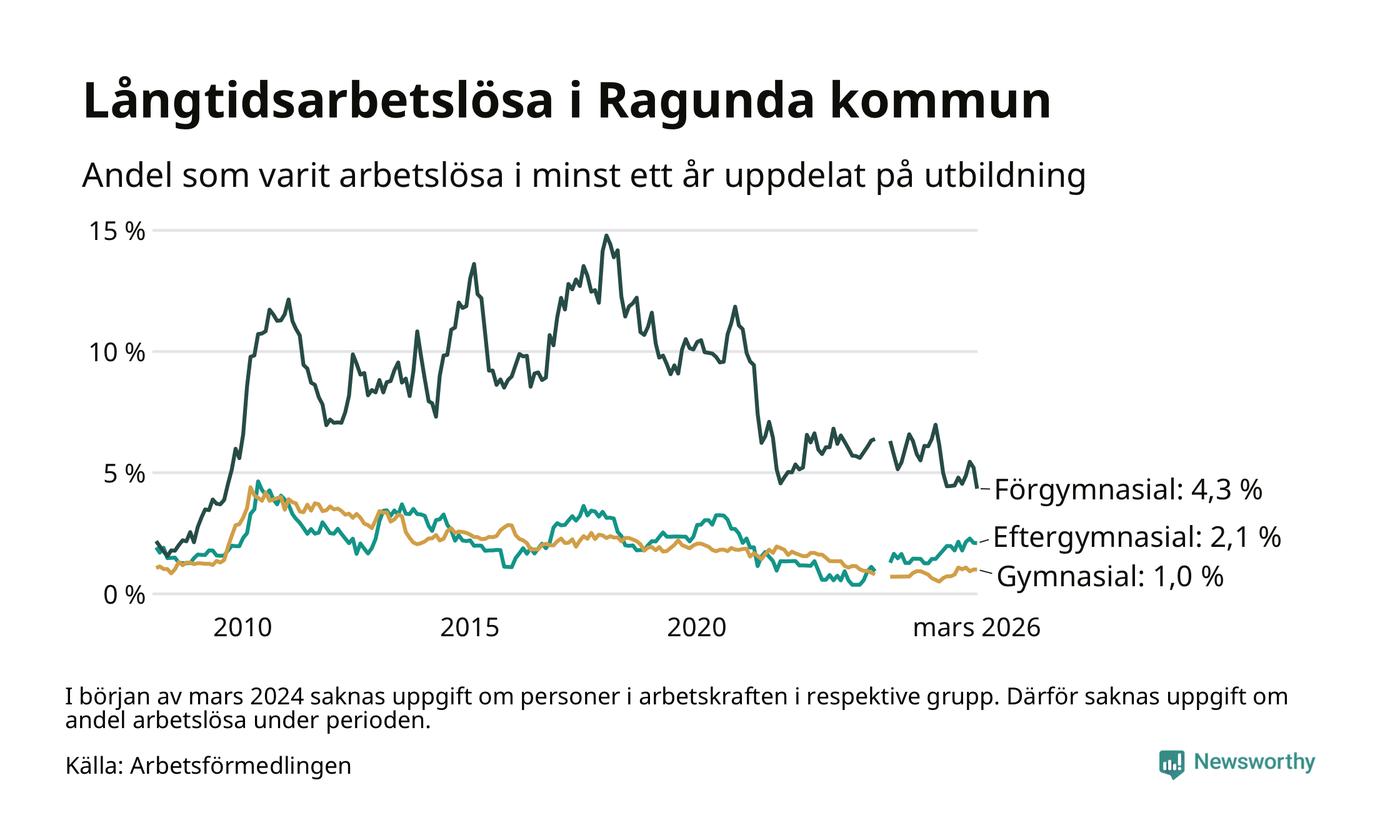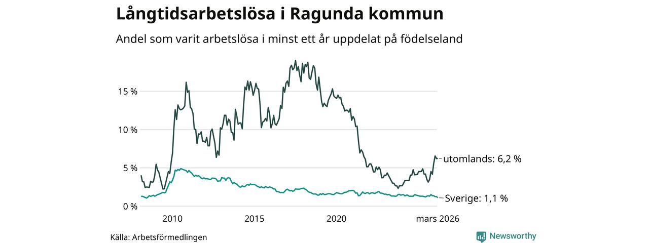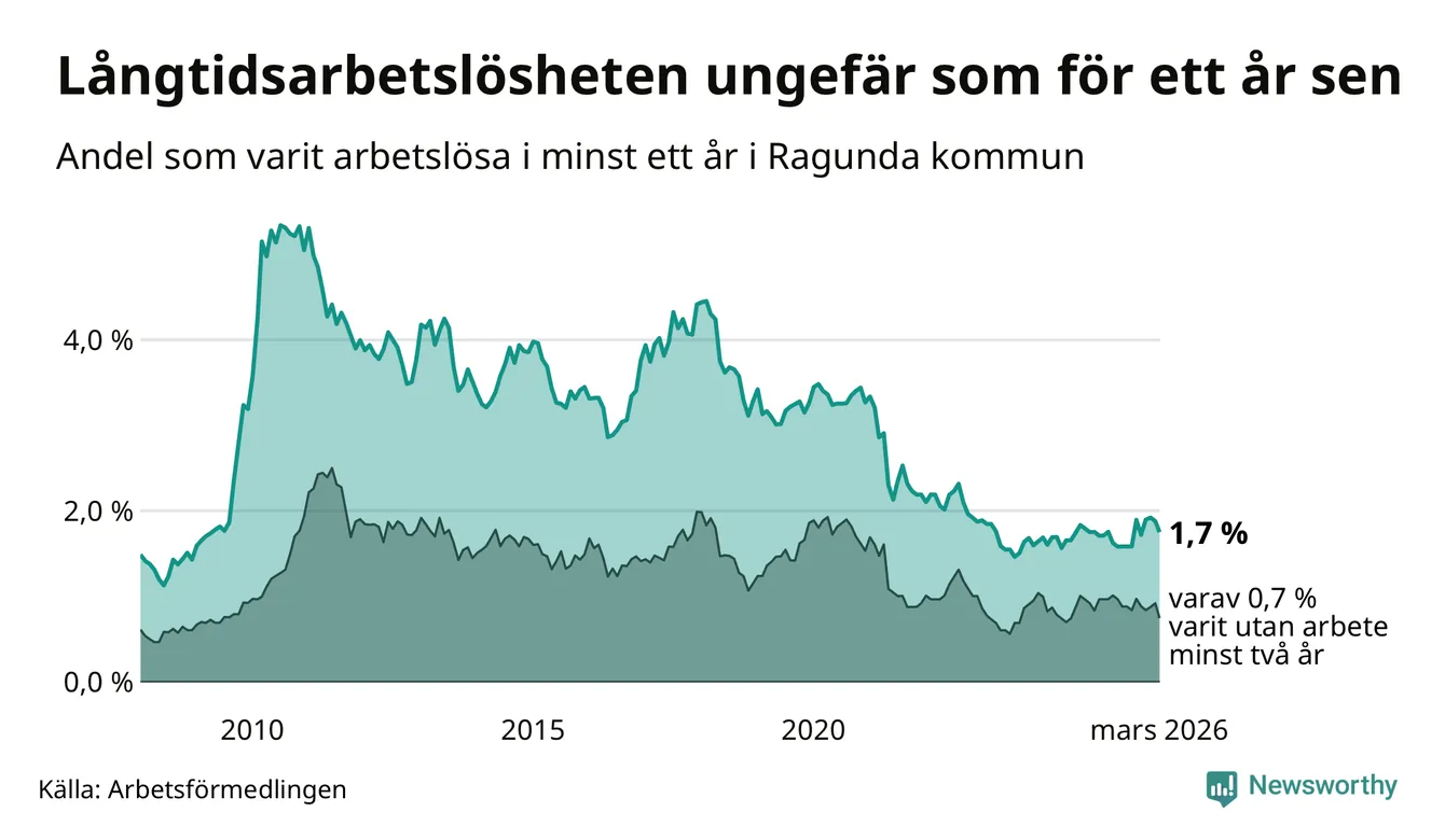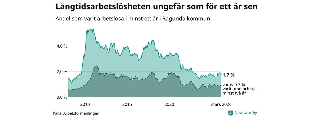 I mars hade 40 Ragundabor varit arbetslösa i minst ett år, vilket är tre färre än månaden innan. 40 personer motsvarar 1,7 procent av arbetskraften i kommunen – andelen långtidsarbetslösa är ungefär på samma nivå som för ett år sedan.