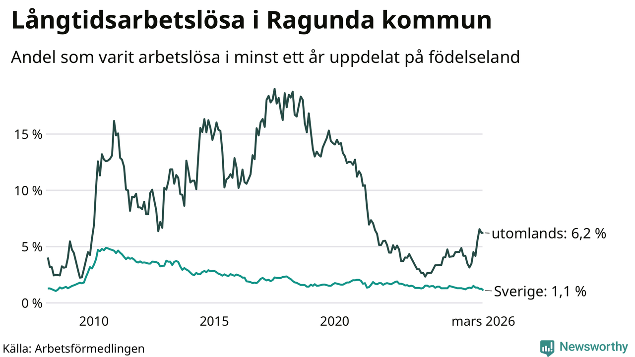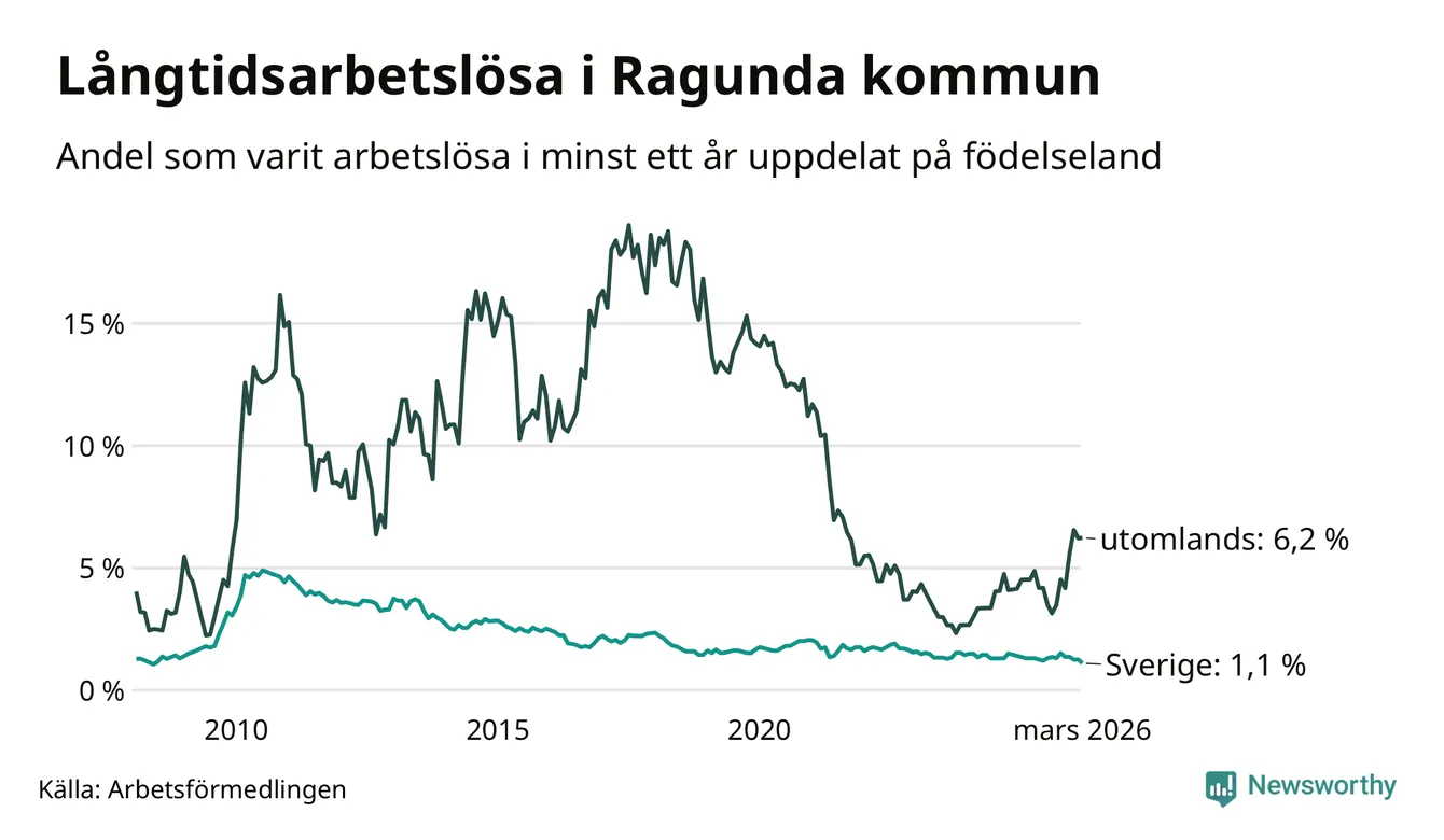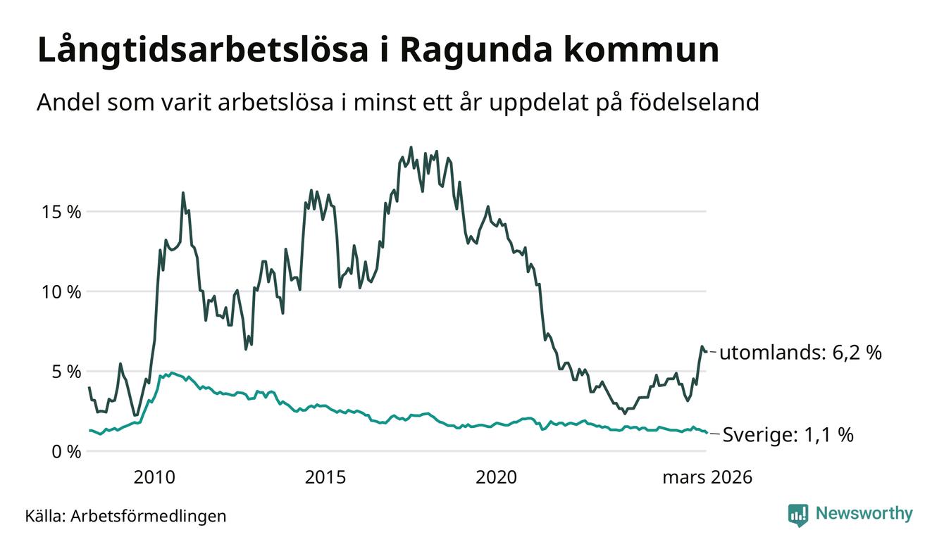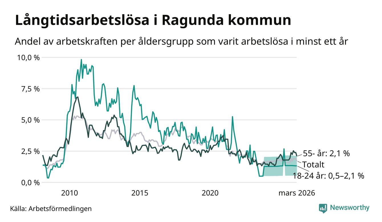 I mars hade 40 Ragundabor varit arbetslösa i minst ett år, vilket är tre färre än månaden innan. 40 personer motsvarar 1,7 procent av arbetskraften i kommunen – andelen långtidsarbetslösa är ungefär på samma nivå som för ett år sedan.