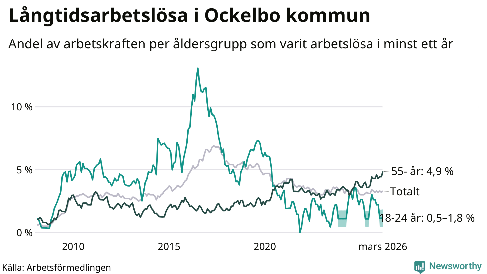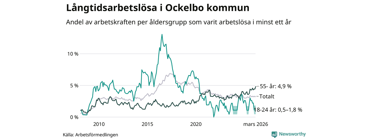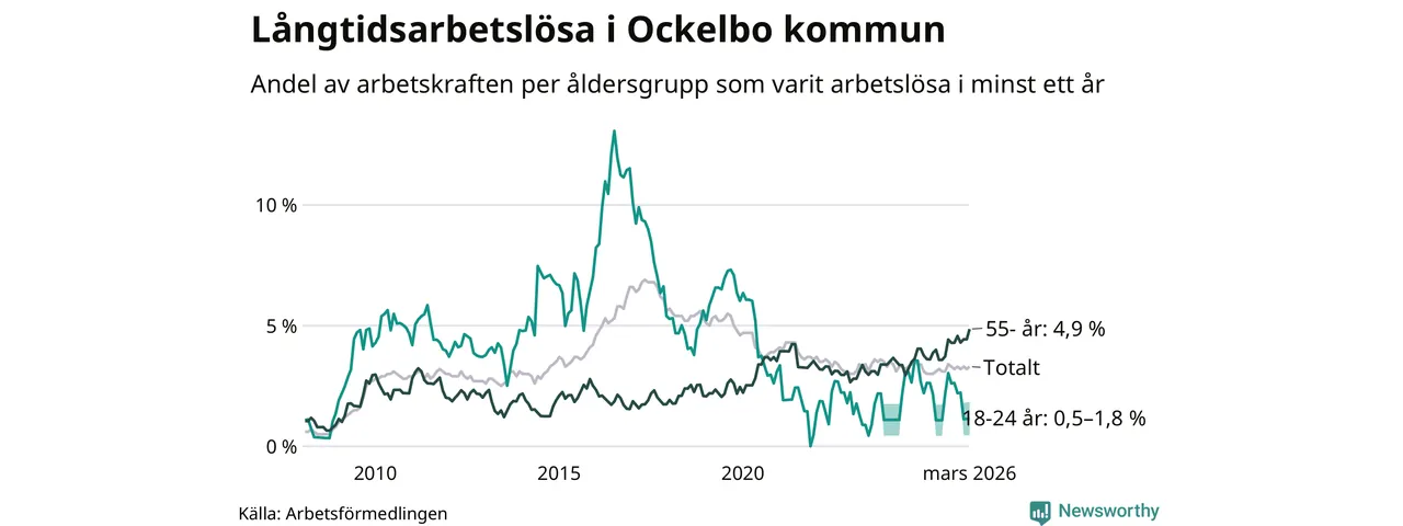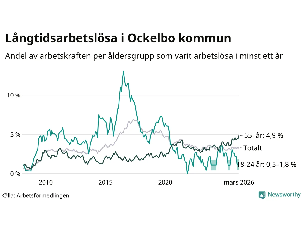 Av de 84 personerna som varit arbetslösa i mer än ett år i Ockelbo kommun är 35 personer mellan 55 och 661 år och mellan en och fyra är mellan 18 och 24 år. För den äldre gruppen är andelen arbetslösa 4,9 procent medan den i den yngre gruppen är mellan 0,5 och 1,8 procent. Även i riket som helhet är långtidsarbetslösheten högre i gruppen äldre.