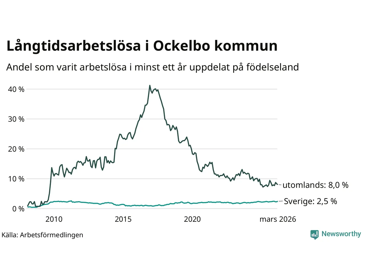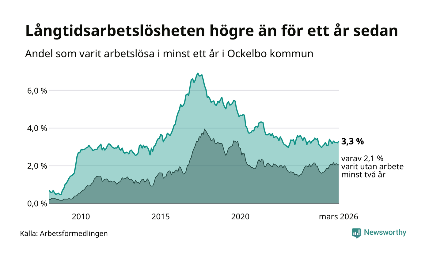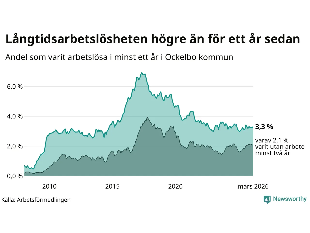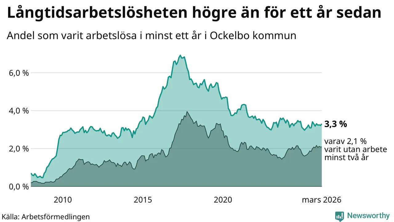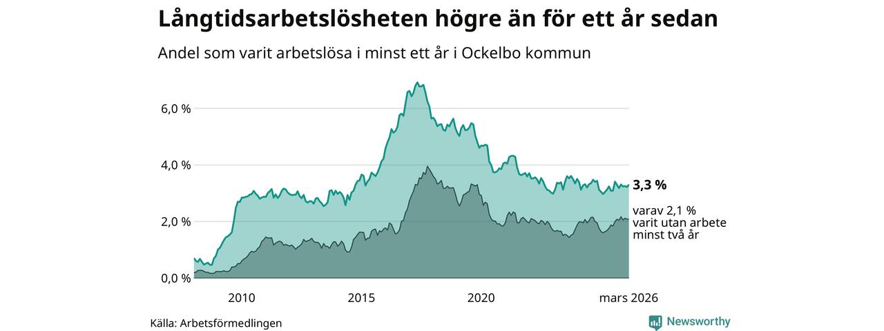 Andelen som varit utan arbete i minst ett år i Ockelbo var högre i mars jämfört med samma månad för ett år sedan. Det visar Arbetsfömedlingens senaste månadsstatistik.