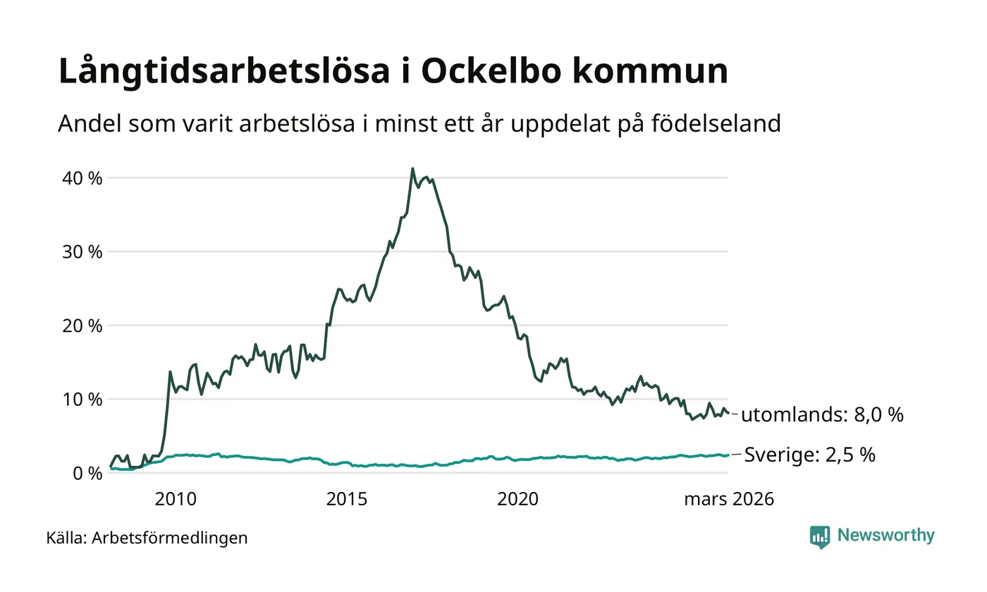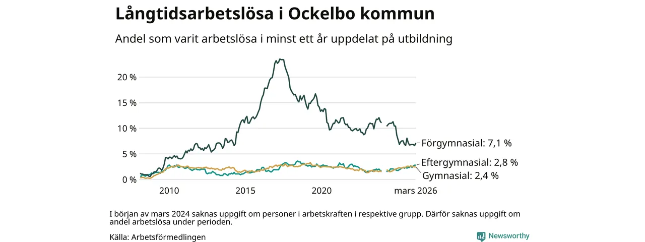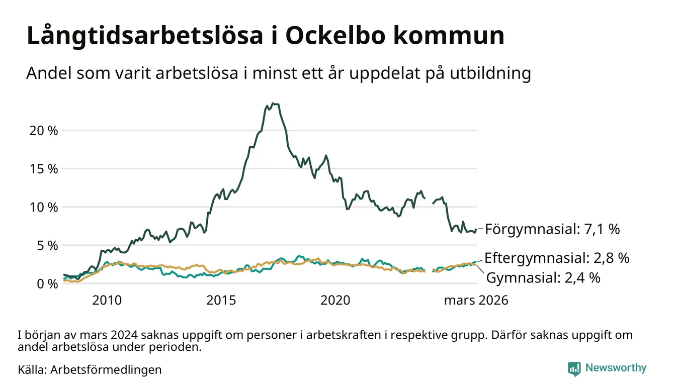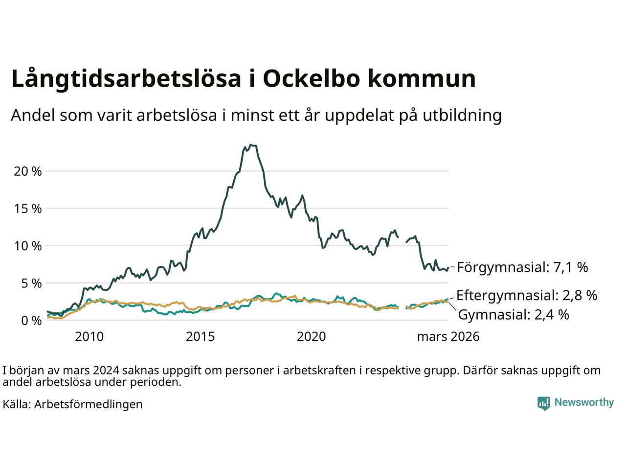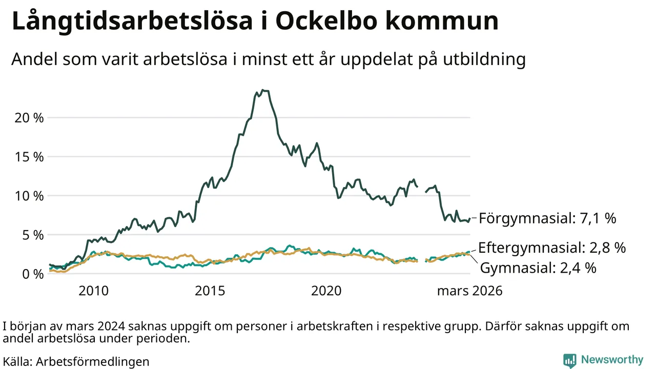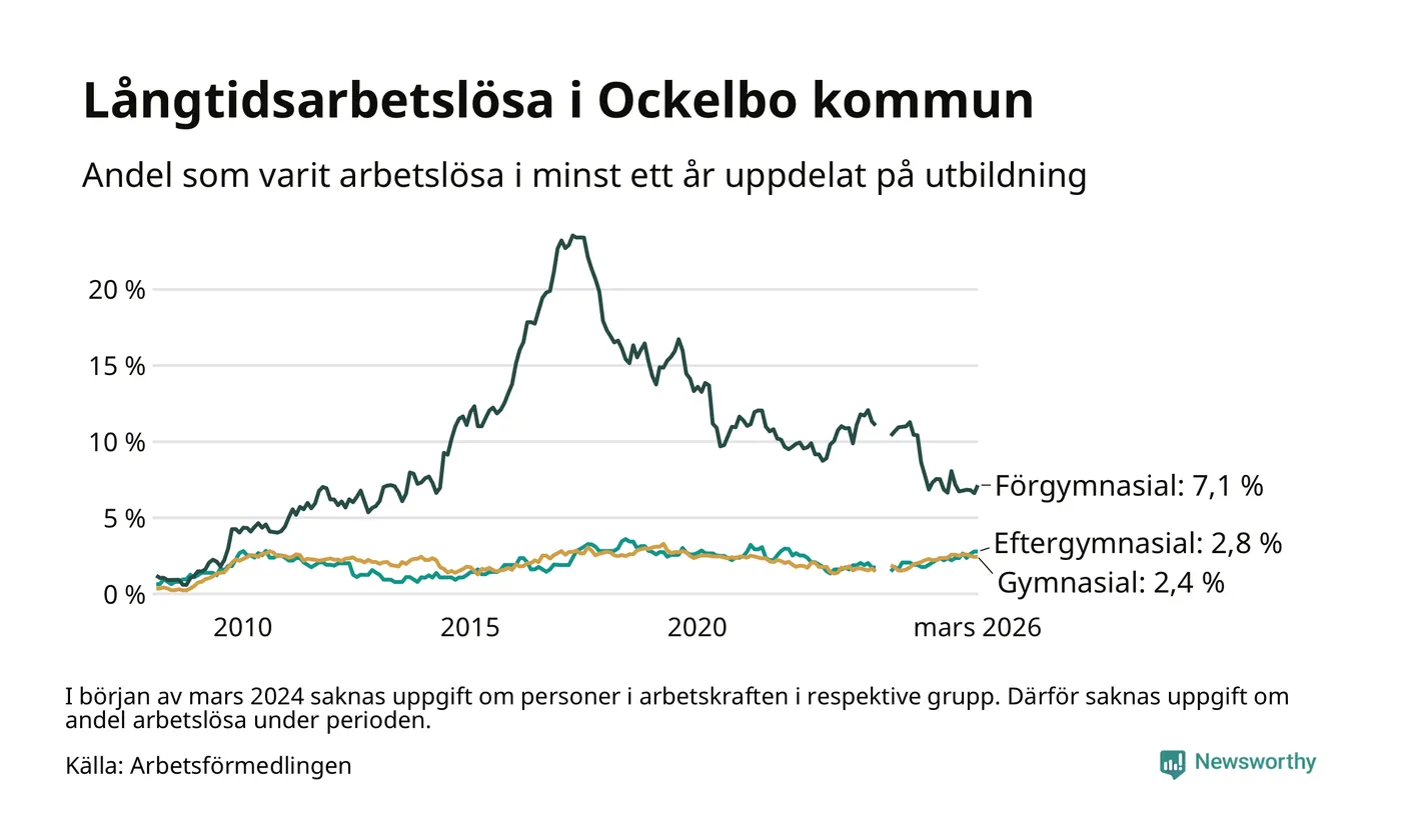 Andelen som varit utan arbete i minst ett år i Ockelbo var högre i mars jämfört med samma månad för ett år sedan. Det visar Arbetsfömedlingens senaste månadsstatistik.