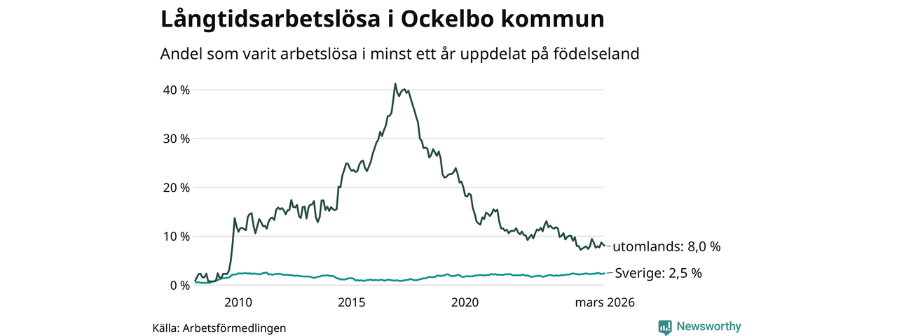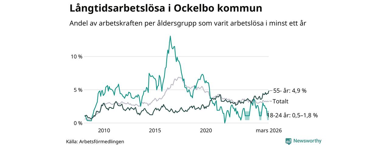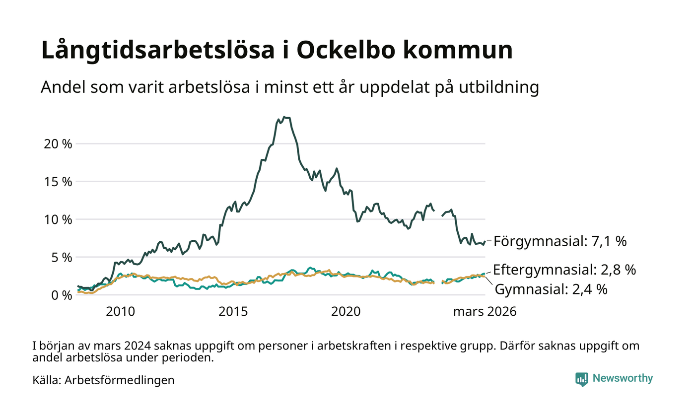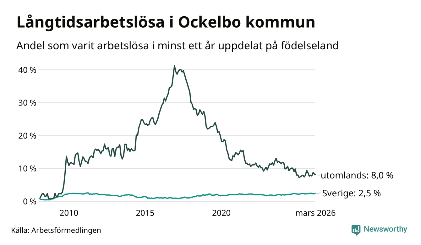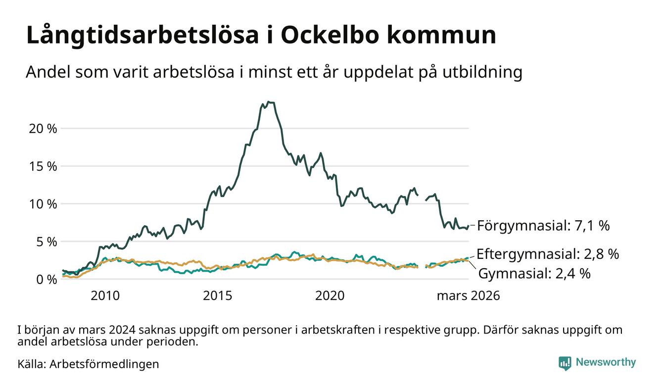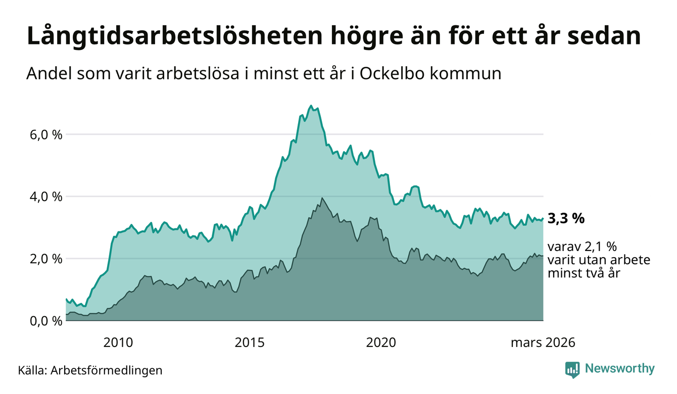 Andelen som varit utan arbete i minst ett år i Ockelbo var högre i mars jämfört med samma månad för ett år sedan. Det visar Arbetsfömedlingens senaste månadsstatistik.