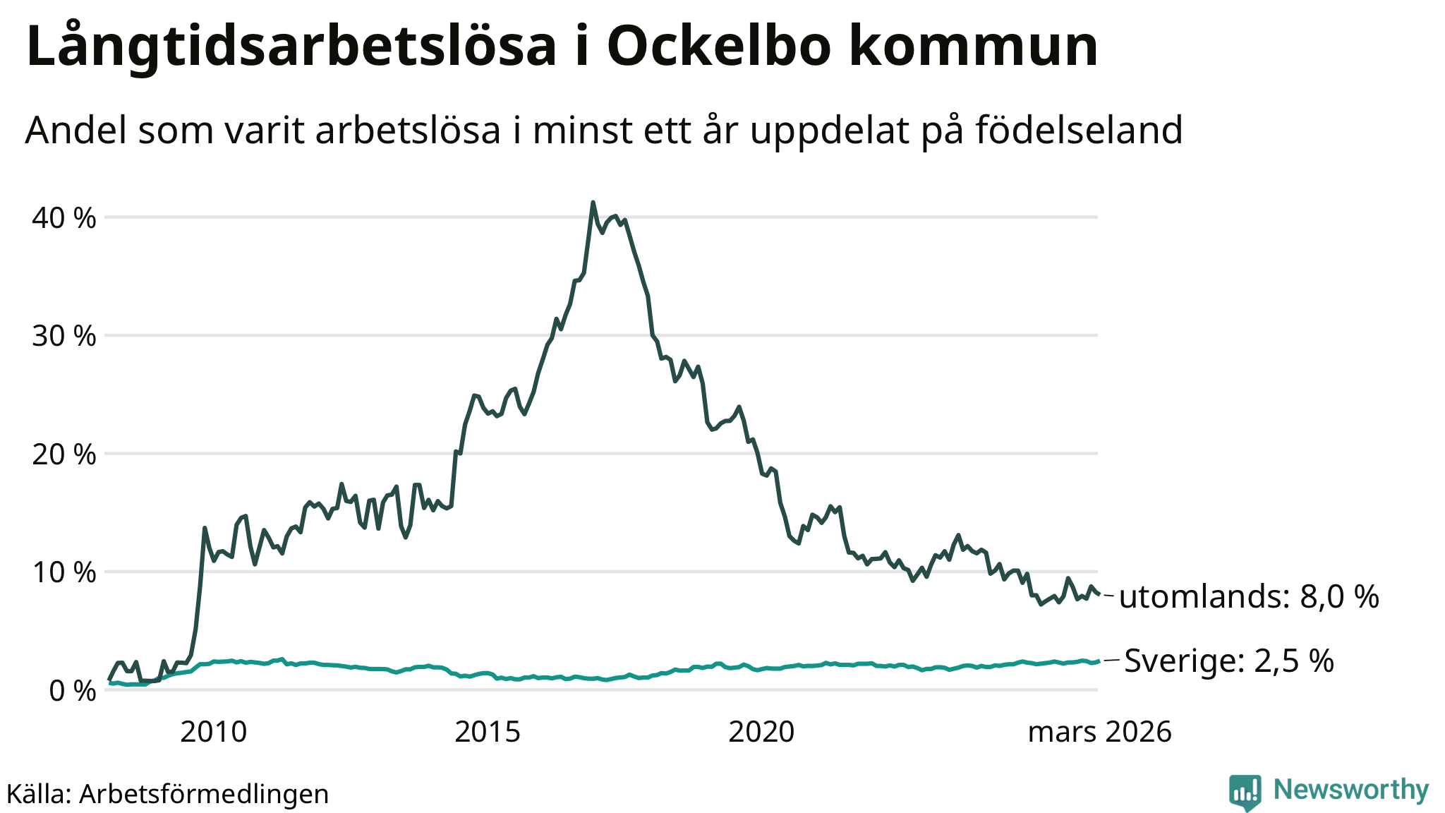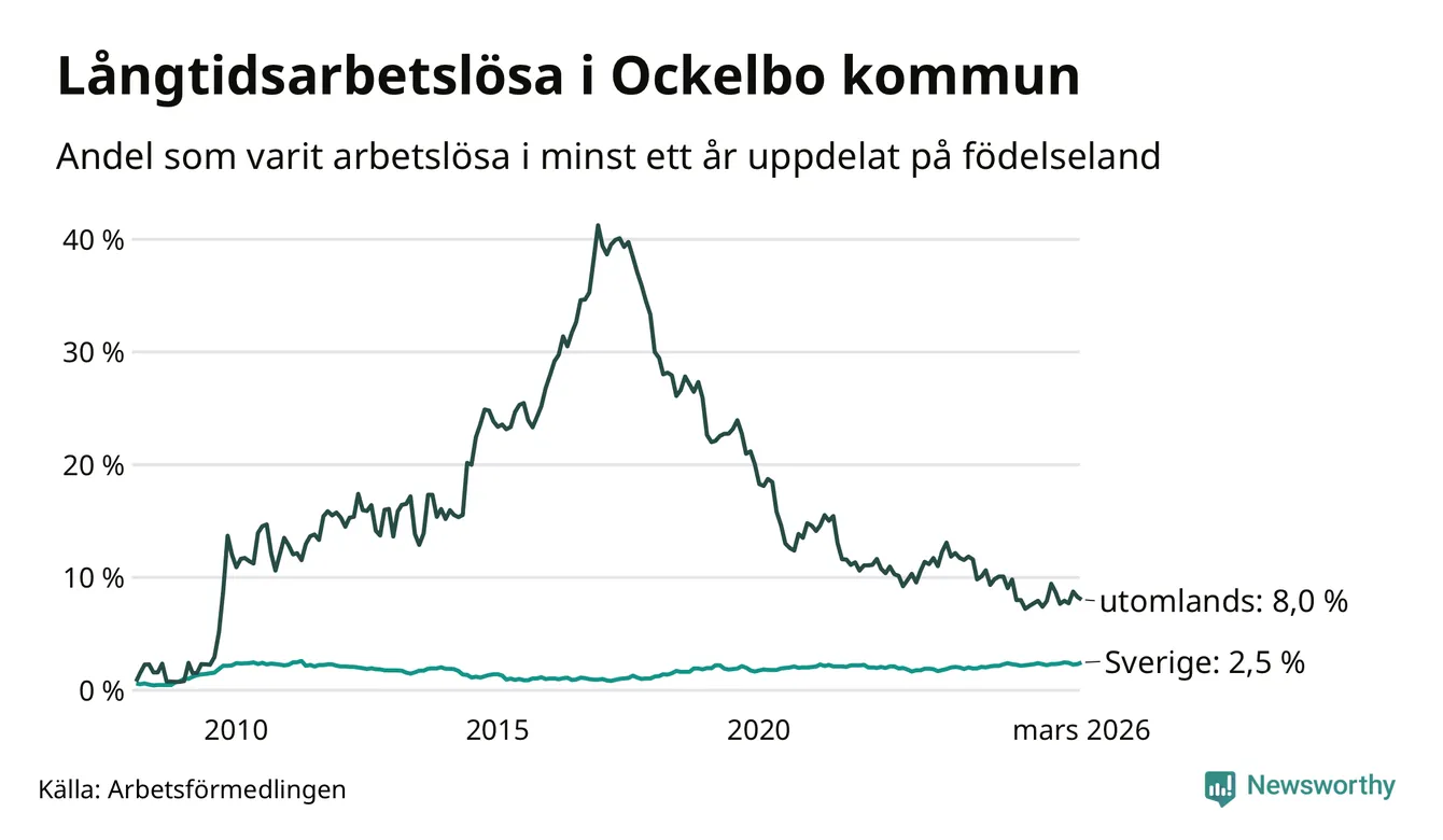 53 av de långtidsarbetslösa i Ockelbo är födda i Sverige, medan 31 är födda utomlands. Det innebär att långtidsarbetslösheten bland Sverigefödda är 2,5 procent, medan den är tre gånger så hög – 8,0 procent – bland födda utomlands. Även i riket som helhet är arbetslösheten högre bland utrikesfödda.
