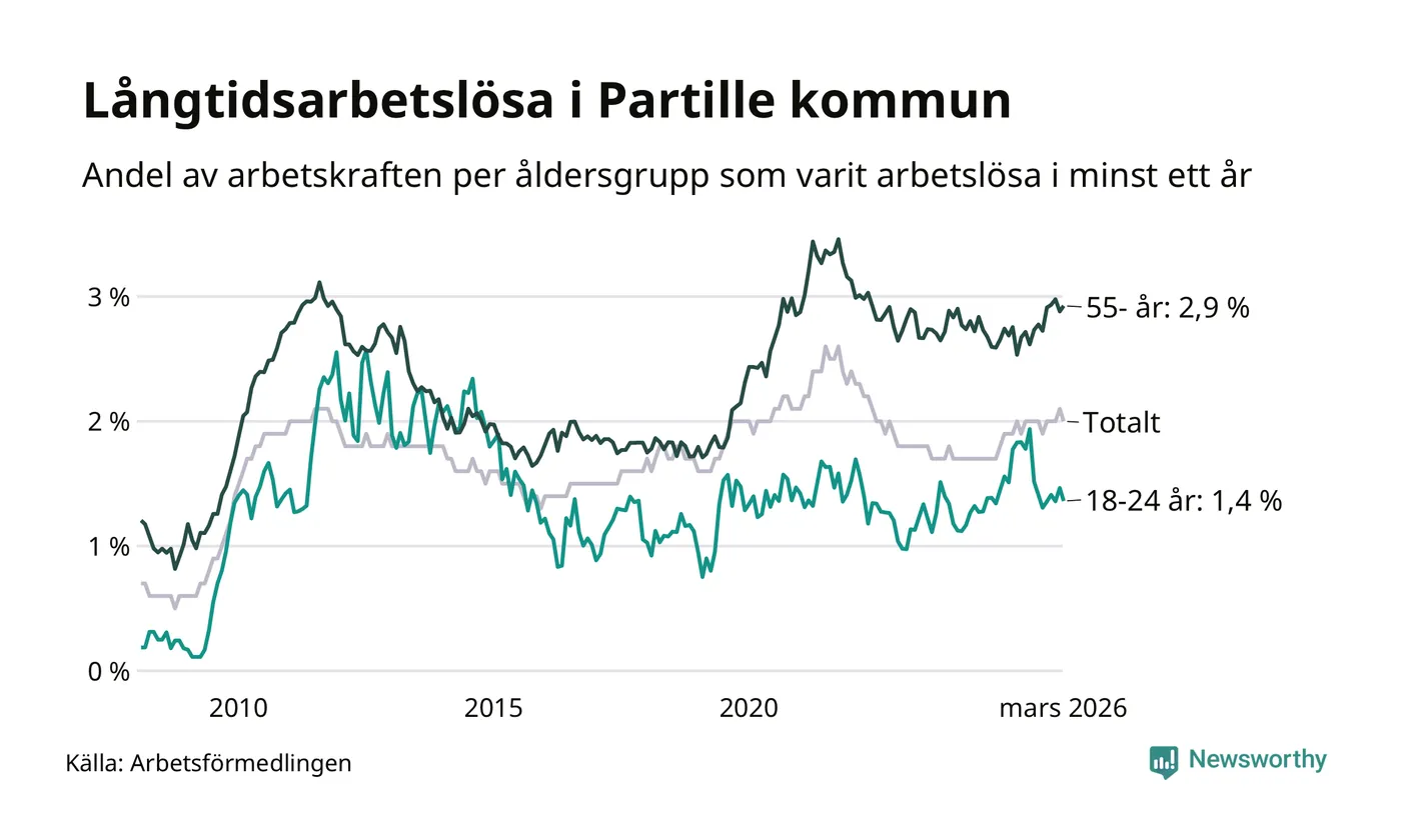 Av de 434 personerna som varit arbetslösa i mer än ett år i Partille kommun är 124 personer mellan 55 och 661 år och 26 är mellan 18 och 24 år. För den äldre gruppen är andelen arbetslösa 2,9 procent medan den i den yngre gruppen är 1,4 procent. Även i riket som helhet är långtidsarbetslösheten högre i gruppen äldre.
