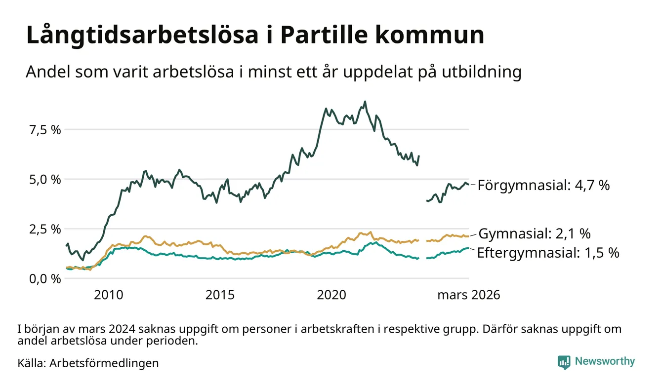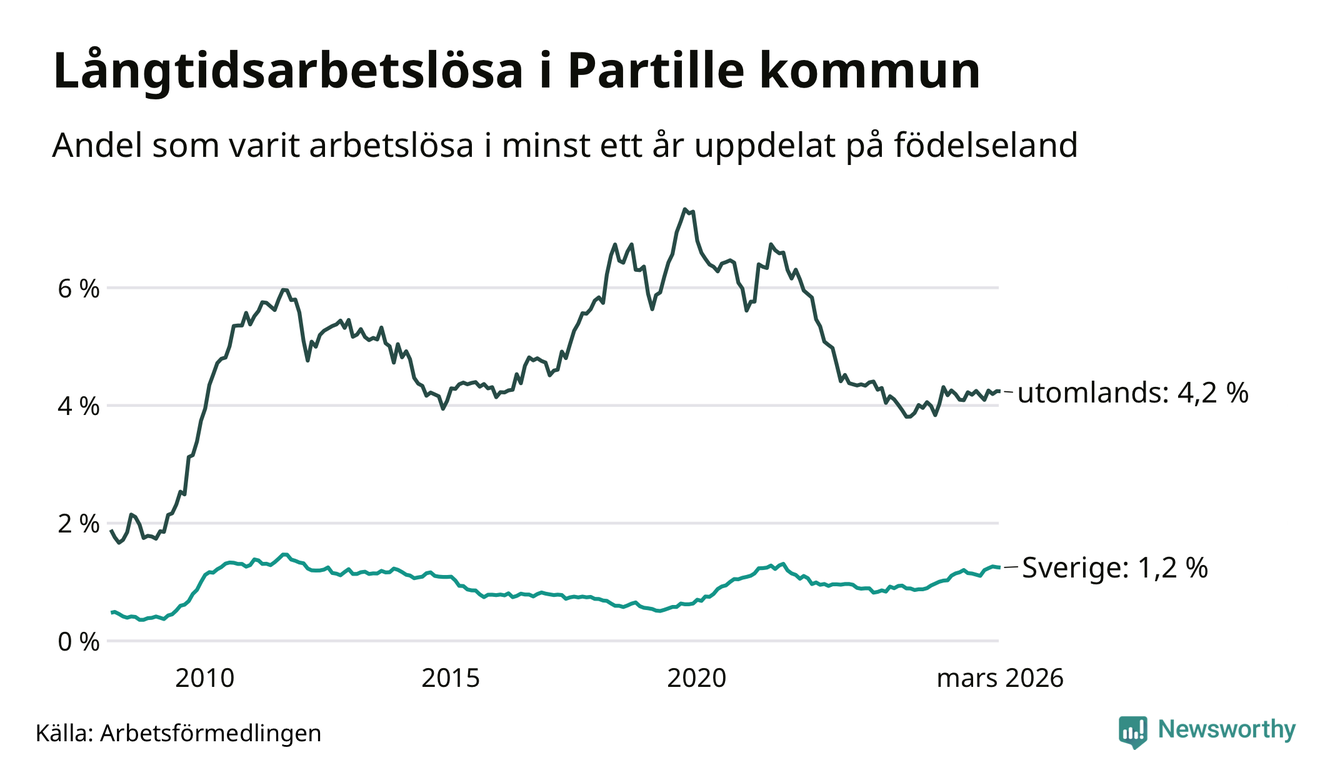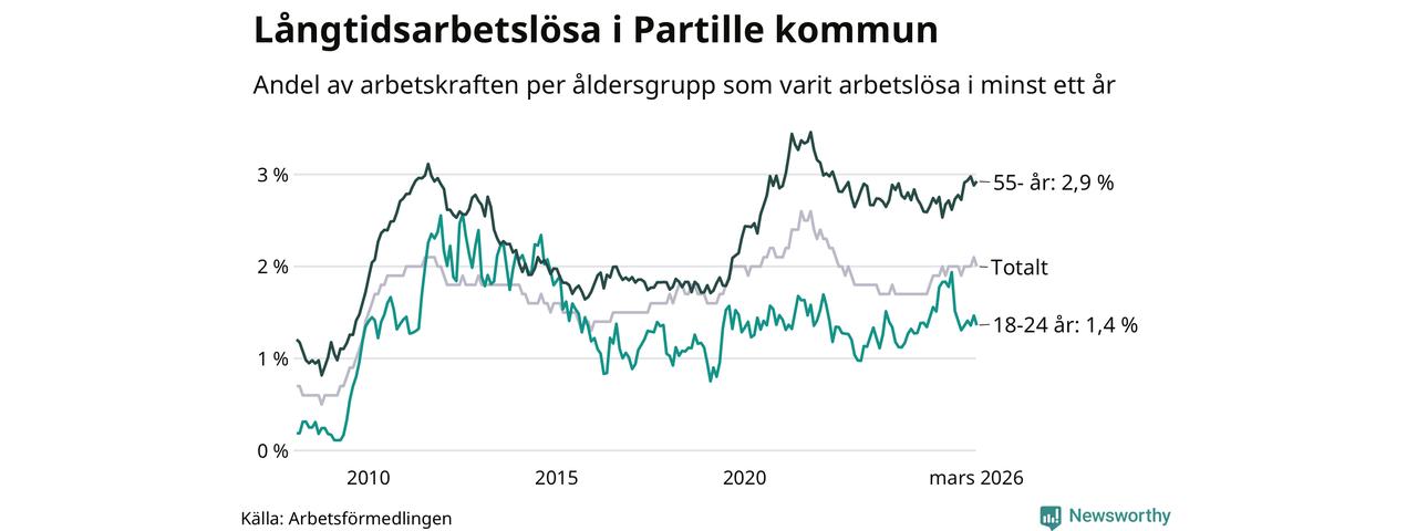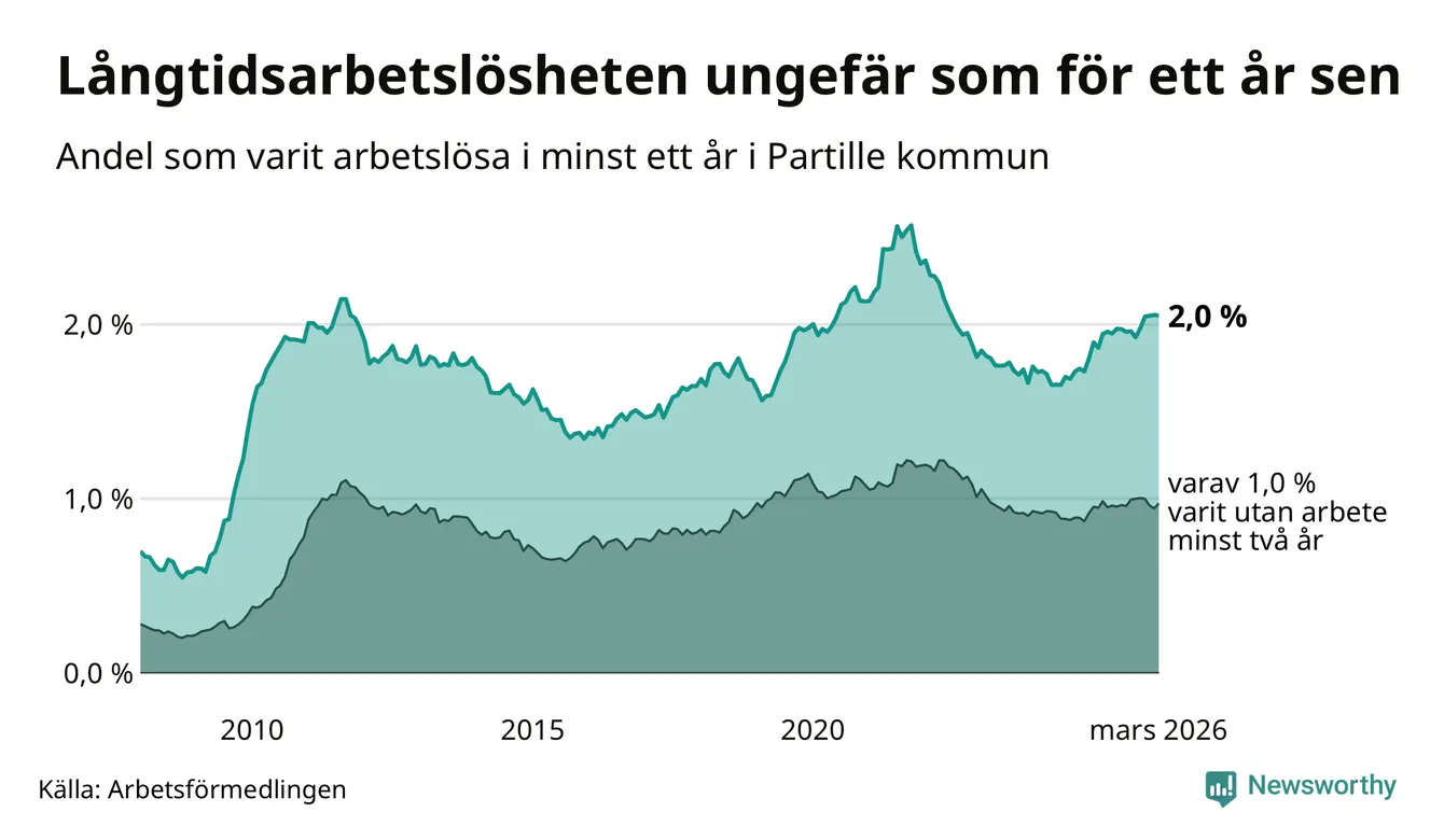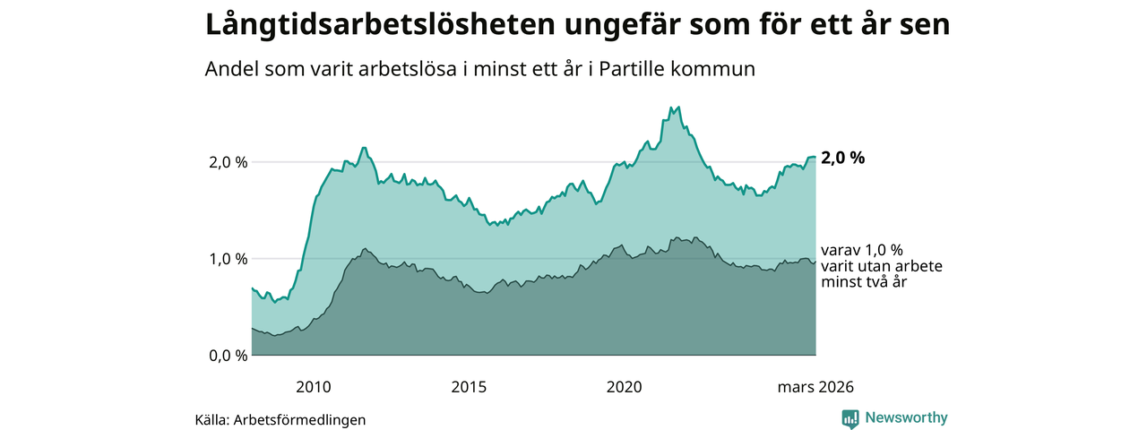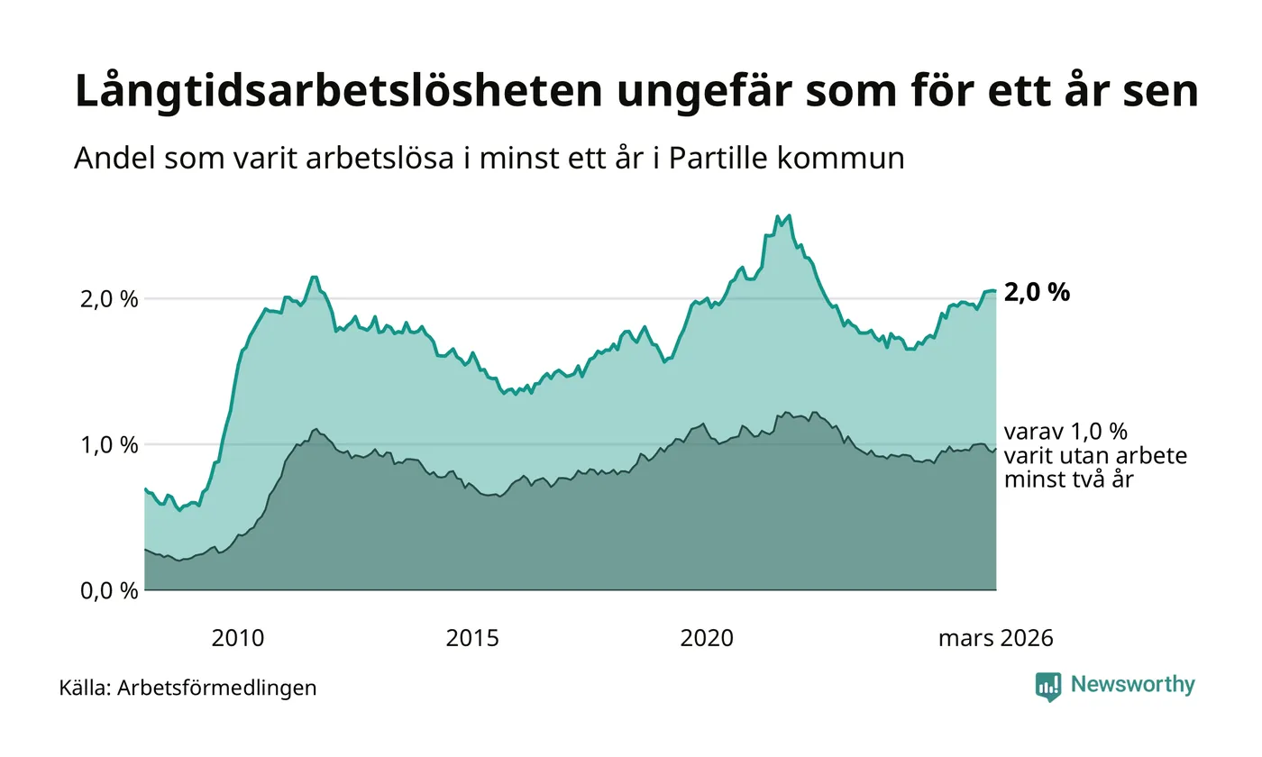 I mars hade 434 Partillebor varit arbetslösa i minst ett år, vilket är en färre än månaden innan. Det är den första månaden sedan oktober 2025 som antalet arbetslösa minskar. 434 personer motsvarar 2,0 procent av arbetskraften i kommunen – andelen långtidsarbetslösa är ungefär på samma nivå som för ett år sedan.