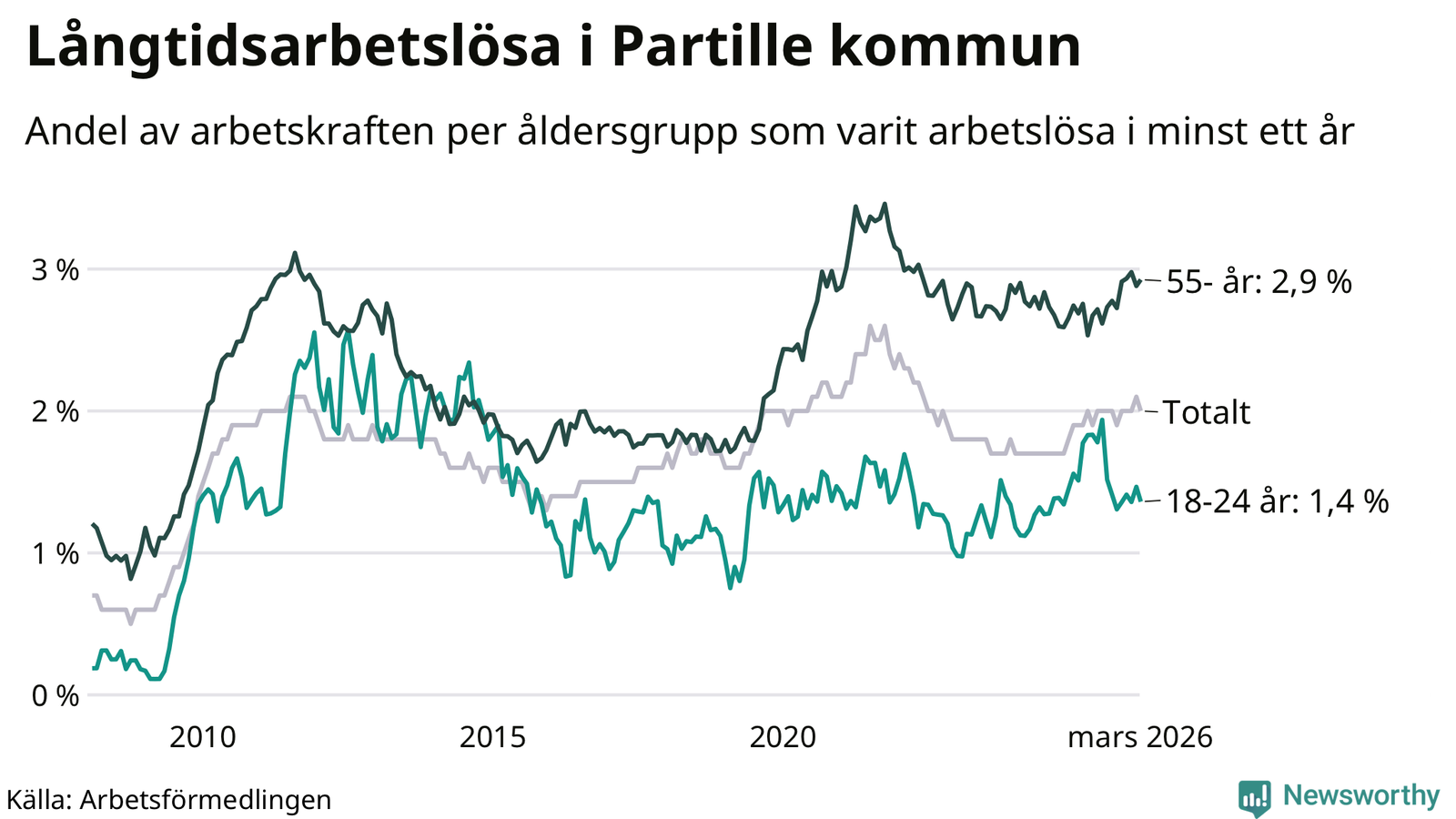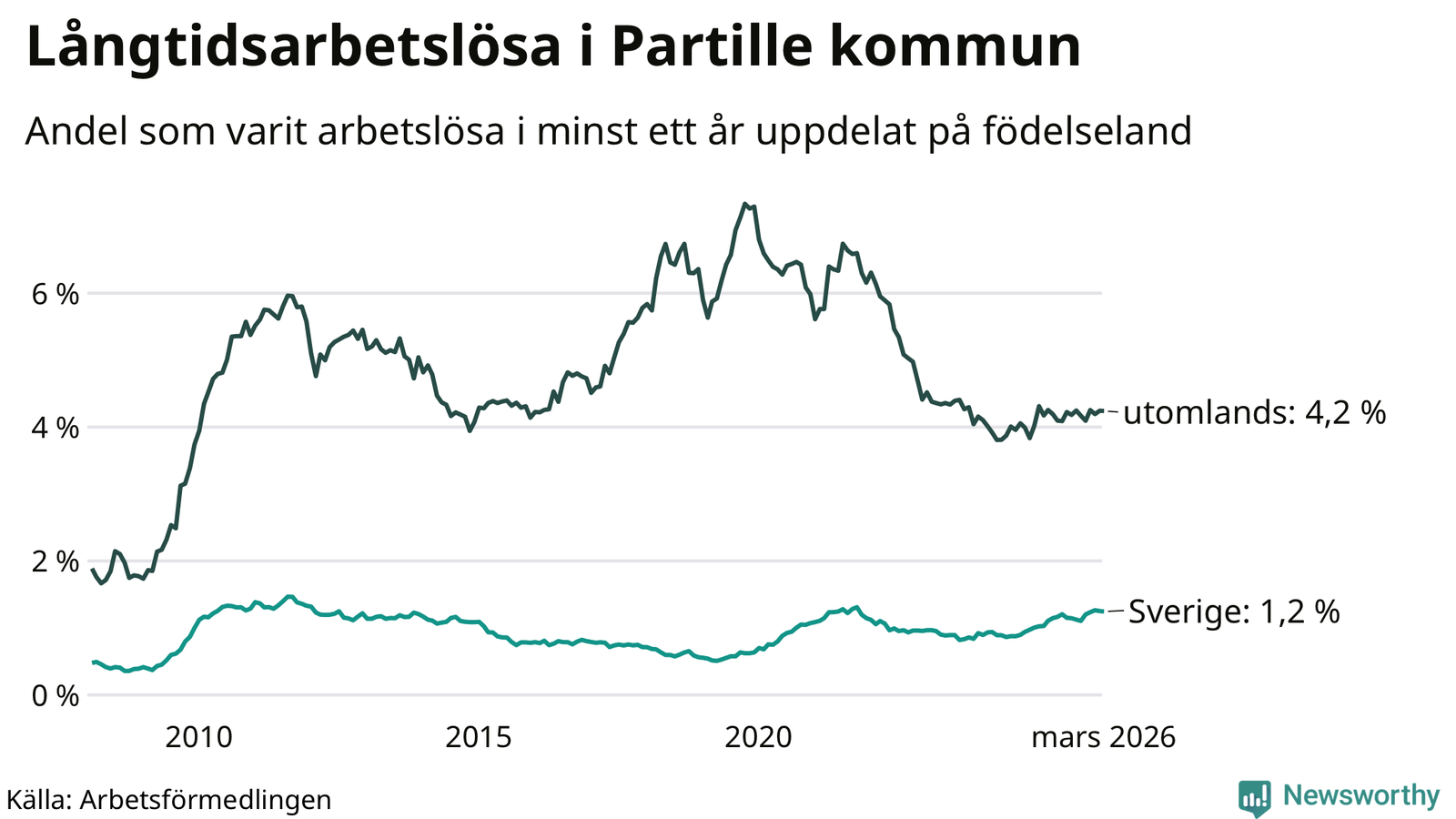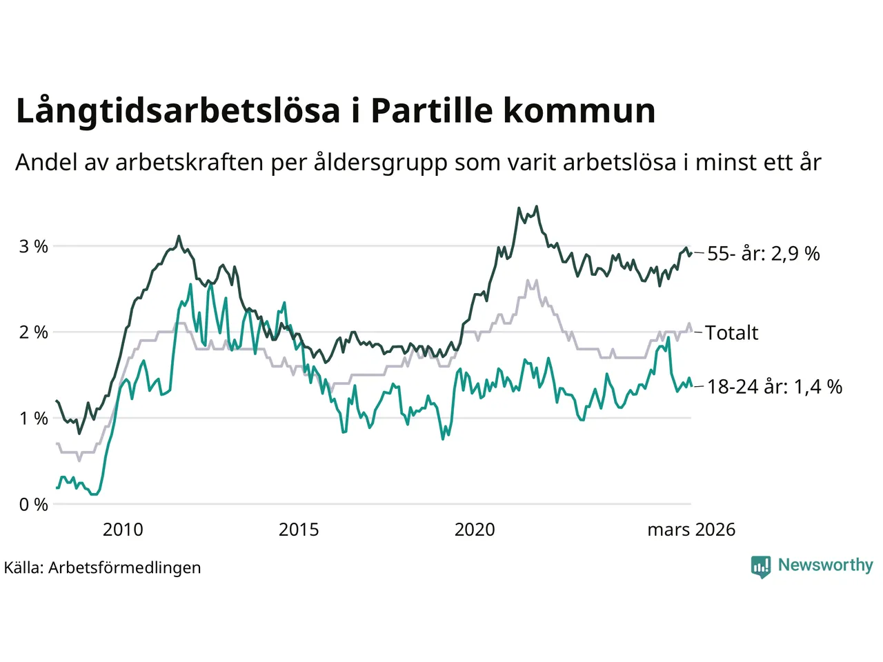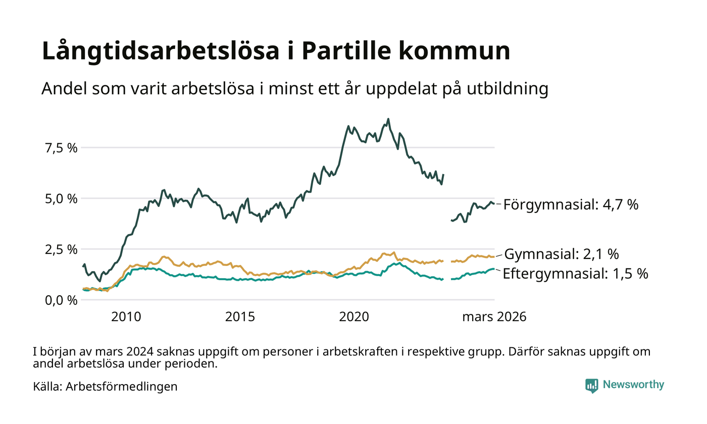 I mars hade 434 Partillebor varit arbetslösa i minst ett år, vilket är en färre än månaden innan. Det är den första månaden sedan oktober 2025 som antalet arbetslösa minskar. 434 personer motsvarar 2,0 procent av arbetskraften i kommunen – andelen långtidsarbetslösa är ungefär på samma nivå som för ett år sedan.