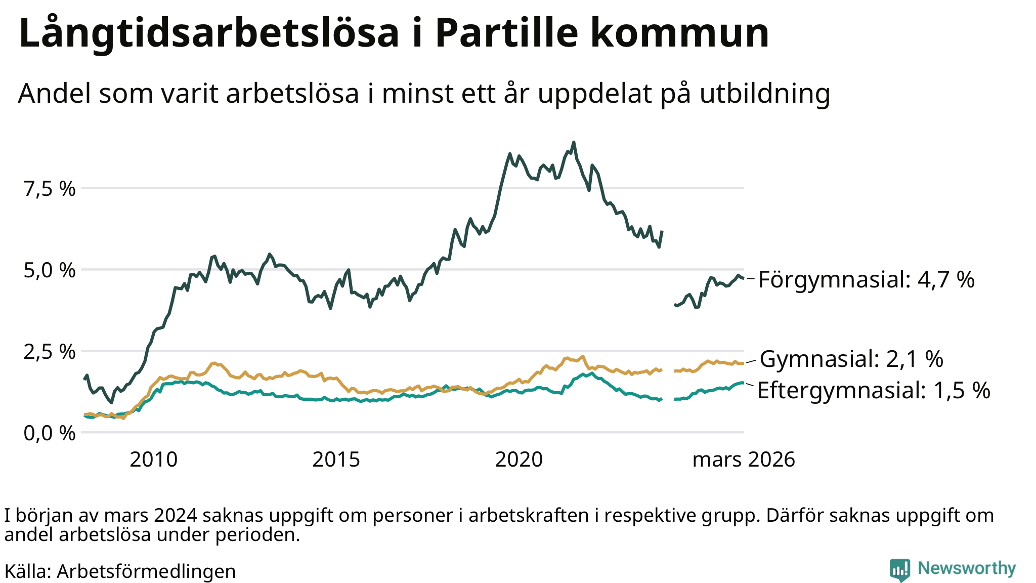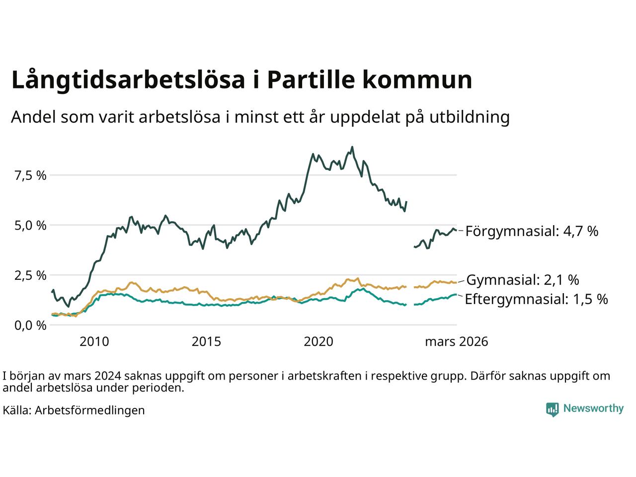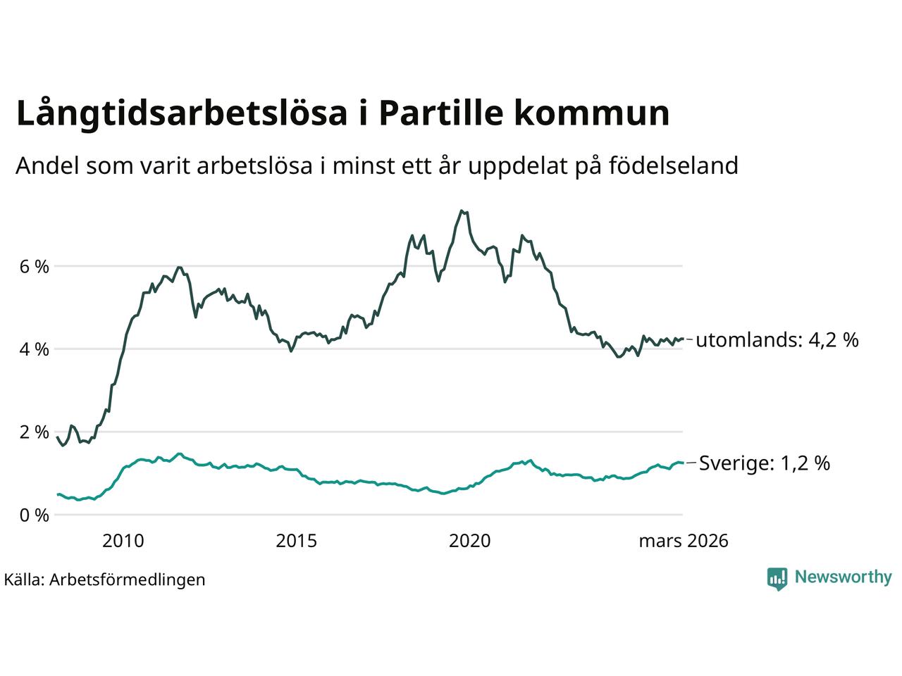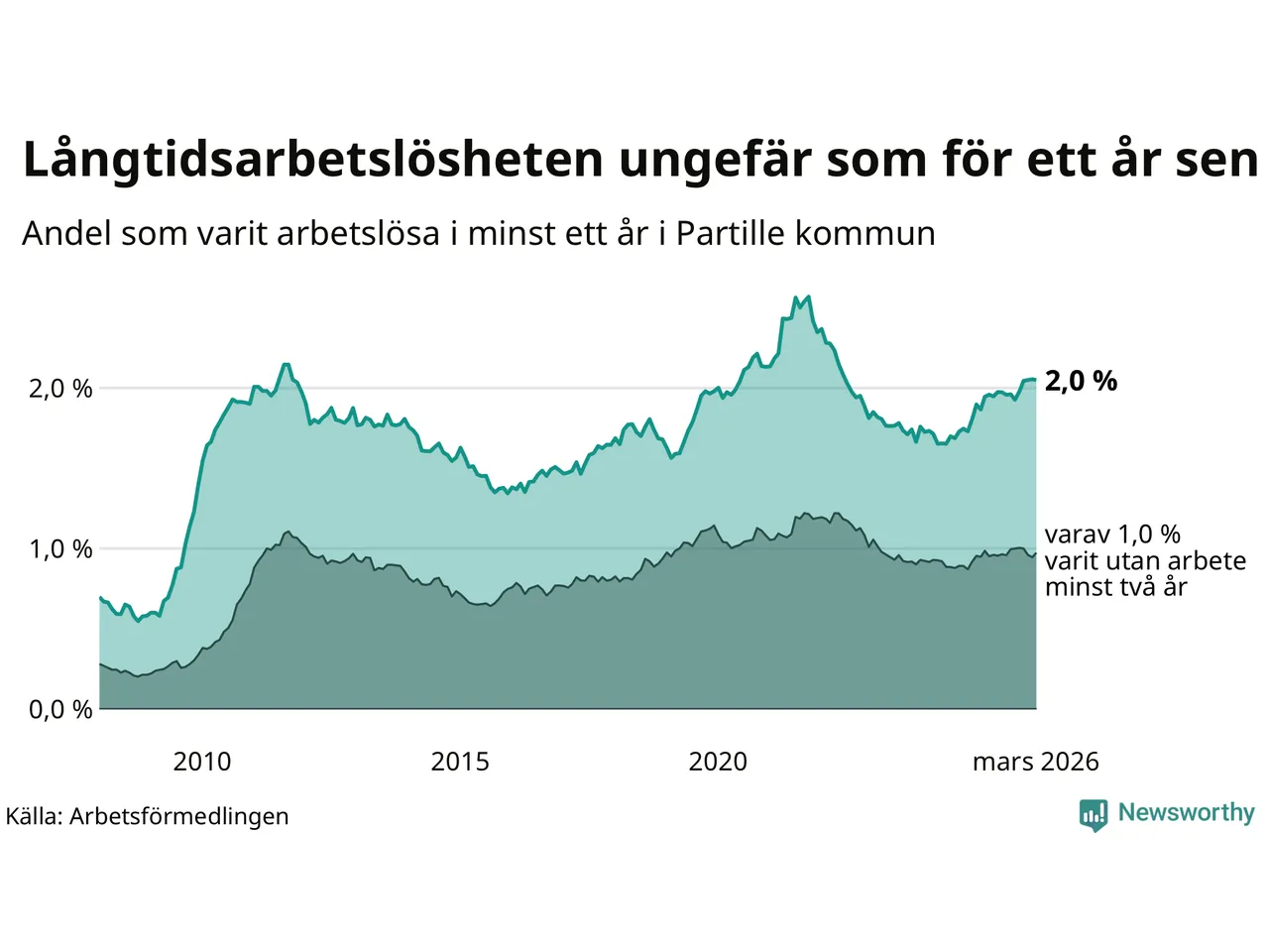 I mars hade 434 Partillebor varit arbetslösa i minst ett år, vilket är en färre än månaden innan. Det är den första månaden sedan oktober 2025 som antalet arbetslösa minskar. 434 personer motsvarar 2,0 procent av arbetskraften i kommunen – andelen långtidsarbetslösa är ungefär på samma nivå som för ett år sedan.
